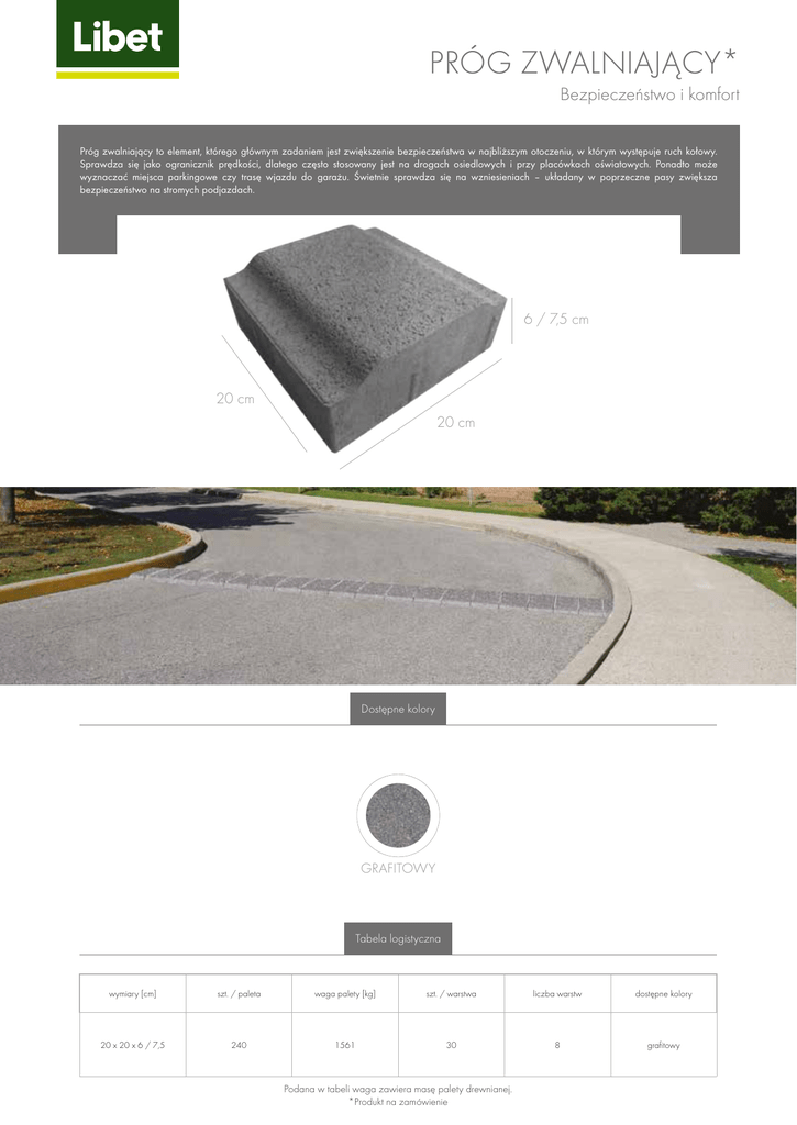 PRÓG ZWALNIAJĄCY* Bezpieczeństwo i komfort Próg zwalniający to element, którego głównym zadaniem jest zwiększenie bezpieczeństwa w najbliższym otoczeniu, w którym występuje ruch kołowy. Sprawdza się jako ogranicznik prędkości, dlatego często stosowany jest na drogach osiedlowych i przy placówkach oświatowych. Ponadto może wyznaczać miejsca parkingowe czy trasę wjazdu do garażu. Świetnie sprawdza się na wzniesieniach – układany w poprzeczne pasy zwiększa bezpieczeństwo na stromych podjazdach. 6 / 7,5 cm 20 cm 20 cm Dostępne kolory GRAFITOWY Tabela logistyczna wymiary [cm] szt. / paleta waga palety [kg] szt. / warstwa liczba warstw dostępne kolory 20 x 20 x 6 / 7,5 240 1561 30 8 grafitowy Podana w tabeli waga zawiera masę palety drewnianej. *Produkt na zamówienie PRÓG ZWALNIAJĄCY* Sugerowane sposoby ułożenia wzór 1 Zgodność z Normą PN-EN 1338:2003/AC:2006 J/M szt. Waga [kg/m2] lub [kg/szt] 6,4 Wymiar poszczególnych elementów wg katalogu producenta Faza z fazą Rodzaj powierzchni stempla powierzchnia płaska Struktura betonu jednorodna Sposób obróbki nie dotyczy Klasa betonu nie dotyczy Wytrzymałość charakterystyczna na rozciąganie przy rozłupywaniu [MPa] ≥ 3,6 Wytrzymałość charakterystyczna na zginanie [Mpa] nie dotyczy Charakterystyczne obciążenie niszczące [kN] nie dotyczy Odporność na warunki atmosferyczne klasa 3 ozn. D Odporność na ścieranie klasa 4 ozn. I Nasiąkliwość [%] ≤6 Wymiary nominalne - dopuszczalne odchyłki [mm] długość szerokość grubość ±2 ±2 ±3 Wymiary nominalne - przekątne [mm] nie dotyczy Odporność na poślizg/poślizgnięcie zadawalająca Trwałość zadawalająca Reakcja na ogień A1 Przeznaczenie i zakres stosowania (opisowo) kostka jest przeznaczona do budowy nawierzchni drogowych dla ruchu lekkiego, w tym do nawierzchni placów, parkingów i podjazdów dla samochodów osobowych, do ciągów ruchu pieszego zgodnie z odrębnymi przepisami oraz w zastosowaniach, w których zadeklarowane parametry techniczne wyrobu są wystarczające UWAGI nie dotyczy Ze względu na technikę druku, rzeczywiste kolory produktów mogą się różnić od prezentowanych na zdjęciach. Powyższa oferta ma charakter informacyjny i nie stanowi oferty handlowej w rozumieniu art. 66 §1 kodeksu cywilnego.