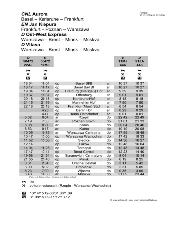 Horaire 13.12.2009-11.12.2010 CNL Aurora Basel – Karlsruhe – Frankfurt EN Jan Kiepura Frankfurt – Poznan – Warszawa D Ost-West Express Warszawa – Brest – Minsk – Moskva D Vltava Warszawa – Brest – Minsk – Moskva D 50472 22AJ D 50472 12MJ D 11MJ 446 D 21JA 446 y r "- y r ", y r ", y r "- 18 04 18 17 19 04 19 37 20 18 21 16 22 18 18 04 18 17 19 04 19 37 20 18 21 16 22 18 4 23 4 47 6 04 7 33 8 27 9 17 10 35 13 00 13 58 10 37 10 27 9 39 9 01 8 18 7 50 6 54 0 29 0 01 22 42 21 01 20 04 19 19 17 55 17 42 14 36 12 48 12 48 12 23 8 04 6 19 3 11 2 31 0 35 21 09 10 37 10 27 9 39 9 01 8 18 7 50 6 54 0 29 0 01 22 49 21 33 20 46 20 08 18 45 18 33 16 27 16 04 14 48 14 40 10 14 8 25 5 42 5 05 3 09 23 44 6 02 7 19 8 08 8 53 10 05 10 47 11 52 12 14 14 04 17 47 19 58 21 55 0 31 3 00 5 23 8 48 15 25 17 41 21 54 23 46 2 34 5 02 7 00 10 33 dp dp dp dp dp dp dp dp dp ar ar ar ar ar dp dp dp dp dp dp dp dp dp dp ar Basel SBB Basel Bad Bf Freiburg (Breisgau) Hbf Offenburg Karlsruhe Hbf Mannehim Hbf Frankfur (Main) Süd Berlin Hbf Berlin Ostbahnhof Rzepin Poznan Glovni Konin Kutno Warszawa Centralna Warszawa Wschodnia Siedlce Lukow Terespol Brest Central Baranovichi Centralyne Minsk Orscha Central Smolensk Wjasma Moskva ar ar ar ar ar ar ar ar ar dp dp dp dp dp dp dp dp dp dp dp dp dp dp dp dp L'aller se lit de haut en bas – le retour se lit de bas en haut x r lits voiture restaurant (Rzepin - Warszawa Wschodnia) ", "- 13/14/15.12-30/31.08/1.09 31.08/1/2.09-11/12/13.12 T www.entrain.ch - sous réserve de modifications