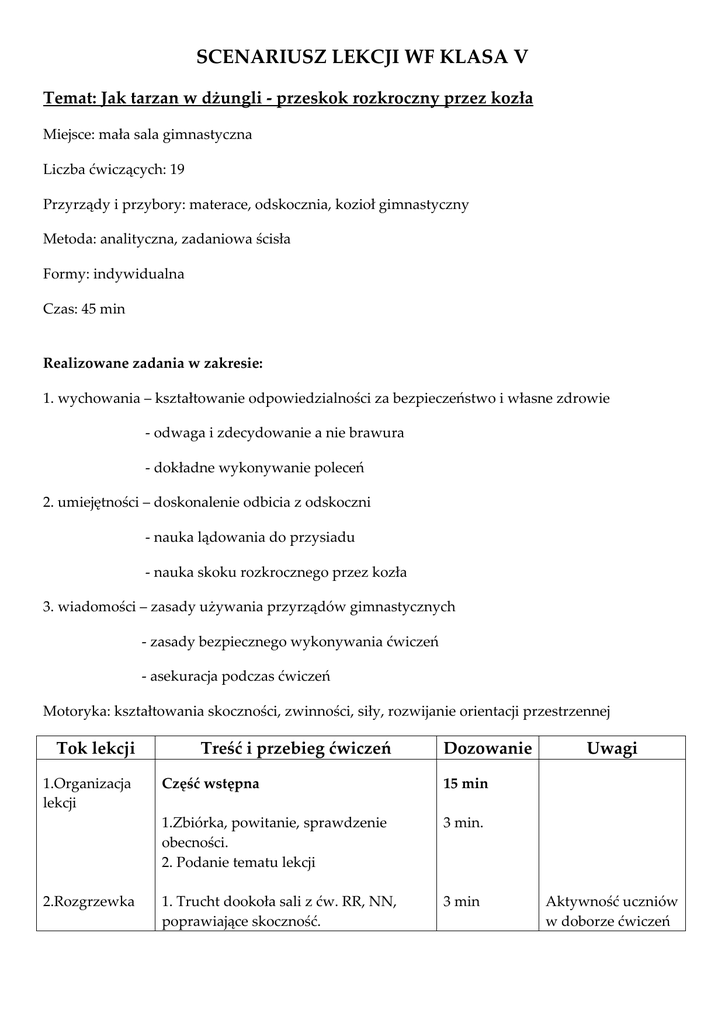 SCENARIUSZ LEKCJI WF KLASA V Temat: Jak tarzan w dżungli - przeskok rozkroczny przez kozła Miejsce: mała sala gimnastyczna Liczba ćwiczących: 19 Przyrządy i przybory: materace, odskocznia, kozioł gimnastyczny Metoda: analityczna, zadaniowa ścisła Formy: indywidualna Czas: 45 min Realizowane zadania w zakresie: 1. wychowania – kształtowanie odpowiedzialności za bezpieczeństwo i własne zdrowie - odwaga i zdecydowanie a nie brawura - dokładne wykonywanie poleceń 2. umiejętności – doskonalenie odbicia z odskoczni - nauka lądowania do przysiadu - nauka skoku rozkrocznego przez kozła 3. wiadomości – zasady używania przyrządów gimnastycznych - zasady bezpiecznego wykonywania ćwiczeń - asekuracja podczas ćwiczeń Motoryka: kształtowania skoczności, zwinności, siły, rozwijanie orientacji przestrzennej Tok lekcji 1.Organizacja lekcji 2.Rozgrzewka Treść i przebieg ćwiczeń Dozowanie Część wstępna 15 min 1.Zbiórka, powitanie, sprawdzenie obecności. 2. Podanie tematu lekcji 3 min. 1. Trucht dookoła sali z ćw. RR, NN, poprawiające skoczność. 3 min Uwagi Aktywność uczniów w doborze ćwiczeń 3. Ćwiczenia kształtujące skoczność, zwinność, siłę, orientację przestrzenną 2.Ćw. tułowia we wszystkich płaszczyznach. 3. Ćw. Rozciągające mięśni.NN, pleców 4 min Część główna 25 min 1. Doskonalenie naskoku na odskocznię - odbicia od odskoczni z oparciem RR na koźle z asekuracją - nauka lądowania do przysiadu 2 kolejki 2. Nauka przeskoku rozkrocznego przez kozła z asekuracją nauczyciela - odbicie od odskoczni z oparciem RR na koźle - przeskok rozkroczny z małego nabiegu - przeskok z rozbiegu z narastającym tempem, uwaga na wyprostowanie NN przy przeskoku 4. Ćwiczenia uspokajające 5. Zakończenie lekcji 5 min 2 kolejki Zwrócenie uwagi na poprawność wykonania każdego ćwiczenia. Po opanowaniu przez wszystkich ćwiczących przejść dalej. 2 kolejki 2 kolejki 2 kolejki Część końcowa 5 min - zebranie sprzętu - marsz , ćwiczenia oddechowe ze wznosem RR - omówienie ćwiczeń sprawiających najwięcej trudności - ocena postępów na lekcji - pożegnanie 2 min 3 min Asekuracja nauczyciela i odległość odskoczni od kozła uzależniona od umiejętności i możliwości ćwiczących Scenariusz lekcji – układ taneczny walca angielskiego – łączenie poznanych figur w układ taneczny. Przedmiot: Klasa: Miejsce ćwiczeń: Liczba ćwiczących: Przybory: Metody: Czas: wychowanie fizyczne klasa IV sala gimnastyczna 19 magnetofon, płyty naśladowcza – ścisła, ekspresji ruchowej 45 minut CELE LEKCJI: Umiejętności: Wykonanie kroku podstawowego i krótkiego układu walca angielskiego. Wiadomości: Zasady kulturalnego zachowania się w czasie zabaw tanecznych. Motoryczność: Kształtowanie koordynacji ruchowej, poczucia rytmu, ogólnej sprawności fizycznej. Akcent wychowawczy: Dobre maniery, styl i szyk zachowania się w tańcu . TOK LEKCJI: Część wstępna (10 min.): 1) czynności organizacyjno porządkowe: powitanie, sprawdzenie gotowości do zajęć, podanie tematu zajęć, motywacja do ćwiczeń 2) rozgrzewka: – radosny ruch przy muzyce do utworu zespołu Talking Hades – Slippery People oraz utwór zespołu Gipsy Kings – Volare. Część główna (30 min.): Powtórzenie poznanych kroków tanecznych 1) dzieci ustawione w liniach- powtórzenie kroku podstawowego po kwadracie bez muzyki, później z muzyką 2) powtórzenie kroku zmiennego do przodu , w tył (bez muzyki, z muzyką) 3) postawa taneczna: tancerz i tancerka ustawiają się naprzeciw siebie w postawie naturalnej wyprostowanej, blisko siebie, tancerz obejmuje tancerkę prawym ramieniem, umieszczając 1 prawą dłoń pod jej lewą łopatką, tancerka opiera lewą dłoń na prawym ramieniu tancerza, pozostałe ręce są połączone i wzniesione na wysokości głowy partnerki 4) powtórzenie kroku podstawowego w parach i kroku zmiennego najpierw bez muzyki, później z muzyką 5) nauka figury obrotu w prawo: najpierw uczymy kroków w rozsypce powtarzając kroki za prowadzącym, po opanowaniu uczymy kroków w parach najpierw bez muzyki, później z muzyką - przypomnienie pracy nóg: krok w przód stawiamy od pięty krok w tył stawiamy od palców krok boczny stawiamy na podeszwie łącząc nogę z nogą , stajemy na palcach 6) nauka obrotu w prawo KROK 1: Tancerz: prawa noga w przód, twarzą ukośnie do ściany Tancerka: lewa noga w tył, plecami ukośnie do ściany KROK 2: Tancerz: lewa noga w bok, plecami ukośnie do środka sali Tancerka: prawa noga w bok, twarzą ukośnie do środka sali KROK 3: Tancerz: dosuwa prawą nogę do lewej, plecami do linii tańca Tancerka: dosuwa lewą nogę do prawej, twarzą do linii tańca KROK 4: Tancerz: lewa noga w tył, plecami do linii tańca Tancerka: prawa noga w przód, twarzą do linii tańca KROK 5: Tancerz: prawa noga w bok, twarzą do środka sali Tancerka: lewa noga w bok, plecami do środka sali KROK 6: Tancerz: dosuwa lewą nogę do prawej, twarzą ukośnie do środka sali Tancerka: dosuwa prawą nogę do lewej, plecami ukośnie do środka Sali 7) próby łączenia poznanych elementów tańca w układ taneczny: 2 kroki po kwadracie 4 kroki zmienne do przodu 2 kroki po kwadracie 4 kroki zmienne do tyłu 4 kroki - obrót w prawo 8) wybór najlepiej tańczącej pary – krótki konkurs tańca CZĘŚĆ KOŃCOWA (5 min.): 1) podsumowanie zajęć, zainspirowanie uczniów do samodzielnego doskonalenia umiejętności nabytych podczas lekcji, ocenienie najlepszej pary 2) utrwalenie wiadomości dotyczących podziału tańców towarzyskich, pożegnanie z grupą. 2 SCENARIUSZ LEKCJI FAKULTET SPORTOWY – MINI PIŁKA SIATKOWA TEMAT: Doskonalenie odbić piłki sposobem górnym i dolnym, w przód i w tył. Przebicie piłki na boisko przeciwnika. Miejsce: hala sportowa Liczba ćwiczących: 17 Przyrządy i przybory: 17 piłek siatkowych, słupki do siatki i siatka Metoda: pogadanka, pokaz, instruowanie, naśladowcza – 