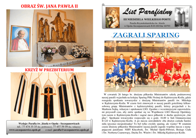 OBRAZ ŚW. JANA PAWŁA II List Parafialny III NIEDZIELA WIELKIEGO POSTU Parafia Rzymskokatolicka św. Józefa w Opolu–Szczepanowicach /8.03.2015/nr 10/793 KRZYŻ W PREZBITERIUM Wydaje: Parafia św. Józefa w Opolu - Szczepanowicach tel.: 77 474 35 35 (ks. proboszcz), 77 457 59 59 (ks. wikarzy) www.szczepanowice.opole.pl e-mail: [email protected] W czwartek 26 lutego br. drużyna piłkarska Ministrantów szkoły podstawowej naszej parafii wyjechała na kolejny Sparing Piłki Nożnej do Kędzierzyna-Koźla, gdzie rozegrała spotkanie towarzyskie z drużyną Ministrantów parafii św. Mikołaja w Kędzierzynie-Koźlu. W czasie ferii zimowych w naszej parafii gościliśmy kilkuosobową grupę Ministrantów z kędzierzyńskiej parafii, którzy przyjechali z ks. Markiem Sojką, wikarym i opiekunem LSO. Zgodnie z wcześniejszymi zapowiedziami przyszedł czas, aby znów spotkać się we Wspólnocie LSO Diecezji Opolskiej, tym razem w Kędzierzynie-Koźlu i zagrać mecz piłkarski w duchu sportowym „fair play”. Spotkanie towarzyskie rozpoczęło się o godz. 16.00 w Sali Gimnastycznej II LO w Kędzierzynie-Koźlu. A po meczu zawodników obu drużyn czekała bardzo miła (pyszna) niespodzianka! To był tylko zwykły sparing, ale ważny! W ostatnim czasie drużyny piłkarskie Ministrantów naszej parafii zagrały wspólne mecze z następującymi parafiami: NSPJ Kluczbork, Św. Michał Opole-Półwieś, Bożego Ciała i Św. Norberta Czarnowąsy, Ducha Św. Winów i Św. Mikołaj Kędzierzyn-Koźle. P ORZĄDEK M SZY ŚW . I N ABOŻEŃSTW Ogłoszenia duszpasterskie – 8 MARZEC 2015 9 – 15 marzec 1. Dzisiaj III NIEDZ. W. POSTU 8.03.: PONIEDZIAŁEK – 9.03. 630 Za ++ rodziców Elżbietę i Manfreda Zelosko, pokr. Zelosko, Herz 1800 1) Za + ojca Maksymiliana Dziony, ++ rodziców Jana i Antoninę Mateja 2) WTOREK – 10.03. 630 Za + Michała Josek, ++ rodziców Josek, Gogolok, Melnik 1800 1) Za ++ rodziców Hildegardę i Teodora Jendryca, dziadków Rocha i Annę Janczyk 2) Do B. Op. w int. Zuzi i Karolka z ok. urodzin ŚRODA – 11.02. 630 Za ++ rodziców Józefa i Gertrudę Bartusz w 4 r. śm. 1800 1) Za ++ rodziców Aleksandrę i Eugeniusza Ryśnik, pokr. 2) CZWARTEK – 12.03. 630 Za ++ Helenę i Ignacego, dziadków, pokr. obu stron 1630 Droga Krzyżowa dla dzieci 1700 /Szk/ 1) Za + syna Ryszarda w kol. r. śm., ++ rodziców obu stron 2) PIĄTEK – 13.03. 630 Za + matkę Marię Rink oraz o bł. B. w rodzinie Broma 1730 Droga Krzyżowa dla dorosłych 1800 1) Do B. Op. w int. Tomasza Malaka w 11 r. urodzin 2) Do B. Op. w int. Józefy Siemion z ok. urodzin SOBOTA – 14.03. 630 Za ++ rodziców Józefa i Anastazję Kaleja, + ciotkę Annę Milek 1800 /Niedz/ 1) Za + męża i ojca Alojzego Baron 2) Za ++ rodziców Klarę i Stanisława Okos, teściów Martę i Alojzego, pokr. Okos, Langosz IV NIEDZIELA WIELKIEGO POSTU (LAETARE) – 15.03. 630 Za ++ rodziców Ignacego i Marię Honcza, 2 synów Gerarda i Karola 830 Za + Marię Knop 1000 /SUMA/ Za ++ rodziców Matyldę i Józefa Walecko, dziadków Machura, Walecko 30 11 Do B. Op. w int. Jolanty i Henryka Niestrój oraz dzieci Wojciecha i Matyldy 1515 Gorzkie Żale – kazanie pasyjne 1600 Za ++ rodziców Irenę i Czesława Bajor, dziadków obu stron a) LP i GN b) g. 10.30 w Katedrze Op. uroczysta Msza św. pontyfikalna pod przewodnictwem Ks. Bpa A. Czai na inaugurację działalności powołanej Kapituły Katedralnej, której celem będzie renowacja Katedry Opolskiej na 800-lecie w 2017 c) 10.00 Msza św. w int. KOBIET naszej parafii z ok. Dnia Kobiet. Wszystkim Paniom składamy serdeczne życzenia d) 15.15 (!) Gorzkie Żale i kazanie pasyjne e) jak już ogłaszaliśmy, dzisiaj po Mszach św. na prośbę Ojca Św. Franciszka zbiórka na Misyjne Dzieło Pomocy Misjonarzom. 2. W najbliższy czwartek 12.03. od g. 11.00 w Gogolinie organizujemy spotkanie modlitewno-rekreacyjne dla 150 sportowców NIEPEŁNOSPRAWNYCH woj. opolskiego. Prosimy o modlitwę w tej intencji. 3. Również w czwartek 12.03.: a) 16.30 – Droga Krzyżowa dla dzieci b) 17.00 – Msza św. szkolna z konkursem dla dzieci. 4. W piątek 13.03.: a) 17.30 – Droga Krzyżowa dla dorosłych b) 18.00 – Msza św. wieczorna c) nasz Wikary ks. Ł. Knieć wyjeżdża z młodzieżą kl. I gimn. przygotowującą się do Bierzmowania na Dni Skupienia. 5. W sobotę 14.03.: a) w godzinach przedpołudniowych nasi Ministranci rozniosą do Waszych domów i mieszkań wielkopostno-świąteczny numer naszego kwartalnika „Głos par. św. Józefa”. W nim m.in.: plan tegorocznych Rekolekcji Wielkopostnych oraz porządek świąteczny Mszy św. i aktualności parafialne. Prosimy zapoznać się z jego treścią b) nasz Wikary ks. A. Jankowski wyjeżdża z Lektorami na rozgrywki półfinałowe Diecezjalnych Mistrzostw Piłkarskich w Strzelcach Op. 6. Już dzisiaj ogłaszamy, że: a) w czwartek 19.03. uroczystość Św. Józefa, Oblubieńca NMP. Całodz. Adoracja Najśw. Sakr. b) w piątek 20.03. g. 18.00 Msza św. w int. Bractwa Św. Józefa Rejonu Opolskiego oraz spotkanie religijne członków Bractwa c) w sobotę 21.03. g. 18.00 rozpoczynają się parafialne Rekolekcje Wielkopostne, które potrwają do środy 25.03. włącznie. 7. Wolne int. Mszy św. w poniedziałek g. 18.00, środa 18.00, czwartek 17.00.