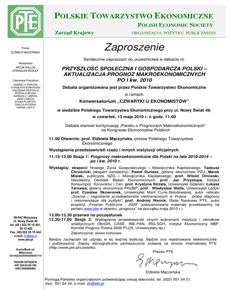 POLSKIE TOWARZYSTWO EKONOMICZNE POLISH ECONOMIC SOCIETY Zarząd Krajowy Prezes ELŻBIETA MĄCZYŃSKA ORGANIZACJA POŻYTKU PUBLICZNEGO Zaproszenie Serdecznie zapraszam do uczestnictwa w debacie nt. Wiceprezesi ARTUR POLLOK STANISŁAW RUDOLF Członkowie Prezydium ANDRZEJ S. BARCZAK STANISŁAWA BORKOWSKA WALDEMAR GRZYWACZ BOŻENA KLIMCZAK BARBARA Z. LIBERDA JÓZEF ŁOBOCKI BOGNA PILARCZYK DANUTA RUCIŃSKA ANDRZEJ SZPLIT PRZYSZŁOŚĆ SPOŁECZNA I GOSPODARCZA POLSKI – AKTUALIZACJA PROGNOZ MAKROEKONOMICZNYCH PO I kw. 2010 Debata organizowana jest przez Polskie Towarzystwo Ekonomiczne w ramach Konwersatorium „CZWARTKI U EKONOMISTÓW” w siedzibie Polskiego Towarzystwa Ekonomicznego przy ul. Nowy Świat 49, w czwartek, 13 maja 2010 r. o godz. 11:00 Debata stanowi kontynuację „Panelu o Prognozach Makroekonomicznych” na Kongresie Ekonomistów Polskich 11.00 Otwarcie: prof. Elżbieta Mączyńska, prezes Polskiego Towarzystwa Ekonomicznego Wystąpienia przedstawicieli rządu i innych instytucji oficjalnych 11.15-13.00 Sesja 1: Prognozy makroekonomiczne dla Polski na lata 2010-2014 – po I kw. 2010 r. Wystąpią: eksperci Nowego Życia Gospodarczego i Miesięcznika Kapitałowego: Tadeusz Chrościcki (ekspert niezależny); Paweł Duriasz, główny ekonomista PZU; Marek Misiak, publicysta NŻG i Miesięcznika Kapitałowego; prof. Witold Orłowski, Niezależny Ośrodek Badań Ekonomicznych; prof. Jan Przystupa, Instytut Konsumpcji Koniunktur i Cen, prof. Krystyna Strzała, Uniwersytet Gdański; Łukasz Tarnawa, główny ekonomista PKOBP; prof. Władysław Welfe, Uniwersytet Łódzki prof. Czesław Skowronek, Uniwersytet Marii Curie-Skłodowskiej, autor referatu „Szanse i zagrożenia przedsiębiorstw niefinansowych w Polsce - próba diagnozy i rekomendacje dla polityki”, prof. Andrzej Wernik, Rada Naukowa PTE, autor projekcji „Finanse Publiczne - 2020” (zaktualizowane materiały przedstawimy na portalu www.pte w okienku „prognozy” na początku maja 2010 r.) 00-042 Warszawa ul. Nowy Świat 49 tel. (48 ) 022 55 15 401, 55 15 405 Fax. (48) 022 55 15 444 e-mail: [email protected] www.pte.pl Konto/Bank a/c Millennium 13.00-13.30 przerwa na poczęstunek 13.30-17.00 Sesja 2: Wystąpienia przedstawicieli innych wybranych instytucji i ośrodków analitycznych (IBnGR, CASE, INE-PAN, IRG-SGH, Instytut Ekonomiczny NBP, Komitet Prognoz Polska 2000 PLUS, Uniwersytety itp.) Zakończenie: słowo końcowe Bardzo zachęcam do udziału w tej ważnej dyskusji. Będzie ona rejestrowana elektronicznie i publikowana. Zapisy stenograficzne zamieszczone zostaną na stronie internetowej PTE (http://www.pte.pl/czwartki). Prezes PTE 38116022020000000060847735 REGON 007022016 NIP 526-03-00-196 KRS 0000099464 Elżbieta Mączyńska Pomogą Państwo organizatorom potwierdzając swoją obecność: tel. (022) 551 54 01, (fax) 551 54 44, e-mail: [email protected]