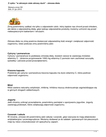Z cyklu: "w zdrowym ciele zdrowy duch" - zimowa dieta Wpisany przez DK Sob, 01 gru 2012 Zimą powinniśmy zadbać nie tylko o odpowiedni ubiór, który będzie nas chronił przed chłodem, ale także o odpowiednią dietę, gdyż jedząc odpowiednie produkty możemy uchronić się przed niebezpiecznymi bakteriami i wirusami. Zdrowa dieta na zimę powinna dostarczać odpowiednią ilość energii i zwiększać odporność organizmu, toteż podczas zimy powinniśmy jeść: Cytryny i pomarańcze Cytryny i pomarańcze to podstawa zimowej diety, bowiem owoce te zawierają mnóstwo witaminy C. (dzienne przyjmowanie 1000 mg witaminy C pomoże nam zachować szczupłą sylwetkę i ustrzeże przed przeziębieniem). Kiszona kapusta Podobnie jak cytryna i pomarańcza kiszona kapusta ma dużo witaminy C, która podnosi odporność organizmu. Miód Miód zawiera naturalny antybiotyk, inhibinę. Inhibina niszczy drobnoustroje zagnieżdżające się w górnych drogach oddechowych. Jogurty Jeśli chcemy uniknąć przeziębienia, powinniśmy pamiętać o spożywaniu jogurtów. Jogurty zawierają probiotyki, które zwiększają odporność organizmu. Czosnek i cebula W mroźne, zimowe dni powinniśmy jeść cebulę i czosnek, gdyż warzywa te mają właściwości antybakteryjne i przeciwgrzybicze. Możemy dodawać je do sałatek i gotowanych lub pieczonych mięs by nieco zneutralizować ich specyficzny zapach. 1/3 Z cyklu: "w zdrowym ciele zdrowy duch" - zimowa dieta Wpisany przez DK Sob, 01 gru 2012 Kasza gryczana i fasola Pamiętajmy o żelazie i magnezie, które znajdziemy np. w orzechach kaszy gryczanej i fasoli. pierwiastki te wzmacniają naszą odporność na niekorzystne warunki pogodowe, na stres, wspomagają koncentrację i chronią również przed anemią. Ryby i orzechy włoskie Jedzmy je gdyż są bogatym źródłem białka oraz nienasyconych kwasów tłuszczowych, które wpływają wzmacniająca na naszą odporność przed infekcjami. Pamiętajmy aby jeść ryby zarówno morskie jak i słodkowodne. Brokuły Brokuły to składnica witamin i składników odżywczych, które pomagają wzmocnić organizm i walczyć z przeziębieniem. Dzięki witaminom które zawierają: A, C i E oraz różnym przeciwutleniaczom brokuły to jedne z najzdrowszych warzyw jakie możemy a nawet powinniśmy dołączyć do zimowego menu. Buraki ćwikłowe Zawierają one witaminy: A, C i z grupy B oraz potas, wapń, żelazo, magnez, mangan i kobalt. Dieta bogata w buraki wzmacnia odporność, przeciwdziała anemii, oczyszcza organizm a także ułatwia trawienie. Zielona (gorąca) herbata Picie gorącej zielonej herbaty to idealny pomysł, ponieważ jest ona źródłem flawonoidów, które nie tylko zwalczają wolne rodniki, ale także wykazują działanie przeciwbakteryjne oraz przeciwwirusowe. Rozgrzewające zupy Zimą bardzo ważne jest jedzenie zup, gdyż rozgrzewają one organizm i dostarczają wodę (zimą narażeni jesteśmy na wysuszanie przez ogrzewanie, mniej też zwykle pijemy) Ilość posiłków również ma znaczenie. Ważne, abyśmy jedli co najmniej cztery posiłki dziennie. Spożywając posiłki co 3-4 godziny, 2/3 Z cyklu: "w zdrowym ciele zdrowy duch" - zimowa dieta Wpisany przez DK Sob, 01 gru 2012 ułatwiamy organizmowi utrzymać równowagę cieplną. Źródło: abczdrowie.pl oraz zdrowomaniaczki.blogspot.com 3/3