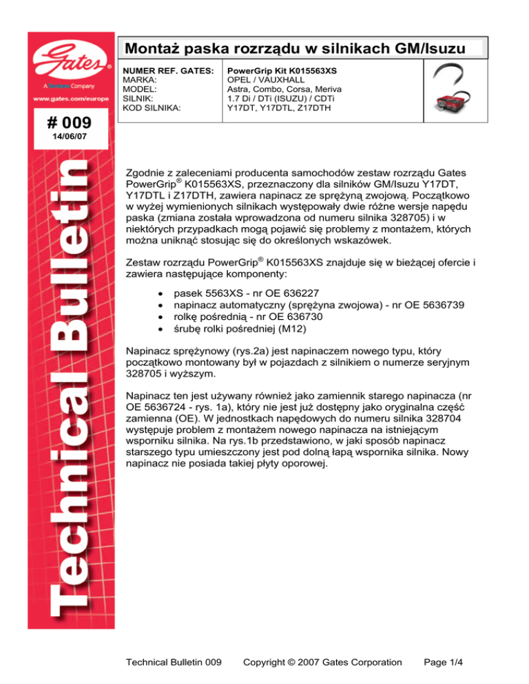 Montaż paska rozrządu w silnikach GM/Isuzu NUMER REF. GATES: MARKA: MODEL: SILNIK: KOD SILNIKA: PowerGrip Kit K015563XS OPEL / VAUXHALL Astra, Combo, Corsa, Meriva 1.7 Di / DTi (ISUZU) / CDTi Y17DT, Y17DTL, Z17DTH # 009 14/06/07 Zgodnie z zaleceniami producenta samochodów zestaw rozrządu Gates PowerGrip® K015563XS, przeznaczony dla silników GM/Isuzu Y17DT, Y17DTL i Z17DTH, zawiera napinacz ze sprężyną zwojową. Początkowo w wyżej wymienionych silnikach występowały dwie różne wersje napędu paska (zmiana została wprowadzona od numeru silnika 328705) i w niektórych przypadkach mogą pojawić się problemy z montażem, których można uniknąć stosując się do określonych wskazówek. Zestaw rozrządu PowerGrip® K015563XS znajduje się w bieżącej ofercie i zawiera następujące komponenty: • • • • pasek 5563XS - nr OE 636227 napinacz automatyczny (sprężyna zwojowa) - nr OE 5636739 rolkę pośrednią - nr OE 636730 śrubę rolki pośredniej (M12) Napinacz sprężynowy (rys.2a) jest napinaczem nowego typu, który początkowo montowany był w pojazdach z silnikiem o numerze seryjnym 328705 i wyższym. Napinacz ten jest używany również jako zamiennik starego napinacza (nr OE 5636724 - rys. 1a), który nie jest już dostępny jako oryginalna część zamienna (OE). W jednostkach napędowych do numeru silnika 328704 występuje problem z montażem nowego napinacza na istniejącym wsporniku silnika. Na rys.1b przedstawiono, w jaki sposób napinacz starszego typu umieszczony jest pod dolną łapą wspornika silnika. Nowy napinacz nie posiada takiej płyty oporowej. Technical Bulletin 009 Copyright © 2007 Gates Corporation Page 1/4 Rys. 1a Rys. 1b # 009 14/06/07 Wspornik silnika Płyta oporowa napinacza Aby zastąpić napinacz starego typu nowym – sprężynowym, należy wymienić wspornik silnika, ponieważ dolna łapa musi mieć taką samą długość, jak dwie pozostałe. Dodatkowo, należy zamontować gwintowany kołek (OE nr kat.5636706 rys. 2b) do mocowania sprężyny zwojowej nowego napinacza. Rys. 2a Rys. 2b Kołek gwintowany Napinacz sprężynowy Niezbędnym okazało się dostosowanie niektórych elementów zestawu do starszych pojazdów. W związku z tym, że nowy wspornik (nr OE 568110) jest dość kosztowny, firma Gates wprowadziła jedno skuteczne i tanie rozwiązanie dla wszystkich silników. Rozwiązanie to polega na wprowadzeniu elementu dystansowego (rys. 3), wykonanego ze stali o wysokiej jakości, o takiej samej grubości jak płytka oporowa oryginalnego napinacza, kompensującego różnicę długości łap wspornika silnika. Technical Bulletin 009 Copyright © 2007 Gates Corporation Page 2/4 Jako alternatywa oferowany jest rozbudowany zestaw K025563XS, który zawiera wszystkie element konieczne do wymiany i/lub adaptacji układu, zarówno w nowych jak i starych aplikacjach. # 009 Rys. 3 14/06/07 Zestaw K025563XS obejmuje: • • • • • • • pasek 5563XS – nr OE 636227 napinacz sprężynowy – nr OE 5636739 śrubę napinacza (M10) – nr OE 5636713 gwintowany kołek – nr OE 5636706 element dystansowy (rys.3) o takiej samej grubości jak płytka oporowa napinacza starszego typu rolkę pośrednią – nr OE 636730 śrubę rolki pośredniej (M12) Procedurę montażową przedstawiono poniżej. Ważne: Silnik musi być zimny. Ustawić silnik w Górnym Martwym Położeniu (GMP). Unieruchomić koło pasowe wałka rozrządu (śruba M6 w położeniu odpowiadającym godzinie 8-ej na tarczy zegara) i koło pasowe pompy wtryskowej (śruba M8 w położeniu odpowiadającym godzinie 5-ej). Silnik powinien być podparty a wspornik silnika wymontowany. A) silniki z zamontowany napinaczem starszego typu 1) 2) 3) wymontować stary napinacz, sprężynę, rolkę pośrednią i pasek zamontować nową rolkę pośrednią ze śrubą włożyć i dokręcić (momentem 18,6 Nm) gwintowany kołek z prawej strony koła pasowego pompy wtryskowej (rys.4) Rys.4 Rys.5 Kołek gwintowany Technical Bulletin 009 Element dystansowy Copyright © 2007 Gates Corporation Page 3/4 4) # 009 14/06/07 zamontować nowy napinacz sprężynowy (sprężyna na kołku, ręcznie dokręcić śrubę) 5) obrócić napinacz w kierunku przeciwnym do ruchu wskazówek zegara (kluczem imbusowym) tak, aby otwór sześciokątny (na klucz imbusowy) znalazł się w położeniu odpowiadającemu w przybliżeniu godzinie 5-ej na tarczy zegara 6) dokręcić śrubę 7) założyć nowy pasek (pasek musi być napięty z lewej strony silnika - strony bez napinacza) 8) poluzować śrubę napinacza, który napnie pasek; dokręcić śrubę napinacza (momentem 38 Nm) (jednocześnie unieruchamiając napinacz za pomocą klucza imbusowego) 9) wymontować śruby unieruchamiające wałek rozrządu i pompę wtryskową 10) obrócić silnik o 720° (2 obroty), sprawdzić GMP, poluzować napinacz, dokręcić śrubę napinacza (momentem 38 Nm) (jednocześnie unieruchamiając napinacz za pomocą klucza imbusowego) 11) przykleić element dystansowy (rys.5) na dolnej łapie wspornika silnika (użyć preparatu loctite lub superglue), aby uniknąć poluzowania elementu dystansowego przy późniejszym odkręcaniu śruby wspornika. 12) zamontować inne wymontowane elementy B) Silniki z zamontowanym napinaczem sprężynowym UWAGA: dla tej wersji nie jest wymagane użycie gwintowanego kołka ani elementu dystansowego 1) wymontować stary napinacz, rolkę pośrednią i pasek 2) zamontować nową rolkę pośrednią ze śrubą 3) zamontować nowy napinacz (sprężyna na kołku, ręcznie dokręcić śrubę) 4) obrócić napinacz w kierunku przeciwnym do ruchu wskazówek zegara (kluczem imbusowym) tak, aby otwór sześciokątny (na klucz imbusowy) znalazł się w położeniu odpowiadającemu w przybliżeniu godzinie 5-ej na tarczy zegara 5) dokręcić śrubę 6) założyć nowy pasek (pasek musi być napięty z lewej strony silnika - stronie bez napinacza) 7) poluzować śrubę napinacza, który napnie pasek; dokręcić śrubę napin