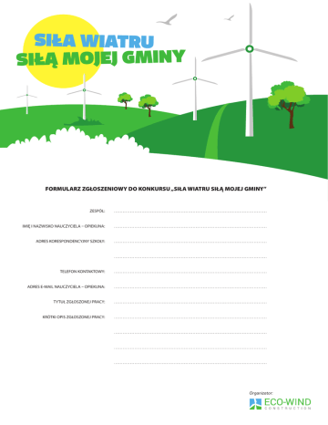SIŁA WIATRU SIŁĄ MOJEJ GMINY FORMULARZ ZGŁOSZENIOWY DO KONKURSU „SIŁA WIATRU SIŁĄ MOJEJ GMINY” ZESPÓŁ: ......................................................................................................... IMIĘ I NAZWISKO NAUCZYCIELA – OPIEKUNA: ......................................................................................................... ADRES KORESPONDENCYJNY SZKOŁY: ......................................................................................................... ......................................................................................................... TELEFON KONTAKTOWY: ......................................................................................................... ADRES E-MAIL NAUCZYCIELA – OPIEKUNA: ......................................................................................................... TYTUŁ ZGŁOSZONEJ PRACY: ......................................................................................................... KRÓTKI OPIS ZGŁOSZONEJ PRACY: ......................................................................................................... ......................................................................................................... ......................................................................................................... ......................................................................................................... Organizator: