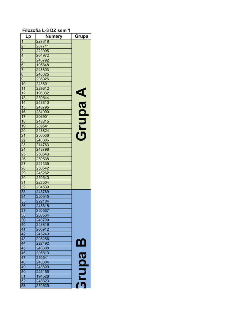 227318 237711 223095 204972 248792 195848 248803 248825 208926 248801 229612 196032 250544 248810 248795 234090 206901 248815 239541 248824 250536 248806 214763 248798 250543 250538 221335 250542 245262 250540 222504 204539 248789 250545 222184 248818 250537 250534 248790 248816 206912 245249 208286 222492 248808 205513 250541 248804 248800 223156 194526 248823 250539 Grupa B 1 2 3 4 5 6 7 8 9 10 11 12 13 14 15 16 17 18 19 20 21 22 23 24 25 26 27 28 29 30 31 32 33 34 35 36 37 38 39 40 41 42 43 44 45 46 47 48 49 50 51 52 53 Grupa A Filozofia L-3 DZ sem 1 Lp Numery Grupa Gru 238742 205378 248807 196199 248821 248794 213633 248819 248805 248813 204456 204133 250546 244697 248820 248814 227103 248797 237720 203760 243087 248799 248793 250547 248802 248809 195114 d004473 248812 248796 207060 248822 243446 172849 214399 225649 pd020209 228086 195952 205384 250535 147118 207078 237683 Grupa C 54 55 56 57 58 59 60 61 62 63 64 65 66 67 68 69 70 71 72 73 74 75 76 77 78 79 80 81 82 83 84 85 86 87 88 89 90 91 92 93 94 95