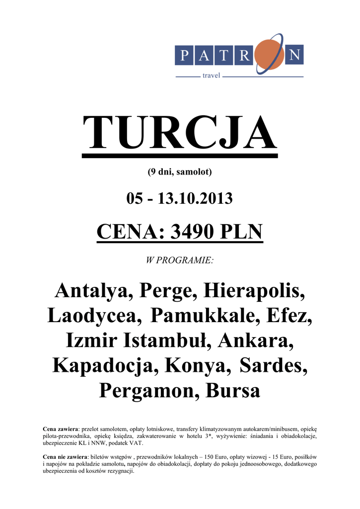 TURCJA (9 dni, samolot) 05 - 13.10.2013 CENA: 3490 PLN W PROGRAMIE: Antalya, Perge, Hierapolis, Laodycea, Pamukkale, Efez, Izmir Istambuł, Ankara, Kapadocja, Konya, Sardes, Pergamon, Bursa Cena zawiera: przelot samolotem, opłaty lotniskowe, transfery klimatyzowanym autokarem/minibusem, opiekę pilota-przewodnika, opiekę księdza, zakwaterowanie w hotelu 3*, wyżywienie: śniadania i obiadokolacje, ubezpieczenie KL i NNW, podatek VAT. Cena nie zawiera: biletów wstępów , przewodników lokalnych – 150 Euro, opłaty wizowej - 15 Euro, posiłków i napojów na pokładzie samolotu, napojów do obiadokolacji, dopłaty do pokoju jednoosobowego, dodatkowego ubezpieczenia od kosztów rezygnacji.