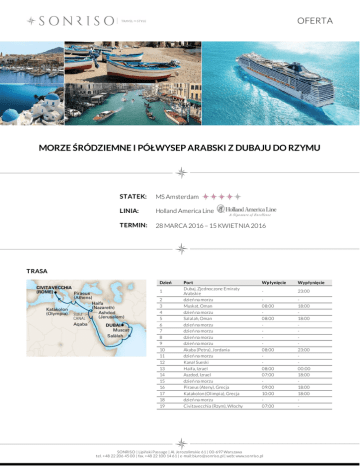 OFERTA MORZE ŚRÓDZIEMNE I PÓŁWYSEP ARABSKI Z DUBAJU DO RZYMU STATEK: MS Amsterdam LINIA: Holland America Line TERMIN: 28 MARCA 2016 – 15 KWIETNIA 2016 TRASA Dzień 1 2 3 4 5 6 7 8 9 10 11 12 13 14 15 16 17 18 19 Port Dubaj, Zjednoczone Emiraty Arabskie dzień na morzu Muskat, Oman dzień na morzu Salalah, Oman dzień na morzu dzień na morzu dzień na morzu dzień na morzu Akaba (Petra), Jordania dzień na morzu Kanał Sueski Haifa, Izrael Aszdod, Izrael dzień na morzu Piraeus (Ateny), Grecja Katakolon (Olimpia), Grecja dzień na morzu Civitavecchia (Rzym), Włochy Wpłynięcie Wypłynięcie - 23:00 08:00 08:00 08:00 08:00 07:00 09:00 10:00 07:00 18:00 18:00 23:00 00:00 18:00 18:00 18:00 - SONRISO | Lipiński Passage | Al. Jero zo limskie 61 | 00-697 Warszawa tel. +48 22 206 45 00 | fax. +48 22 100 14 61 | e-mail: biuro @so nriso .pl | web: www.so nriso .pl OFERTA CENA Typ kabiny Cena z osobę Kabina wewnętrzna od 2 298 EUR Kabina z oknem od 2 698 EUR Verandah Suite od 4 798 EUR CENA ZAWIERA DOTATKOWE OPŁATY zakwaterowanie w 2 - os. kabinie wybranej kategorii pełne wyżywienie: 3 posiłki, przekąski między posiłakmi, bufet o północy napoje do posiłków: woda stołowa, kawa, herbata oraz sok do śniadania serwis bagażowy podczas wejścia i zejścia ze statku 24 godzinny serwis kabinowy korzystanie z urządzeń sportowo - rekreacyjnych dostępnych na pokładzie (baseny, jacuzzi, boiska sportowe, kluby dla dzieci i młodzieży itp.) udział we wszystkich imprezach organizowanych na pokładzie (przedstawienia, pokazy, aukcje, animacje i inne) obowiązkowe opłaty portowe dojazd/przelot do portu rozpoczęcia i zakończenia rejsu transfery (lotnisko - port - lotnisko) ewentulne noclegi przed lub po rejsie wycieczki fakultatywne napoje: bezalkoholowe, alkoholowe, woda mineralna dostępne w restauracjach i barach (istnieje możliwość wykupienia pakietów napojów, o szczegóły zapytaj w biurze) korzystanie z mini baru w kabinie korzystanie z usług typu: SPA, salon piękności, pralnia itp. wydatki osobiste tj. zakupy w butikach, internet, kasyno itp. obowiązkowa opłata serwisowa (napiwki dla obsługi statku ok. 12,50 USD/os. dorosła/dzień, dzieci poniżej 3 lat nie płacą) obowiązkowe ubezpieczenie turystyczne koszt wymaganych wiz Na życzenie świadczymy dodatkowo usługi: rezerwacje hotelowe na całym świecie rezerwacje biletów lotniczych, trasferów oraz parkingu w porcie rezerwacje wycieczek fakultatywnych i innych atrakcji SONRISO | Lipiński Passage | Al. Jero zo limskie 61 | 00-697 Warszawa tel. +48 22 206 45 00 | fax. +48 22 100 14 61 | e-mail: biuro @so nriso .pl | web: www.so nriso .pl