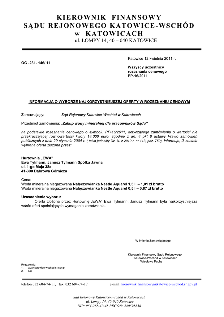 KIEROWNIK FINANSOWY SĄDU REJONOWEGO KATOWICE-WSCHÓD w KATOWICACH ul. LOMPY 14, 40 – 040 KATOWICE Katowice 12 kwietnia 2011 r. OG -231- 146/ 11 Wszyscy uczestnicy rozeznania cenowego PP-16/2011 INFORMACJA O WYBORZE NAJKORZYSTNIEJSZEJ OFERTY W ROZEZNANIU CENOWYM Zamawiający: Sąd Rejonowy Katowice-Wschód w Katowicach Przedmiot zamówienia: „Zakup wody mineralnej dla pracowników Sądu” na podstawie rozeznania cenowego o symbolu PP-16/2011, dotyczącego zamówienia o wartości nie przekraczającej równowartości kwoty 14.000 euro, zgodnie z art. 4 pkt 8 ustawy Prawo zamówień publicznych z dnia 29 stycznia 2004 r. ( tekst jednolity Dz. U. z 2010 r. nr 113, poz. 759), informuje, iż została wybrana oferta złożona przez: Hurtownia „EWA” Ewa Tylmann, Janusz Tylmann Spółka Jawna ul. 1-go Maja 38a 41-300 Dąbrowa Górnicza Cena: Woda mineralna niegazowana Nałęczowianka Nestle Aquarel 1,5 l – 1,01 zł brutto Woda mineralna niegazowana Nałęczowianka Nestle Aquarel 0,5 l – 0,87 zł brutto Uzasadnienie wyboru: Oferta złożona przez Hurtownię „EWA” Ewa Tylmann, Janusz Tylmann była najkorzystniejsza wśród ofert spełniających wymagania zamówienia. W imieniu Zamawiającego Kierownik Finansowy Sądu Rejonowego Katowice-Wschód w Katowicach Wiesława Fuchs Rozdzielnik : 1. www.katowice-wschod.sr.gov.pl 2. a/a telefon 032 604-74-11, fax 032 604-74-17 e-mail: [email protected] Sąd Rejonowy Katowice-Wschód w Katowicach ul. Lompy 14, 40-040 Katowice NIP: 954-258-40-48 REGON: 240598856