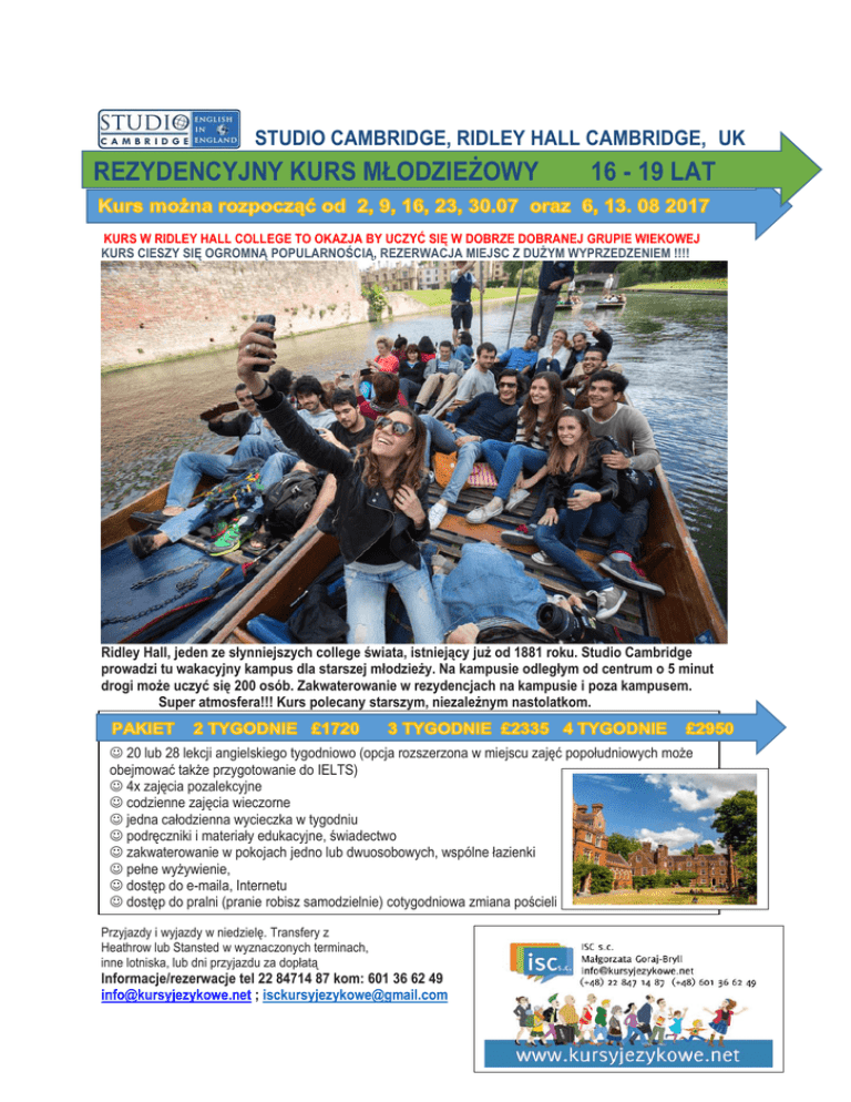 STUDIO CAMBRIDGE, RIDLEY HALL CAMBRIDGE, UK REZYDENCYJNY KURS MŁODZIEŻOWY 16 - 19 LAT KURS W RIDLEY HALL COLLEGE TO OKAZJA BY UCZYĆ SIĘ W DOBRZE DOBRANEJ GRUPIE WIEKOWEJ KURS CIESZY SIĘ OGROMNĄ POPULARNOŚCIĄ, REZERWACJA MIEJSC Z DUŻYM WYPRZEDZENIEM !!!! Ridley Hall, jeden ze słynniejszych college świata, istniejący już od 1881 roku. Studio Cambridge prowadzi tu wakacyjny kampus dla starszej młodzieży. Na kampusie odległym od centrum o 5 minut drogi może uczyć się 200 osób. Zakwaterowanie w rezydencjach na kampusie i poza kampusem. Super atmosfera!!! Kurs polecany starszym, niezależnym nastolatkom. 20 lub 28 lekcji angielskiego tygodniowo (opcja rozszerzona w miejscu zajęć popołudniowych może obejmować także przygotowanie do IELTS) 4x zajęcia pozalekcyjne codzienne zajęcia wieczorne jedna całodzienna wycieczka w tygodniu podręczniki i materiały edukacyjne, świadectwo zakwaterowanie w pokojach jedno lub dwuosobowych, wspólne łazienki pełne wyżywienie, dostęp do e-maila, Internetu dostęp do pralni (pranie robisz samodzielnie) cotygodniowa zmiana pościeli Przyjazdy i wyjazdy w niedzielę. Transfery z Heathrow lub Stansted w wyznaczonych terminach, inne lotniska, lub dni przyjazdu za dopłatą Informacje/rezerwacje tel 22 84714 87 kom: 601 36 62 49 [email protected] ; [email protected]