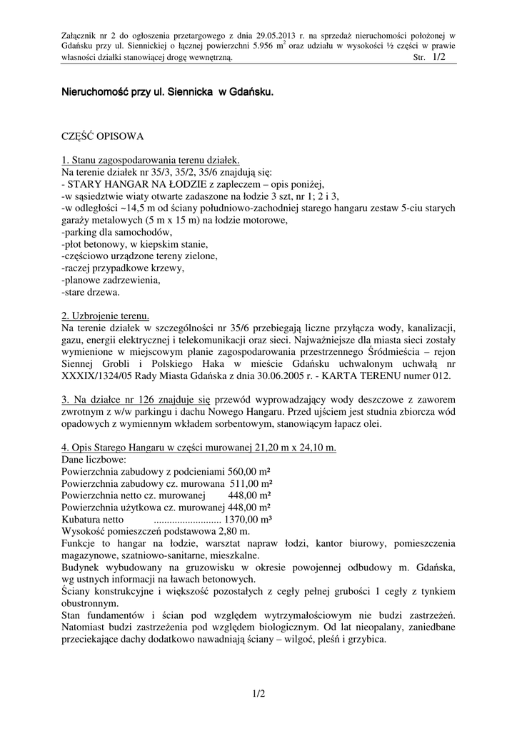 Załącznik nr 2 do ogłoszenia przetargowego z dnia 29.05.2013 r. na sprzedaŜ nieruchomości połoŜonej w Gdańsku przy ul. Siennickiej o łącznej powierzchni 5.956 m2 oraz udziału w wysokości ½ części w prawie własności działki stanowiącej drogę wewnętrzną. Str. 1/2 Nieruchomość przy ul. Siennicka w Gdańsku. CZĘŚĆ OPISOWA 1. Stanu zagospodarowania terenu działek. Na terenie działek nr 35/3, 35/2, 35/6 znajdują się: - STARY HANGAR NA ŁODZIE z zapleczem – opis poniŜej, -w sąsiedztwie wiaty otwarte zadaszone na łodzie 3 szt, nr 1; 2 i 3, -w odległości ~14,5 m od ściany południowo-zachodniej starego hangaru zestaw 5-ciu starych garaŜy metalowych (5 m x 15 m) na łodzie motorowe, -parking dla samochodów, -płot betonowy, w kiepskim stanie, -częściowo urządzone tereny zielone, -raczej przypadkowe krzewy, -planowe zadrzewienia, -stare drzewa. 2. Uzbrojenie terenu. Na terenie działek w szczególności nr 35/6 przebiegają liczne przyłącza wody, kanalizacji, gazu, energii elektrycznej i telekomunikacji oraz sieci. NajwaŜniejsze dla miasta sieci zostały wymienione w miejscowym planie zagospodarowania przestrzennego Śródmieścia – rejon Siennej Grobli i Polskiego Haka w mieście Gdańsku uchwalonym uchwałą nr XXXIX/1324/05 Rady Miasta Gdańska z dnia 30.06.2005 r. - KARTA TERENU numer 012. 3. Na działce nr 126 znajduje się przewód wyprowadzający wody deszczowe z zaworem zwrotnym z w/w parkingu i dachu Nowego Hangaru. Przed ujściem jest studnia zbiorcza wód opadowych z wymiennym wkładem sorbentowym, stanowiącym łapacz olei. 4. Opis Starego Hangaru w części murowanej 21,20 m x 24,10 m. Dane liczbowe: Powierzchnia zabudowy z podcieniami 560,00 m² Powierzchnia zabudowy cz. murowana 511,00 m² Powierzchnia netto cz. murowanej 448,00 m² Powierzchnia uŜytkowa cz. murowanej 448,00 m² Kubatura netto .......................... 1370,00 m³ Wysokość pomieszczeń podstawowa 2,80 m. Funkcje to hangar na łodzie, warsztat napraw łodzi, kantor biurowy, pomieszczenia magazynowe, szatniowo-sanitarne, mieszkalne. Budynek wybudowany na gruzowisku w okresie powojennej odbudowy m. Gdańska, wg ustnych informacji na ławach betonowych. Ściany konstrukcyjne i większość pozostałych z cegły pełnej grubości 1 cegły z tynkiem obustronnym. Stan fundamentów i ścian pod względem wytrzymałościowym nie budzi zastrzeŜeń. Natomiast budzi zastrzeŜenia pod względem biologicznym. Od lat nieopalany, zaniedbane przeciekające dachy dodatkowo nawadniają ściany – wilgoć, pleśń i grzybica. 1/2 Załącznik nr 2 do ogłoszenia przetargowego z dnia 29.05.2013 r. na sprzedaŜ nieruchomości połoŜonej w Gdańsku przy ul. Siennickiej o łącznej powierzchni 5.956 m2 oraz udziału w wysokości ½ części w prawie własności działki stanowiącej drogę wewnętrzną. Str. 2/2 Budynek posiada stropodach drewniany o dźwigarach w postaci zbijaków deskowych i krawędziaków z podsufitką w większości z płyt pilśniowych, przynajmniej w części ma docieplenia z wełny szklanej lub mineralnej. Połać stanowi deskowanie z pokryciem z papy asfaltowej, które miejscowo mocno przeciekają. Budynek posiadał instalacje wodną ze studni przyłączeniowej poza działkami AWFiS z punktem pomiarowym /odłączone/ oraz instalacje gazową, w szczególności do zasilania kotła gazowego, przyłącze zamknięte, licznik zdemontowany. Instalacja elektryczna ze złączem zlokalizowanym pod budynkiem, czynne dla wszystkich instalacji AWFiS na terenie. W budynku rozdzielnica, w której czynny jest punkt pomiarowy oświetlenia parkingu. Obok niego usytuowane jest złącze kontrolno-pomiarowe zasilania studni z pkt. kontroli wody usytuowanej na terenie AWFiS /na wodociągu DN500/ naleŜące do GIWK Gdańsk. Opracował wraz z częścią rysunkową: mgr inŜ. Henryk Rogowski Główny Specjalista ds. Budowlanych Akademia Wychowania Fizycznego i Sportu w Gdańsku Gdańsk, 21.05.2013 r. 2/2
