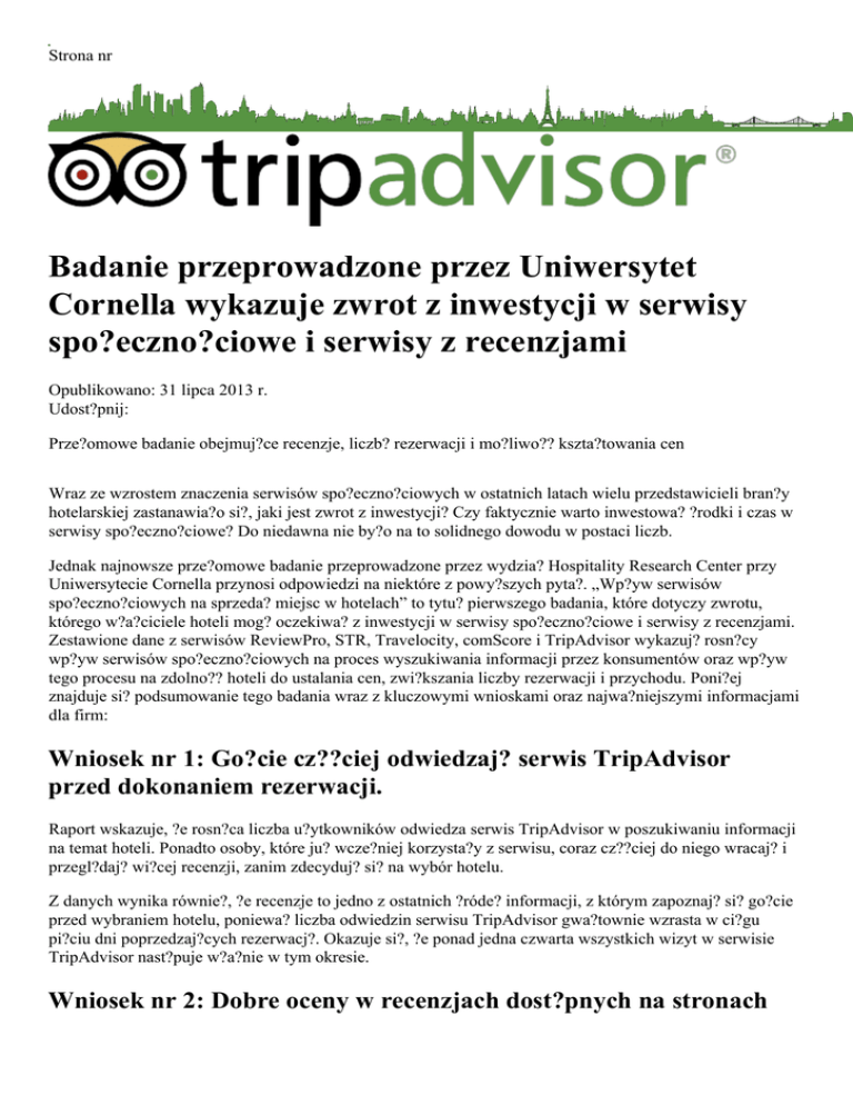 Strona nr Badanie przeprowadzone przez Uniwersytet Cornella wykazuje zwrot z inwestycji w serwisy spo?eczno?ciowe i serwisy z recenzjami Opublikowano: 31 lipca 2013 r. Udost?pnij: Prze?omowe badanie obejmuj?ce recenzje, liczb? rezerwacji i mo?liwo?? kszta?towania cen Wraz ze wzrostem znaczenia serwisów spo?eczno?ciowych w ostatnich latach wielu przedstawicieli bran?y hotelarskiej zastanawia?o si?, jaki jest zwrot z inwestycji? Czy faktycznie warto inwestowa? ?rodki i czas w serwisy spo?eczno?ciowe? Do niedawna nie by?o na to solidnego dowodu w postaci liczb. Jednak najnowsze prze?omowe badanie przeprowadzone przez wydzia? Hospitality Research Center przy Uniwersytecie Cornella przynosi odpowiedzi na niektóre z powy?szych pyta?. „Wp?yw serwisów spo?eczno?ciowych na sprzeda? miejsc w hotelach” to tytu? pierwszego badania, które dotyczy zwrotu, którego w?a?ciciele hoteli mog? oczekiwa? z inwestycji w serwisy spo?eczno?ciowe i serwisy z recenzjami. Zestawione dane z serwisów ReviewPro, STR, Travelocity, comScore i TripAdvisor wykazuj? rosn?cy wp?yw serwisów spo?eczno?ciowych na proces wyszukiwania informacji przez konsumentów oraz wp?yw tego procesu na zdolno?? hoteli do ustalania cen, zwi?kszania liczby rezerwacji i przychodu. Poni?ej znajduje si? podsumowanie tego badania wraz z kluczowymi wnioskami oraz najwa?niejszymi informacjami dla firm: Wniosek nr 1: Go?cie cz??ciej odwiedzaj? serwis TripAdvisor przed dokonaniem rezerwacji. Raport wskazuje, ?e rosn?ca liczba u?ytkowników odwiedza serwis TripAdvisor w poszukiwaniu informacji na temat hoteli. Ponadto osoby, które ju? wcze?niej korzysta?y z serwisu, coraz cz??ciej do niego wracaj? i przegl?daj? wi?cej recenzji, zanim zdecyduj? si? na wybór hotelu. Z danych wynika równie?, ?e recenzje to jedno z ostatnich ?róde? informacji, z którym zapoznaj? si? go?cie przed wybraniem hotelu, poniewa? liczba odwiedzin serwisu TripAdvisor gwa?townie wzrasta w ci?gu pi?ciu dni poprzedzaj?cych rezerwacj?. Okazuje si?, ?e ponad jedna czwarta wszystkich wizyt w serwisie TripAdvisor nast?puje w?a?nie w tym okresie. Wniosek nr 2: Dobre oceny w recenzjach dost?pnych na stronach najwi?kszych biur podró?y umo?liwiaj? w?a?cicielom hoteli utrzymywanie wy?szych cen przy zachowaniu sta?ej liczby rezerwacji. Badanie dowiod?o, ?e wzrost poziomu ocen hotelu w recenzjach u?ytkowników dost?pnych na stronach najwi?kszych biur podró?y mo?e pozytywnie wp?ywa? na relacj? pomi?dzy wzrostem cen a popytem. Lepsze oceny w recenzjach zwi?kszaj? wska?niki skuteczno?ci, nawet w obliczu rosn?cych cen. Zazwyczaj wzrost ceny za pokój oznacza spadek liczby rezerwacji. Je?li jednak oceny hotelu wzrosn? o jeden punkt (w skali od jeden do pi?ciu) na podstawie recenzji dost?pnych na stronach internetowych biur podró?y, istnieje mo?liwo?? podniesienia cen o oko?o 11,2% bez zmniejszenia liczby rezerwacji. Pozytywny wp?yw, jaki wywieraj? lepsze recenzje u?ytkowników, mo?e przewy?szy? negatywne skutki wynikaj?ce z podniesienia cen. Wniosek nr 3: Hotele ciesz?ce si? lepsz? reputacj? we wszystkich serwisach osi?gaj? lepsze wyniki. Badanie dowodzi, ?e wraz ze wzrostem reputacji hotelu w serwisach spo?eczno?ciowych poprawiaj? si? jego wyniki. Lepsza reputacja w sieci zwi?ksza mo?liwo?? kszta?towania cen przez w?a?ciciela hotelu. Dzi?ki temu ich wzrost nie powoduje spadku liczby rezerwacji. Wy?sze ceny oznaczaj? wzrost przychodu i lepsze wyniki. Zasada ta dzia?a w obie strony — hotele ciesz?ce si? gorsz? reputacj? w serwisach spo?eczno?ciowych osi?gaj? s?absze wyniki, poniewa? musz? obni?a? ceny, aby utrzyma? sta?? liczb? rezerwacji. Najwa?niejsze informacje dla firmy Aby w pe?ni wykorzysta? mo?liwo?ci oferowane przez serwis TripAdvisor, nale?y zarejestrowa? i potwierdzi? konto swojego hotelu. Warto regularnie odwiedza? Centrum zarz?dzania, aby aktualizowa? tre?ci i ponownie przyci?gn?? uwag? podró?nych, którzy na etapie planowania podró?y mog? wielokrotnie przegl?da? stron? Pa?stwa hotelu. Warto ?ledzi? recenzje dotycz?ce Pa?stwa hotelu, aby dowiedzie? si?, jak jest oceniany, pozna? opinie go?ci i wprowadzi? konieczne zmiany. Kluczem do poprawy ocen w recenzjach na ka?dej platformie jest zapewnienie go?ciom jak najlepszej obs?ugi. Warto zach?ca? do zamieszczania nowych recenzji, aby poprawi? ogóln? ocen? hotelu w serwisie TripAdvisor. Aby dowiedzie? si? wi?cej, nale?y wybra? stron? „Bezp?atne narz?dzia marketingowe” w Centrum zarz?dzania, a nast?pnie skorzysta? z narz?dzi znajduj?cych si? w obszarze „Uzyskaj wi?cej recenzji”. Odpowiedzi kierownictwa to doskona?e narz?dzie dbania o reputacj?, dzi?ki któremu potencjalni go?cie mog? zapozna? si? z Pa?stwa hotelem. Je?li pojawi si? recenzja zawieraj?ca ni?sz? ocen?, nale?y skorzysta? z nadarzaj?cej si? okazji i napisa? odpowied? kierownictwa, staraj?c si? wywrze? dobre wra?enie na innych podró?nych. Dobra obs?uga ma kluczowe znaczenie dla Pa?stwa reputacji. Korzystaj?c z Pulpitu recenzji, mo?na zwróci? uwag? na powtarzaj?ce si? w recenzjach problemy zwi?zane z obs?ug? go?ci (w obszarze „Informacje na temat hotelu” na stronie g?ównej Centrum zarz?dzania). Nast?pnie na podstawie uzyskanych informacji mo?na wprowadzi? ulepszenia. ?ród?o: „Wp?yw serwisów spo?eczno?ciowych na sprzeda? miejsc w hotelach”. Chris K. Anderson, The Center for Hospitality Research. Uniwersytet Cornella. Listopad 2012 r. Informacje o stronie TripAdvisor TripAdvisor® to najwi?ksza na ?wiecie strona turystyczna**, która pozwala podró?nym w pe?ni wykorzysta? ka?d? podró?. Mo?na na niej znale?? sprawdzone porady milionów podró?nych, szeroki wachlarz us?ug u?atwiaj?cych planowanie wyjazdu, a tak?e zintegrowane narz?dzia pozwalaj?ce dokonywa? rezerwacji i przeszukiwa? setki witryn w celu znalezienia najlepszych cen obowi?zuj?cych w hotelach. Witryny wspó?pracuj?ce ze stron? TripAdvisor tworz? najwi?ksz? spo?eczno?? podró?nych na ?wiecie. S? one odwiedzane ?rednio 390 milionów razy miesi?cznie* i mo?na na nich znale?? 435 milio