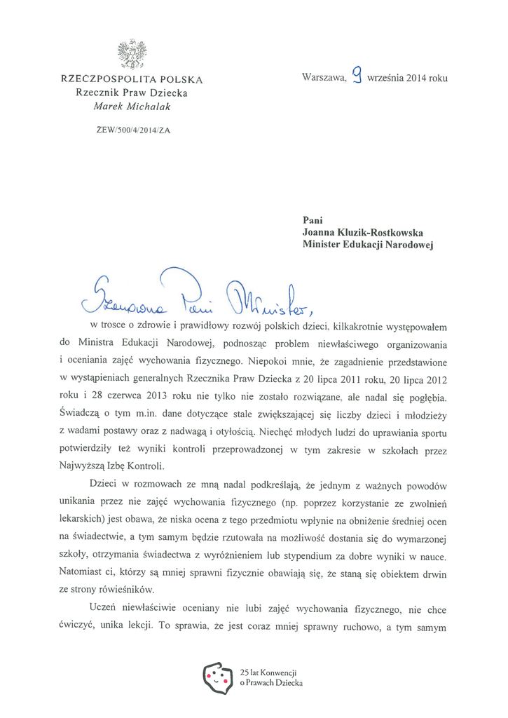 Warszawa, RZECZPOSPOLITA POLSKA Rzecznik Praw Dziecka Marek Michalak 9 ześnia 2014 roku ZEW/500/4/20 I 4/ZA Pani Joanna Kluzik-Rostkowska Minister Edukacji Narodowej w trosce o zdrowie i prawidłowy rozwój polskich dzieci, kilkakrotnie występowałem do Ministra Edukacji Narodowej. podnosząc problem niewłaściwego organizowania i oceniania zajęć wychowaxia fizycznego. Niepokoi mnie, że zagadnienie przedstawione w wystąpieniach generalnych Rzecznika Praw Dziecka z 20 lipca 2011 roku, 20 lipca 2012 roku i 28 czerwca 2013 roku nie tylko nie zostało rozwiązane. ale nadal się pogłębia. Świadczą o tym m.in. dane dotyczące stale zwiększąjącej się liczby dzieci i młodzieży z wadami postawy oraz z nadwagą i otyłością. Niechęć miodych ludzi do uprawiania sportu potwierdziły też wyniki kontroli przeprowadzonej w tym zakresie w szkołach przez Najwyższą Izbę Kontroli. Dzieci w rozmowach ze mną nadal podkreślają, że jednym z ważnych powodów unikania przez nie zajęć wychowania fizycznego (np. poprzez korzystanie ze zwolnień lekarskich) jest obawa, że niska ocena z tego przedmiotu wpłynie na obniżenie średniej ocen na świadectwie, a tym samym będzie rzutowała na możliwość dostania się do wymarzonej szkoły, otrzymania świadectwa z wyróżnieniem lub stypendium za dobre wyniki w nauce. Natomiast ci, którzy są mniej sprawni fizycznie obawiąją się, że staną się obiektem drwin ze strony rówieśników. Uczeń niewłaściwie oceniany nie lubi zajęć wychowania fizycznego, nie chce ćwiczyć, unika lekcji. To sprawia. że jest coraz mniej sprawny ruchowo, a tym samym • 25 lat Konwencji o Prawach Dziecka postrzega siebie jako gorszego od innych, zaś zaniżona samoocena rzutuje na jego postawę także w innych sferach życia. Możliwość otrzymania dobrej oceny jest natomiast czynnikiem motywującym do uczestnictwa w zajęciach i czerpania z nich radości, co w przyszłości powinno przełożyć się na zamiłowanie do aktywnego. zdrowego stylu życia. Moje spostrzeżenia potwierdziły wyniki sondażu Centrum Edukacji Obywatelskiej, przeprowadzonego w ramach kampanii „.WF z klasą” w okresie od 21 października do 6 listopada 2013 roku. Pokazują one, że oceny mają ogromny wpływ na frekwencję i samopoczucie uczniów podczas lekcji w-f. Spośród tych, którzy mieli na ostatnim świadectwie ocenę L 2 lub 3, przyjemność z zajęć odczuwało tylko 30%. a nudziło się na nich aż 47% uczniów. Poziom pozytywnych emocji wzrastał wraz z oceną z zajęć z wychowania fizycznego u prymusów osiągnął on 86%. - Młodzież nie chce być oceniana jedynie za swoją sprawność fizyczną (na podstawie tzw. tabel). Chce bawić się w ruchu. Dlatego tak ważne jest dostosowanie wewnątrzszkolnych systemów oceniania do uregulowań * 7 rozporządzenia Ministra Edukacji Narodowej z dnia 30 kwietnia 2007 r. w sprawie warunków i sposobu oceniania, klasyfikowania i promowania uczniów i słuchaczy oraz przeprowadzenia sprawdzianów i egzaminów w szkołach publicznych (Dz. U. z 2007 r. Nr 83, poz. 562 z późn. zm.), który stanowi: „.Przy ustalaniu oceny z wychowania fizycznego należy w szczególności brać pod uwagę wysiłek wkładany przez ucznia w wywiązywanie się z obowiązków wynikających ze specyfiki tych zajęć”. Na powyższy problem wskazywałem w poprzednich wystąpieniach kierowanych do Ministra Edukacji Narodowej. Wnioskowałem wówczas m. in. o zobowiązanie dyrektorów szkół i nauczycieli wychowania fizycznego do dostosowania tzw. wewnątrzszkolnych systemów oceniania do obowiązujących przepisów. Podkreślałem też wagę organizacji zajęć wychowania fizycznego z uwzględnieniem zainteresowań uczniów. Taką możliwość również dają obecne uregulowania ( 1 ust. 1 pkt 2 rozporządzenia Ministra Edukacji Narodowej z dnia 9 sierpnia 2011 r. w sprawie dopuszczalnych form realizacji obowiązkowych zajęć wychowania fizycznego Dz. U. z 2011 r. Nr 175, poz. 1042). - Mając powyższe na uwadze, na podstawie art. 10 ust. 1 pkt 2 i pkt 7 ustawy z dnia 6 stycznia 2000 r. o Rzeczniku Praw Dziecka (Dz. U. z 2000 r. Nr 6. poz. 69 z późn. zm.), zwracam się do Pani Minister o zbadanie. W jakim stopniu organizacja zajęć wychowania fizycznego oraz wewnątrzszkolne zasady oceniania przepisów prawa i uwzględniąją wyżej są dostosowane do obowiązujących poruszane kwestie. Proszę Panią Minister o zobowiązanie - za pośrednictwem kuratorów oświaty - dyrektorów szkół, w których występują wskazane problemy. do zorganizowania doskonalenia zawodowego dla nauczycieli wychowania fizycznego, aby mogli należycie wykonywać powierzone im zadaiiia. Mam nadzieję, że podjęte w tym zakresie działania wpłyną na kształtowanie się pozytywnego stosunku uczniów do lekcji wychowania fizycznego, a w konsekwencji wyzwolą w nich potrzebę uprawiania sportu i rekreacji, co z kolei będzie miało istotny wpływ - na poprawę zdrowia i kondycji populacji wieku rozwojowego oraz w przyszłości całego społeczeństwa. Do wiadomości: Pan Rajmund Miller Przewodniczący Zespołu ds. Przeciwdziałania Otyłości, Sejm RP ul. Wiejska 4/6/8. OO-902 Warszawa