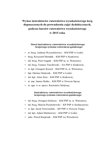 Wykaz instruktorów ratownictwa wysokościowego ksrg dopuszczonych do prowadzenia zajęć dydaktycznych, podczas kursów ratownictwa wysokościowego w 2015 roku Starsi instruktorzy ratownictwa wysokościowego krajowego systemu ratowniczo-gaśniczego: • st. bryg. Andrzej Wyciszkiewicz – KM PSP w Łodzi; • bryg. Krzysztof Mendak – KM PSP w Krakowie; • mł. bryg. Piotr Gugała – KM PSP m. st. Warszawy; • mł. bryg. Tomasz Traciłowski – SA PSP w Krakowie; • st. kpt. Grzegorz Kozioł – KM PSP m. st. Warszawy; • kpt. Dariusz Stańczak – KM PSP w Łodzi; • mł. kpt. Artur Żera – KM PSP w Krakowie; • st. asp. Janusz Rutka – KM PSP w Nowym Sączu; • st. ogn. w st. spocz. Kazimierz Strójwąs. Instruktorzy ratownictwa wysokościowego krajowego systemu ratowniczo-gaśniczego: • mł. bryg. Grzegorz Kulesza – KM PSP m. st. Warszawy; • mł. bryg. Marcin Przybyłowski – KP PSP w Sochaczewie; • st. kpt. Jacek Nowosielski – KP PSP w Nowym Targu; • mł. kpt. Adam Markiewicz – KM PSP w Łodzi; • sekc. Paweł Kasprzak – KM PSP we Wrocławiu.