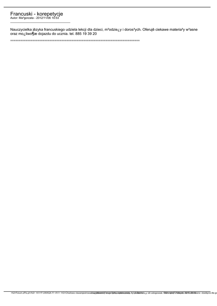 Francuski - korepetycje Autor: Ma³gorzata - 2012/11/06 10:53 _____________________________________ Nauczycielka jêzyka francuskiego udziela lekcji dla dzieci, m³odzie¿y i doros³ych. Oferujê ciekawe materia³y w³asne oraz mo¿liwo¶æ dojazdu do ucznia. tel. 885 19 39 20 ============================================================================ <h2>Forum.oPio.pl</h2> <h1>!!! UWAGA !!! </h1> <h3>Chwilowo niezarejestrowani Joomlaboard u¿ytkownicyForum mog±Component tylko czytaæversion: posty, by 1.1.3 pisaæ Stable nale¿y siê zalogowaæ.</h3> Generated: <p>(Forum 7 March, jest 2017, niemoderowane 20:20 i dostêpne dla go