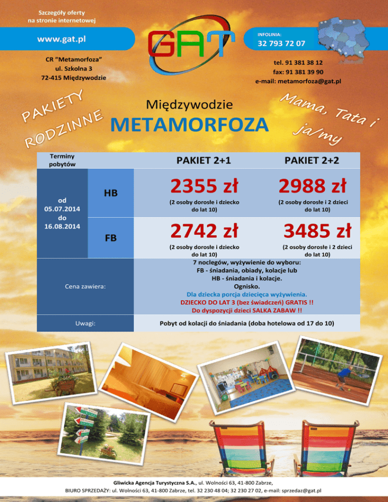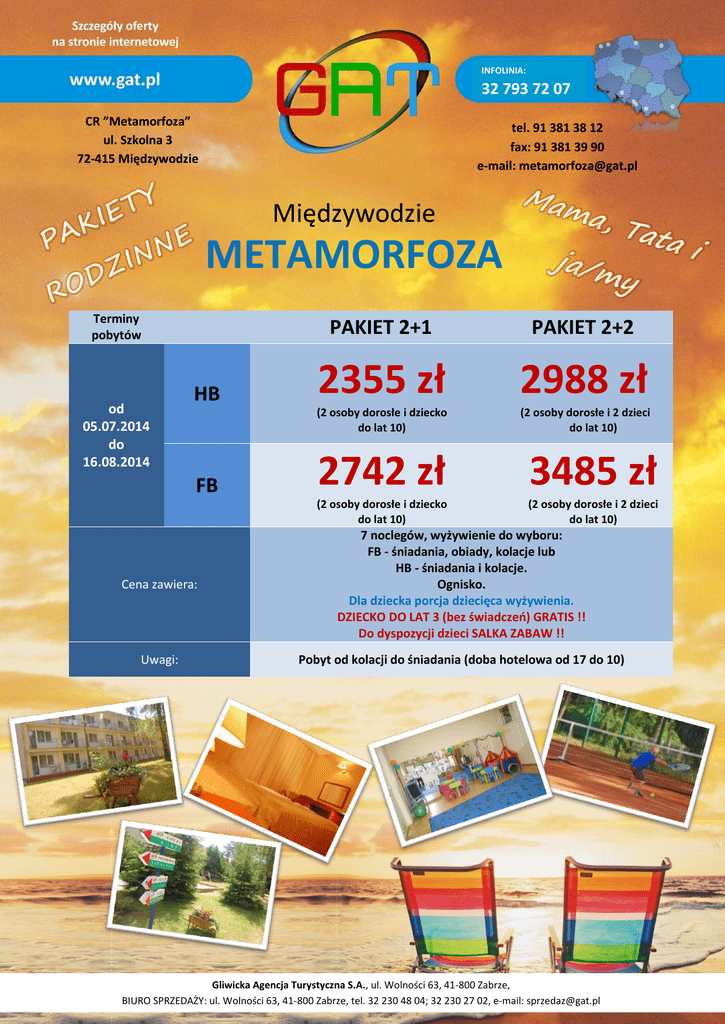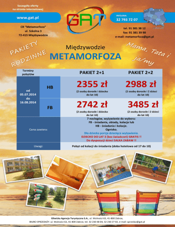 INFOLINIA: 32 793 72 07 CR ”Metamorfoza” ul. Szkolna 3 72-415 Międzywodzie tel. 91 381 38 12 fax: 91 381 39 90 e-mail: [email protected] Międzywodzie METAMORFOZA Terminy pobytów od 05.07.2014 do 16.08.2014 HB FB PAKIET 2+1 PAKIET 2+2 2355 zł 2988 zł (2 osoby dorosłe i dziecko do lat 10) (2 osoby dorosłe i 2 dzieci do lat 10) 2742 zł 3485 zł (2 osoby dorosłe i dziecko do lat 10) (2 osoby dorosłe i 2 dzieci do lat 10) Cena zawiera: 7 noclegów, wyżywienie do wyboru: FB - śniadania, obiady, kolacje lub HB - śniadania i kolacje. Ognisko. Dla dziecka porcja dziecięca wyżywienia. DZIECKO DO LAT 3 (bez świadczeń) GRATIS !! Do dyspozycji dzieci SALKA ZABAW !! Uwagi: Pobyt od kolacji do śniadania (doba hotelowa od 17 do 10) Gliwicka Agencja Turystyczna S.A., ul. Wolności 63, 41-800 Zabrze, BIURO SPRZEDAŻY: ul. Wolności 63, 41-800 Zabrze, tel. 32 230 48 04; 32 230 27 02, e-mail: [email protected]