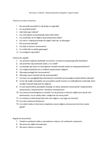 Nie tańcz z wilkami. Wykorzystywanie fotografii i nagrań wideo. Pytania do analizy kreskówki: 1. Kto poszedł sprawdzić co się dzieje za zagrodą? 2. Co zauważył Jasiek? 3. Jaka była jego reakcja? 4. Czy zwierzętom przeszkadzała obecność wilka? 5. Czy wiedziały, że te zdjęcia są przekazywane dalej? 6. Czy owce z chęcią pozowały do zdjęć? Jeśli tak, to dlaczego? 7. Kto przerwał zabawę? 8. Czy było to słuszne zachowanie? 9. Co zrobił wilk na widok gajowego? 10. Co następnie się działo? Pytania do regułek: 1. Czy pomysł zrobienia dyskoteki na terenie, na którym przebywają wilki był dobry? 2. Jak powinien się zachować Jasiek, a co zrobił? 3. Czy bawiąc się razem ze zwierzętami narażał również siebie na niebezpieczeństwo? 4. Czy mógł przewidzieć po co wilkowi są potrzebne zdjęcia? 5. Dlaczego postąpił tak nierozważnie? 6. Dlaczego owce również tak się zachowywały? 7. Czy baca nie wyciągnął zbyt pochopnych wniosków przerywając przedwcześnie zabawę? 8. Co by się mogło stać gdyby nie przyszedł w porę? (mamy na myśli głównie owieczkę, która zaczęła rozpinać kożuszek do zdjęcia) 9. O czym powinniśmy pamiętać chodząc na różne spotkania towarzyskie? (odpowiednie towarzystwo, niepozowanie i nieufanie nieznajomym) 10. Czy zawsze przestrzegamy te zasady? Czy są sytuacje w których ciężko jest się do nich dostosować, czy to zależy tylko i wyłącznie od naszej woli? 11. Co możemy zrobić kiedy ktoś robi nam zdjęcie a my tego nie chcemy? 12. Czy taka osoba jest bezkarna? 13. Co zrobić, kiedy w Internecie znajdziemy nasze zdjęcie umieszczone tam bez naszej zgody? Reguły do prezentacji: 1. Chodź na spotkania tylko w sprawdzone miejsca i do zaufanych znajomych. 2. Nie pozuj do zdjęć nieznajomym. 3. Nie wierz nikomu na słowo. 4. Staraj się zawsze mieć przy sobie kogoś bliskiego, na kogo będziesz mógł liczyć w razie potencjalnego zagrożenia. 5. Nie rób czegoś, czego będziesz później żałować. 6. Zastanów się dwa razy, zanim zrobisz coś, co budzi Twoje wątpliwości. 7. Nie zwracaj na siebie uwagi innych. 8. Protestuj, kiedy ktoś robi ci zdjęcie, którego sobie nie życzysz. 9. Reaguj, kiedy widzisz w Internecie zdjęcia ośmieszające ciebie lub innych i nie posyłaj ich dalej.