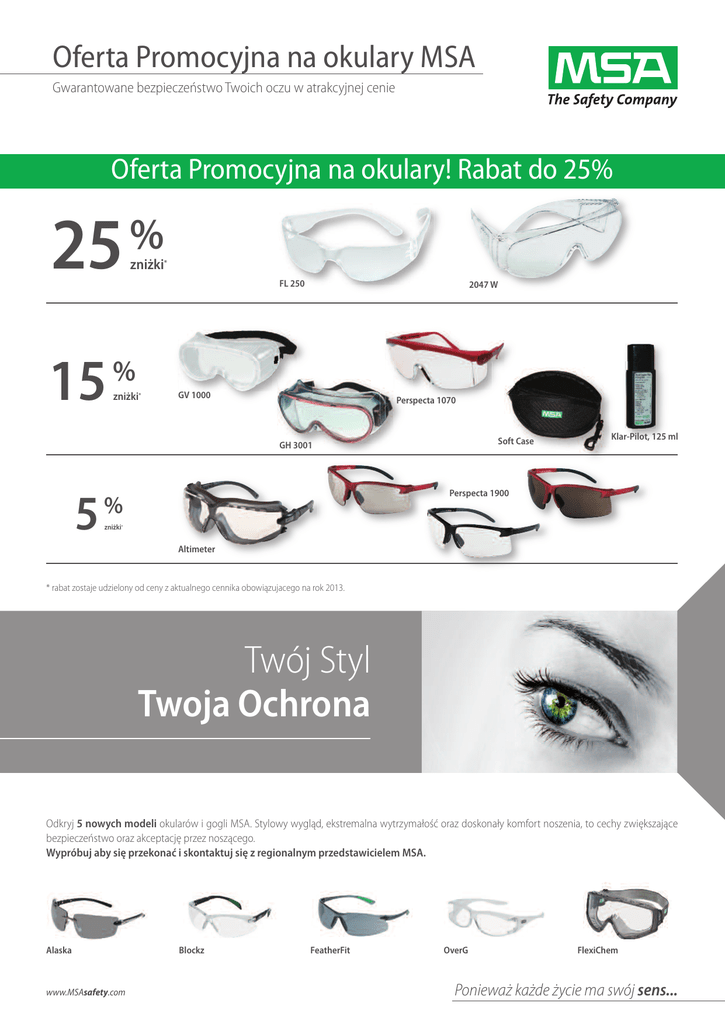 Oferta Promocyjna na okulary MSA Gwarantowane bezpieczeństwo Twoich oczu w atrakcyjnej cenie Oferta Promocyjna na okulary! Rabat do 25% 25 15 % zniżki* FL 250 2047 W % zniżki* GV 1000 Perspecta 1070 Soft Case GH 3001 5 Klar-Pilot, 125 ml Perspecta 1900 % zniżki* Altimeter * rabat zostaje udzielony od ceny z aktualnego cennika obowiązujacego na rok 2013. Twój Styl Twoja Ochrona Odkryj 5 nowych modeli okularów i gogli MSA. Stylowy wygląd, ekstremalna wytrzymałość oraz doskonały komfort noszenia, to cechy zwiększające bezpieczeństwo oraz akceptację przez noszącego. Wypróbuj aby się przekonać i skontaktuj się z regionalnym przedstawicielem MSA. Alaska www.MSAsafety.com Blockz FeatherFit OverG FlexiChem Ponieważ każde życie ma swój sens...