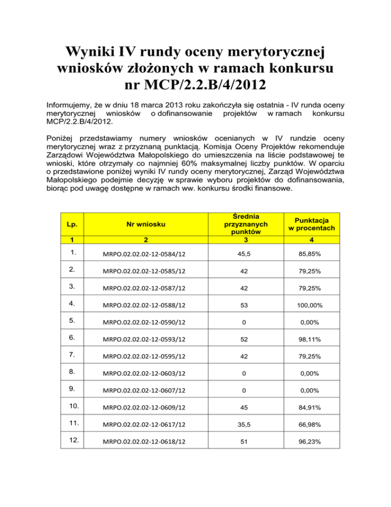 Wyniki IV rundy oceny merytorycznej wniosków złoŜonych w ramach konkursu nr MCP/2.2.B/4/2012 Informujemy, Ŝe w dniu 18 marca 2013 roku zakończyła się ostatnia - IV runda oceny merytorycznej wniosków o dofinansowanie projektów w ramach konkursu MCP/2.2.B/4/2012. PoniŜej przedstawiamy numery wniosków ocenianych w IV rundzie oceny merytorycznej wraz z przyznaną punktacją. Komisja Oceny Projektów rekomenduje Zarządowi Województwa Małopolskiego do umieszczenia na liście podstawowej te wnioski, które otrzymały co najmniej 60% maksymalnej liczby punktów. W oparciu o przedstawione poniŜej wyniki IV rundy oceny merytorycznej, Zarząd Województwa Małopolskiego podejmie decyzję w sprawie wyboru projektów do dofinansowania, biorąc pod uwagę dostępne w ramach ww. konkursu środki finansowe. Lp. Nr wniosku 1 2 Średnia przyznanych punktów 3 1. MRPO.02.02.02-12-0584/12 45,5 85,85% 2. MRPO.02.02.02-12-0585/12 42 79,25% 3. MRPO.02.02.02-12-0587/12 42 79,25% 4. MRPO.02.02.02-12-0588/12 53 100,00% 5. MRPO.02.02.02-12-0590/12 0 0,00% 6. MRPO.02.02.02-12-0593/12 52 98,11% 7. MRPO.02.02.02-12-0595/12 42 79,25% 8. MRPO.02.02.02-12-0603/12 0 0,00% 9. MRPO.02.02.02-12-0607/12 0 0,00% 10. MRPO.02.02.02-12-0609/12 45 84,91% 11. MRPO.02.02.02-12-0617/12 35,5 66,98% 12. MRPO.02.02.02-12-0618/12 51 96,23% Punktacja w procentach 4 13. MRPO.02.02.02-12-0622/12 46 86,79% 14. MRPO.02.02.02-12-0636/12 0 0,00% 15. MRPO.02.02.02-12-0639/12 52 98,11% 16. MRPO.02.02.02-12-0645/12 52 98,11% 17. MRPO.02.02.02-12-0646/12 52 98,11% 18. MRPO.02.02.02-12-0652/12 0 0,00% 19. MRPO.02.02.02-12-0662/12 49 92,45% 20. MRPO.02.02.02-12-0678/12 49 92,45%