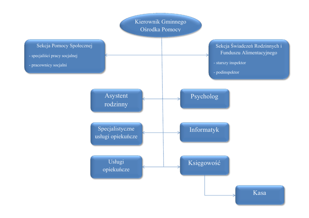 Kierownik Gminnego Ośrodka Pomocy Sekcja Pomocy Społecznej Sekcja Świadczeń Rodzinnych i Funduszu Alimentacyjnego - specjaliści pracy socjalnej - starszy inspektor - pracownicy socjalni - podinspektor Asystent rodzinny Psycholog Specjalistyczne usługi opiekuńcze Informatyk Usługi opiekuńcze Księgowość Kasa
