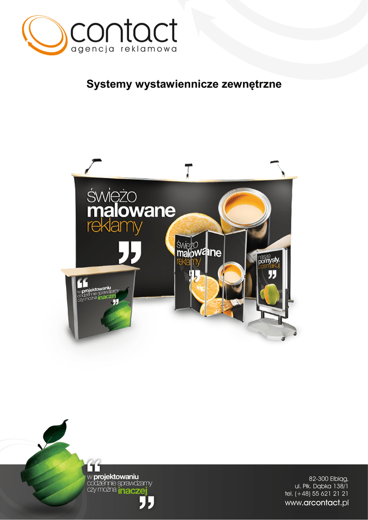 Systemy wystawiennicze zewnętrzne Potykacz outdoor Opis: - Przenośny potykacz użytku zewnętrznego - Dociążenie woda lub piasek - Idealne na imprezy wiosenne, koncerty - Zapakowany w kartony - Wydruk na papierze Waga: 10-15kg Potykacz outdoor A1 60x85cm Cena: 445 zł netto Potykacz outdoor B1 70x100cm Cena: 550 zł netto X-baner outdoor Opis: - Przenośny xbaner użytku zewnętrznego - Dociążenie woda lub piasek - Idealne na imprezy wiosenne, koncerty - Zapakowany w kartony - Wydruk na ferrari Waga: 7 kg Xbaner outdoor 60x180cm Cena: 285 zł netto ŚCIANA BILBOARD XXL Opis: - Przenośna ściana do użytku zewnętrznego - Dociążenie - woda lub piasek - Idealne na imprezy wiosenne, koncerty itp. - Zapakowana w kartony - Bezproblemowy montaż i użytkowanie - Wydruk banerowy (łatwy do wymiany) - Rozkładanie w ok 15 min. - Bardzo stabilna w złą pogodę Waga: 35kg /58kg Ściana Bilboard 3x2,4 m dwustronna Cena: 1245 zł netto Grafika: od 590 zł netto Ściana Bilboard XXL 5,7x2,4 m dwustronna Cena: 1990 zł netto Grafika: od 995 zł netto POTYKACZE Aluminiowy Potykacz OWZ (czyli otwórz, włóż, zamknij), jest najlepszym rozwiązaniem jakościowym spośród całej rodziny potykaczy. Duże wymiary grafiki, odpowiedni ciężar stojaka, stanowi idealne medium reklamy wśród zatłoczonych alejek, pasaży. Wymiana plakatów trwa kilka sekund. Potykacz A1 Kolor: srebrny Waga: 8 kg Wymiar grafiki: 60x85cm Zapakowane w karton. Konstrukcja bardzo stabilna. Cena: 275 zł netto Grafika: od 40 zł netto Potykacz B1 Kolor: srebrny Waga: 12 kg Wymiar grafiki: 70x100cm Cena: 330 zł netto Grafika: od 55 zł netto Potykacz B2 Kolor: srebrny Waga: 7 kg Wymiar grafiki: 50x70cm Cena: 250 zł netto Grafika: od 35 zł netto Zapakowane w karton. Konstrukcje stabilne.