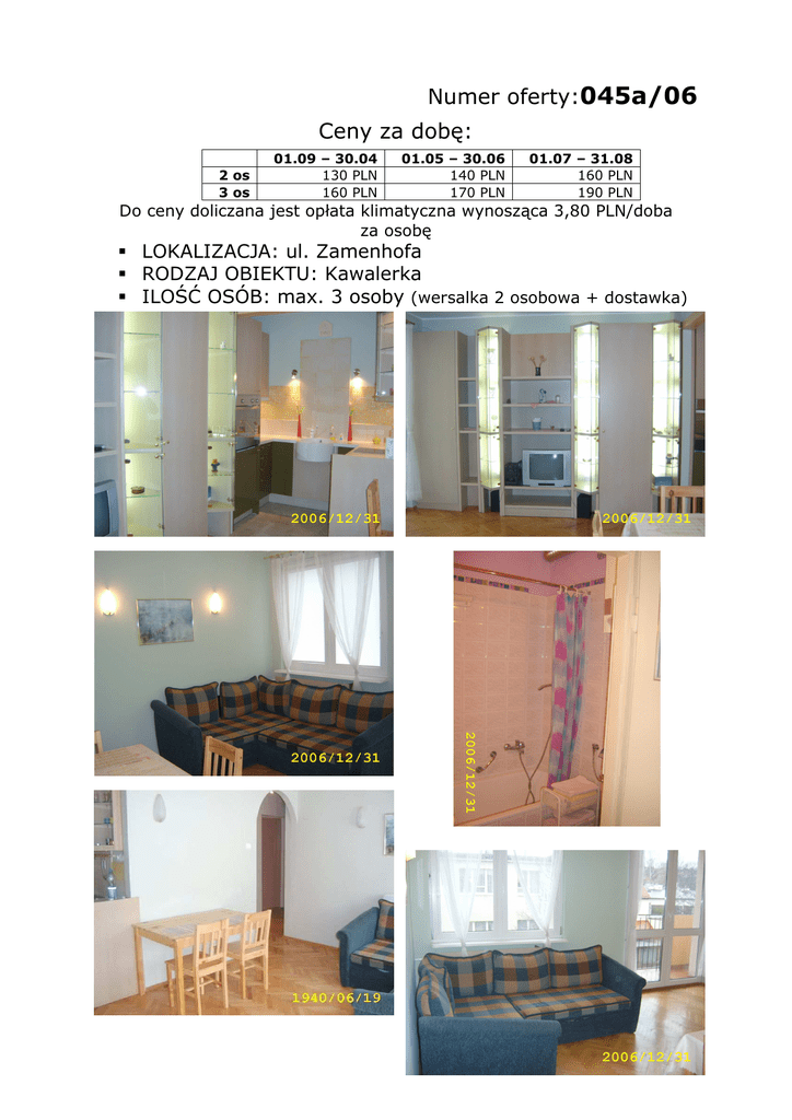 Numer oferty:045a/06 Ceny za dobę: 2 os 3 os 01.09 – 30.04 130 PLN 160 PLN 01.05 – 30.06 140 PLN 170 PLN 01.07 – 31.08 160 PLN 190 PLN Do ceny doliczana jest opłata klimatyczna wynosząca 3,80 PLN/doba za osobę LOKALIZACJA: ul. Zamenhofa RODZAJ OBIEKTU: Kawalerka ILOŚĆ OSÓB: max. 3 osoby (wersalka 2 osobowa + dostawka) Numer oferty: 045a/06 LOKALIZACJA: ul. Zamenhofa Lp. PRZEDMIOT OCENY UWAGI 1. Nowe/stare budownictwo Stare budownictwo, odnowiona klatka schodowa 2. Nowe/stare meble Nowe meble 3. Parking na posesji/GaraŜ nie 4. Balkon / taras / ogródek Balkon, mieszkanie od słonecznej strony 5. Telewizor (Kablówka, TV Sat), Radio TV kablowa, radio, sprzęt audio 6. Dostęp do telefonu Nie 7. Dostęp do internetu Nie 8. Dostęp do kuchni: • Lodówka • Kuchenka • Czajnik bezprzewodowy • WyposaŜenie (sztućce, zastawa, garnki) 9. Kuchnia z pelnym wyposaŜeniem, lodówka, kuchenka z płytą ceramiczną, czajnik bezprzewodowy, pralka, zmywarka, Dostęp do łazienki: • • • • Wanna Kabina prysznicowa Oddzielnie WC Łazienka współuŜytkowana Łazienka z WC i wanną 10. Pościel, ręczniki Tak 11. Dostęp do szafy / półek Tak 12. Pobyt ze zwierzątkiem Tylko z małym 13. Pokój zamykany na klucz Pokoje otwarte przetrzennie 14. Niepełnosprawni (winda, podjazd) Nie 15. Plac zabaw dla dzieci Około 50 m od posesji 16. 17. Lokalizacja • Centrum – Dworzec PKP • PlaŜa, park • Dzielnica • Komunikacja miejska Osoby palące Nie 18. Piwnica/schowek Tak 19. Faktura VAT lub Rachunek rachunek 20. Inne Ulica przylega do głównej przejazdowej, 10 minut do dworca PKP, blisko przystanek ZKM, 15 minut do plaŜy