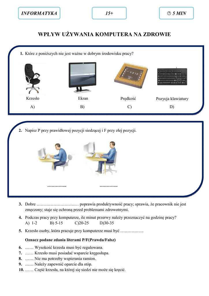 INFORMATYKA 15+ 5 MIN WPŁYW UŻYWANIA KOMPUTERA NA ZDROWIE 1. Które z poniższych nie jest ważne w dobrym środowisku pracy? Krzesło Ekran A) B) Prędkość procesora C) Pozycja klawiatury D) 2. Napisz P przy prawidłowej pozycji siedzącej i F przy złej pozycji. ………….. …………. 3. Dobre ………………………… poprawia produktywność pracy; sprawia, że pracownik nie jest zmęczony; staje się ochroną przed problemami zdrowotnymi. 4. Podczas pracy przy komputerze, ile minut przerwy należy przeznaczyć na godzinę pracy? A) 1-2 B) 5-15 C)20-25 D)30-35 5. Krzesło osoby, która pracuje przy komputerze musi być …………….. Oznacz podane zdania literami P/F(Prawda/Fałsz) 6. …… Wysokość krzesła musi być regulowana. 7. …… Krzesło musi posiadać wsparcie kręgosłupa. 8. …… Nie ma potrzeby wspierania ramion. 9. …… Należy zapewnić oparcie dla stóp. 10. …… Część krzesła, na której się siedzi nie może się kręcić. Klucz odpowiedzi 12345678910- C F….P Środowisko pracy B) ergonomiczne P P F P P