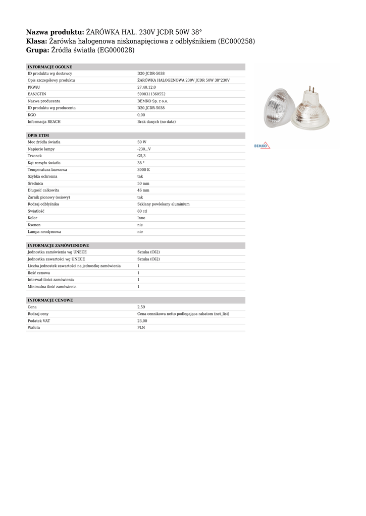 Nazwa produktu: ŻARÓWKA HAL. 230V JCDR 50W 38° Klasa: Żarówka halogenowa niskonapięciowa z odbłyśnikiem (EC000258) Grupa: Źródła światła (EG000028) INFORMACJE OGÓLNE ID produktu wg dostawcy D20-JCDR-5038 Opis szczegółowy produktu ŻARÓWKA HALOGENOWA 230V JCDR 50W 38°230V PKWiU 27.40.12.0 EAN/GTIN 5908311360552 Nazwa producenta BEMKO Sp. z o.o. ID produktu wg producenta D20-JCDR-5038 KGO 0,00 Informacja REACH Brak danych (no data) OPIS ETIM Moc źródła światła 50 W Napięcie lampy -230...V Trzonek G5,3 Kąt rozsyłu światła 38 ° Temperatura barwowa 3000 K Szybka ochronna tak Średnica 50 mm Długość całkowita 46 mm Żarnik pionowy (osiowy) tak Rodzaj odbłyśnika Szklany powlekany aluminium Światłość 80 cd Kolor Inne Ksenon nie Lampa neodymowa nie INFORMACJE ZAMÓWIENIOWE Jednostka zamówienia wg UNECE Sztuka (C62) Jednostka zawartości wg UNECE Sztuka (C62) Liczba jednostek zawartości na jednostkę zamówienia 1 Ilość cenowa 1 Interwał ilości zamówienia 1 Minimalna ilość zamówienia 1 INFORMACJE CENOWE Cena 2,59 Rodzaj ceny Cena cennikowa netto podlegająca rabatom (net_list) Podatek VAT 23,00 Waluta PLN