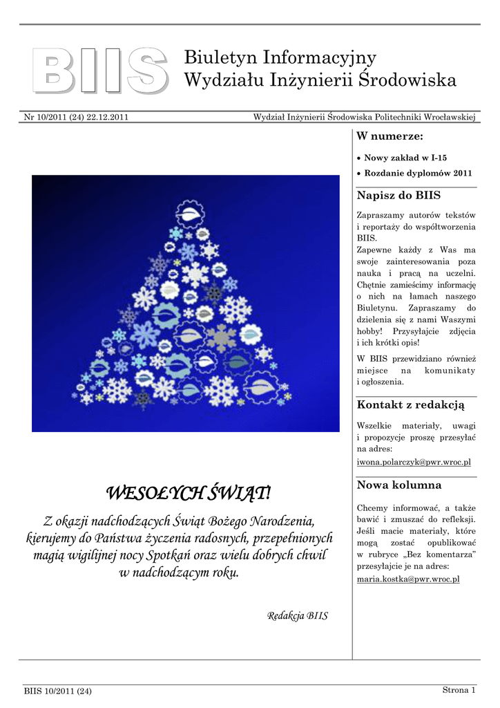 BIIS Nr 10/2011 (24) 22.12.2011 Biuletyn Informacyjny Wydziału Inżynierii Środowiska Wydział Inżynierii Środowiska Politechniki Wrocławskiej W numerze: Nowy zakład w I-15 Rozdanie dyplomów 2011 Napisz do BIIS Zapraszamy autorów tekstów i reportaży do współtworzenia BIIS. Zapewne każdy z Was ma swoje zainteresowania poza nauka i pracą na uczelni. Chętnie zamieścimy informację o nich na łamach naszego Biuletynu. Zapraszamy do dzielenia się z nami Waszymi hobby! Przysyłajcie zdjęcia i ich krótki opis! W BIIS przewidziano również miejsce na komunikaty i ogłoszenia. Kontakt z redakcją Wszelkie materiały, uwagi i propozycje proszę przesyłać na adres: [email protected] WESOŁYCH ŚWIĄT! Z okazji nadchodzących Świąt Bożego Narodzenia, kierujemy do Państwa życzenia radosnych, przepełnionych magią wigilijnej nocy Spotkań oraz wielu dobrych chwil w nadchodzącym roku. Nowa kolumna Chcemy informować, a także bawić i zmuszać do refleksji. Jeśli macie materiały, które mogą zostać opublikować w rubryce „Bez komentarza” przesyłajcie je na adres: [email protected] Redakcja BIIS BIIS 10/2011 (24) Strona 1 Nowy zakład w I-15 W Instytucie Inżynierii Ochrony Środowiska powołano nowy Zakład Biologii Sanitarnej i Ekotechniki Dziekan, działając w oparciu o § 2.8 pkt. 5 Statutu Politechniki Wrocławskiej na pisemny wniosek Dyrektora Instytutu I-15 oraz po zapoznaniu się z opinią Rady Instytutu I-15 z dnia 12.04.2011 r. powołał z dniem 2 listopada 2011 r. Zakład Instytutowy Biologii Sanitarnej i Ekotechniki. kilku lat, czego dowodem są wspólne prace badawcze i publikacje naukowe. Obecnie pracownicy nowego zakładu realizują 5 grantów: 3 granty pozyskane z MNiSW, grant w ramach Programu Operacyjnego Innowacyjna Gospodarka oraz grant z NCBiR z Poltegorem i Wodociągami Kłodzkimi. W skład Zakładu zgodnie z deklaracją pracowników wchodzi 7 osób będących nauczycielami akademickimi, a na kierownika Zakładu zgodnie z wnioskiem powołano Panią dr hab. inż. Katarzynę Piekarską, prof. nadzw. PWr. Skład osobowy Zakładu Biologii Sanitarnej i Ekotechniki tworzą: dr hab. inż. Katarzyna Piekarska, prof. PWr., kierownik dr hab. Teodora Traczewska, prof. PWr., dr inż. Agnieszka Trusz-Zdybek, dr inż. Anna Hołtra, dr inż. Dorota Zamorska-Wojdyła, dr Beata Hanus-Lorenz, mgr Izabela Biedroń. Do czasu uregulowania spraw związanych z pomieszczeniami, dostępem do aparatury członków obu Zakładów (istniejący Zakład Biologii i Ekologii oraz powołany Zakład Biologii Sanitarnej i Ekotechniki) dydaktyka do końca bieżącego semestru będzie prowadzona jak dotychczas. Dziekan powołał zespół roboczy reprezentujący oba Zakłady (Biologii i Ekologii oraz nowopowstały Zakład Biologii Sanitarnej i Ekotechniki) w celu zaproponowania uzgodnień odnośnie (podziału pomieszczeń, zasad dostępu i korzystania z aparatury, zmian organizacyjnych w sprawach pracowni obsługujących dydaktykę). Zgodnie z deklaracją Dziekana, wszystkie uzgodnienia zaakceptowane zgodnie przez oba Zakłady, będą zaakceptowane. W przypadku braku wspólnych ustaleń, Dziekan podejmie stosowne decyzje w oparciu o stosowne przepisy zawarte Statucie Politechniki Wrocławskiej. Dodatkowo deklarację przystąpienia do nowego Zakładu złożyły 3 osoby z grupy pracowników inżynieryjnotechnicznych. Pracownicy Zakładu Biologii Sanitarnej i Ekotechniki to w większości grupa osób współpracujących ze sobą od dr hab. inż. Jan Danielewicz, prof. nadzw. PWr. Rozdanie dyplomów 2011 W piątek, 2 grudnia 2011 w Auli Politechniki Wrocławskiej odbyło się uroczyste wręczenie dyplomów Absolwentom Wydziału Inżynierii Środowiska. W uroczystości uczestniczył JM Rektor PWr prof. dr hab. Tadeusz Więckowski, co jest wyróżnieniem w skali Uczelni. stanu i będą w miarę sił wpływali na postęp w dziedzinie inżynierii środowiska. Jako pierwszym dyplomy wręczono dziesięciu najlepszym Absolwentom Naszego Wydziału. Laureaci konkursu TOP 10 otrzymali dyplomy i wyróżnienia z rąk JM Rektora i Dziekana WIS, następnie zostali nagrodzeni oklaskami i fanfarami. W roku 2011 najlepszym Absolwentem Naszego Wydziału został mgr inż. Andrzej Kuczaj. Kolejne miejsca w rankingu TOP 10 zajęli: 2) mgr inż. Tomasz Łoziński, 3) mgr inż. Marika Malewska, 4) mgr inż. Daniel Sacoto Kaczmarek, 5) mgr inż. Marcin Czekaj, 6) mgr inż. Paweł Hodowany, 7) mgr inż. Marek Sidorczyk, 8) mgr inż. Piotr Sobczyński, 9) mgr inż. Aleksandra Bilko i 10) mgr inż. Barbara Kossowska. Dziesięciu najlepszych Absolwentów otrzymało wyróżniającą się odznakę absolwenta w kolorze złotym. Tegoroczna uroczystość była szczególna z jeszcze jednego powodu – było to ostatnie oficjalne wręczeniem dyplomów Absolwentom studiów jednolitych magisterskich (5-cio letnich). Jak co roku nie brakowało pożegnań, podziękowań, wzruszeń i łez. Uroczystość rozpoczęła się przemówieniami JM Rektora i Dziekana Naszego Wydziału. Następnie wszyscy Absolwenci złożyli uroczyste ślubowanie, że jako Absolwent Politechniki Wrocławskiej podczas wykonywania moich obowiązków będą postępowali sumiennie i gorliwie, będą przestrzegali czci swego BIIS 10/2011 (24) Dziesięciu najlepszych Absolwentów 2011 Strona 2 Kolejną wyróżnioną grupą byli Absolwenci, którzy otrzymali na dyplomie ukończenia studiów ocenę bardzo dobrą lub celującą. W tym roku osób takich było aż 33 (21 Pań i 12 Panów). Wręczenia dyplomów i wyróżnień dokonali JM Rektor i Dziekan WIS. Ponownie były oklaski i fanfary! Nasi Absolwenci zdobywają również nagrody w konkursach zewnętrznych. Podczas uroczystości w Auli wręczono wyróżnienia laureatom konkursu Dolnośląskiej Okręgowej Izby Inżynierów Budownictwa na najlepszą pracę dyplomową dotyczącą problemów i zagadnień z zakresu inżynierii środowiska w dziedzinach objętych uprawnieniami budowlanymi. Nagrody w tym konkurs