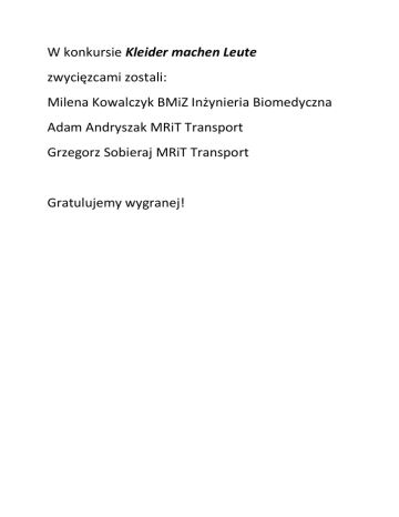 W konkursie Kleider machen Leute zwycięzcami zostali: Milena Kowalczyk BMiZ Inżynieria Biomedyczna Adam Andryszak MRiT Transport Grzegorz Sobieraj MRiT Transport Gratulujemy wygranej!