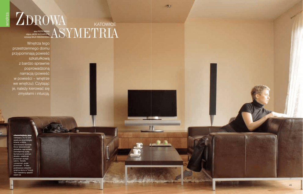 wnętrza ZDROWA tekst PIOTR BARAN zdjęcia JACEK KUCHARCZYK stylizacja MAJA KWAŚNIEWSKA KATOWICE ASYMETRIA Wnętrza tego przestrzennego domu przypominają powieść szkatułkową z bardzo sprawnie poprowadzoną narracją (powieść w powieści – wnętrze we wnętrzu). Czytając je, należy kierować się zmysłami i intuicją. ciemniejszy pas zawijający się na sufit opada po przeciwległej ścianie, w którą wmontowano kominek. Ekran telewizora jest dokładnie naprzeciwko żaroodpornej szyby. Symetryczne centrum określa i stabilizuje przestrzeń dużego salonu. Światło i przestrzeń, pusta przestrzeń... to dwa podstawowe składniki wnętrza domu w Tunezji. Tam inwestorzy spędzili osiem lat 1 44 45 matowe szkło pod stopniami i w wypełnieniu ściany (pomiędzy klatką schodową a salonem) ma rozbijać (rozrzedzać) monolit bryły schodów. W ten sposób klatka schodowa staje się lżejsza Asymetria w salonie cieszy się doskonałym zdrowiem. To dlatego, że z czegoś wynika i do czegoś prowadzi chcąc cieszyć się przestrzenią, którą oferuje duży salon, nie należy przeładowywać go nadmiernie dekoracyjnymi meblami. Dlatego ulubiona komoda pani domu ustąpiła miejsca kubicznej szafce, na której stanęło kubiczne kino domowe 46 C harakterystyczne dla stylu projektowania Oli Wo∏czyk jest jej przywiàzanie do geometrii. JeÊli architektka decyduje si´ na podzia∏ ∏azienki w oparciu o konkretny modu∏ p∏ytki, na przyk∏ad 30x60 cm, to wiadomo, ˝e b´dzie wola∏a przesunàç Êciany, ni˝ zaburzyç t´ proporcj´. Tak zdarzy∏o si´ w ostatnio opisywanym przez nas cz´stochowskim mieszkaniu. Tym razem zlecono jej projekt urzàdzenia trzykondygnacyjnego domu-bliêniaka w Katowicach. Przy u˝yciu geometrii Ola postanowi∏a uporzàdkowaç, ale i o˝ywiç ogromnà otwartà przestrzeƒ dolnej kondygnacji. Przestrzeƒ... mo˝e nie tyle pustà, ile pozbawionà nadmiaru mebli. Na ˝yczenie w∏aÊcicieli – ekonomistki i profesora politechniki. wyższa symetria W rozmowie na temat tej realizacji co rusz pada postulat „zdrowej asymetrii”. Mo˝na by si´ wi´c zastanowiç: kiedy asymetria we wn´trzu jest zdrowa? I czy w tym przy- padku rzeczywiÊcie nic jej nie dolega? Weêmy elementy sta∏e, pozostajàce wobec siebie w jakichÊ relacjach. Takie pó∏eczki przy kominku (widoczne na zdj´ciu powy˝ej) – jedna wysuni´ta do przodu, druga lekko cofni´ta, do tego na ró˝nych wysokoÊciach. Nad nimi pion wylotu ciep∏ego powietrza – równoleg∏y do osi Êciany, w którà wbudowano wk∏ad kominkowy, ale te˝ znacznie od tej osi odsuni´ty. Taka ewidentna asymetria powinna budziç niepokój. A jednak czujemy si´ z nià komfortowo. Pewnie dlatego, ˝e architektka odnios∏a jà do czegoÊ wy˝szego. CzegoÊ, co w danym wn´trzu ustanawia ∏ad i porzàdek. Spójrzmy jeszcze raz – jeÊli wyimaginowanà linià przed∏u˝ymy pion wylotu powietrza, to oka˝e si´, ˝e w miejscu, w którym owa linia styka si´ z poziomem ni˝szej pó∏ki, powstaje kàt prosty. Tam „na styk” parkuje prostokàt obramowania szyby kominka. Gdyby t´ samà lini´ (wyprowadzonà z pionu wylotu powietrza) wypuÊciç z kolei na sufit, po∏àczy∏aby szereg lamp halogenowych, tak jak przezroczysta ˝y∏ka ∏àczy koraliki. Wszystko to 1 47 Przejrzysta klatka schodowa służy dzieje si´ w obszarze szerokiego pasa wyznaczonego przez Êcian´ kominka. Pas zawija si´ na sufit i schodzi po przeciwleg∏ej Êcianie salonu. To w∏aÊnie on wyznacza g∏ówny podzia∏, a poprzez to staje si´ punktem (linià) odniesienia dla wszelkich póêniejszych ingerencji w przestrzeƒ wn´trza (∏àcznie z ustawieniem p∏askiego telewizora o du˝ej przekàtnej ekranu). Mo˝na Êmia∏o powiedzieç, ˝e pas stabilizuje czy te˝ równowa˝y wn´trze, które z jednej strony chce nam si´ pokazaç jako grzeczne, a z drugiej jako nieoczywiste i zaskakujàce. ekspozycji pamiątkowych obrazów schody pozbawiono klasycznej balustrady. Jej miejsce zajęły stalowe linki zatopione w sztucznym tworzywie eLpaso szafka oddzielająca jadalnię od kuchni (po prawej) jest wielofunkcyjna. Od strony kuchni służy jako schowek na drobiazgi, od strony jadalni – jako stolik. Pasy forniru zebrano podkreślają geometrię mebli (zwłaszcza górnych półek), a jednocześnie zmiękczają tę geometrię swoją ciepłą barwą 48 Geometria nowoczesnych wn´trz bywa elegancka, choç ch∏odna i twarda – jak brzmienie j´zyka niemieckiego. Na szcz´Êcie ta proponowana przez Ol´ Wo∏czyk budzi cieplejsze uczucia. Trzymajàc si´ lingwstycznego porównania: geometria, którà pos∏uguje si´ architektka, uleg∏a zmi´kczeniu niczym niemiecki w ustach S∏owianina. Ola zmi´kczy∏a jà, wykorzystujàc odpowiednie materia∏y (Êciana kominka zbudowana jest z pasiastego piaskowca, pod∏ogi zaÊ z jasnego drewna), i wprowadzajàc wspomnianà o˝ywczà asymetri´. W katowickim domu przyjemnych, emocjonujàcych niespodzianek znajdziemy wi´cej, na przyk∏ad w strefie kuchni (otwartej na salon). Pó∏ki w formie odwróconych od siebie liter „L” ubrano tu w fornir pasiastego drewna zebrano (gra on w kolory z fornirem wenge du˝ej szafy kuchennej). – Kszta∏t i pasiasty wzór pó∏ek nawiàzujà do delikatnych pasów piaskowca w salonie – wyjaÊnia Ola Wo∏czyk. Niespodziankà, a wr´cz kompletnym zaskoczeniem jest ca∏a dolna toaleta (dla goÊci). To wn´trze „si´ nie zapowiada” – jak mówi architektka. Na zewnàtrz mamy do czynienia z klasycznymi orzechowymi drzwiami osadzonymi w orzechowych futrynach. Po ich otwarciu, czeka nas jednak... strza∏ mi´dzy oczy. W nieco technicznym, szarym wn´- 1 49 Dorosła łazienka jest „prostokreślna” – zaprojektowano ją w oparciu o moduł 30x60 cm wanna mogła się znaleźć tak nisko, bo robiąc wylewkę, pozostawiono w podłodze otwór o głębokości 10 cm. Podest wykończono drewnem merbau, które pojawia się także w podświetlonych wnękac