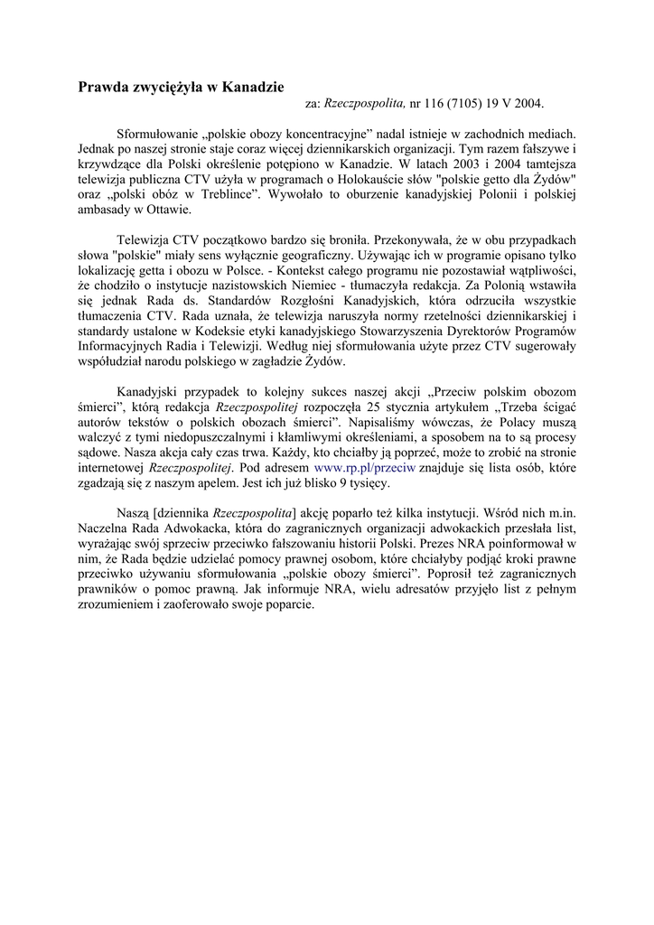 Prawda zwyciężyła w Kanadzie za: Rzeczpospolita, nr 116 (7105) 19 V 2004. Sformułowanie „polskie obozy koncentracyjne” nadal istnieje w zachodnich mediach. Jednak po naszej stronie staje coraz więcej dziennikarskich organizacji. Tym razem fałszywe i krzywdzące dla Polski określenie potępiono w Kanadzie. W latach 2003 i 2004 tamtejsza telewizja publiczna CTV użyła w programach o Holokauście słów "polskie getto dla Żydów" oraz „polski obóz w Treblince”. Wywołało to oburzenie kanadyjskiej Polonii i polskiej ambasady w Ottawie. Telewizja CTV początkowo bardzo się broniła. Przekonywała, że w obu przypadkach słowa "polskie" miały sens wyłącznie geograficzny. Używając ich w programie opisano tylko lokalizację getta i obozu w Polsce. - Kontekst całego programu nie pozostawiał wątpliwości, że chodziło o instytucje nazistowskich Niemiec - tłumaczyła redakcja. Za Polonią wstawiła się jednak Rada ds. Standardów Rozgłośni Kanadyjskich, która odrzuciła wszystkie tłumaczenia CTV. Rada uznała, że telewizja naruszyła normy rzetelności dziennikarskiej i standardy ustalone w Kodeksie etyki kanadyjskiego Stowarzyszenia Dyrektorów Programów Informacyjnych Radia i Telewizji. Według niej sformułowania użyte przez CTV sugerowały współudział narodu polskiego w zagładzie Żydów. Kanadyjski przypadek to kolejny sukces naszej akcji „Przeciw polskim obozom śmierci”, którą redakcja Rzeczpospolitej rozpoczęła 25 stycznia artykułem „Trzeba ścigać autorów tekstów o polskich obozach śmierci”. Napisaliśmy wówczas, że Polacy muszą walczyć z tymi niedopuszczalnymi i kłamliwymi określeniami, a sposobem na to są procesy sądowe. Nasza akcja cały czas trwa. Każdy, kto chciałby ją poprzeć, może to zrobić na stronie internetowej Rzeczpospolitej. Pod adresem www.rp.pl/przeciw znajduje się lista osób, które zgadzają się z naszym apelem. Jest ich już blisko 9 tysięcy. Naszą [dziennika Rzeczpospolita] akcję poparło też kilka instytucji. Wśród nich m.in. Naczelna Rada Adwokacka, która do zagranicznych organizacji adwokackich przesłała list, wyrażając swój sprzeciw przeciwko fałszowaniu historii Polski. Prezes NRA poinformował w nim, że Rada będzie udzielać pomocy prawnej osobom, które chciałyby podjąć kroki prawne przeciwko używaniu sformułowania „polskie obozy śmierci”. Poprosił też zagranicznych prawników o pomoc prawną. Jak informuje NRA, wielu adresatów przyjęło list z pełnym zrozumieniem i zaoferowało swoje poparcie.