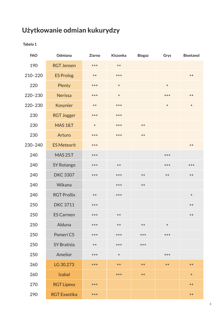 Użytkowanie odmian kukurydzy Tabela 1 FAO Odmiana Ziarno Kiszonka Biogaz Grys Bioetanol 190 RGT Jensen +++ ++ 210–220 ES Prolog ++ +++ 220 Plenty +++ + + 220–230 Nerissa +++ + +++ ++ 220–230 Kosynier ++ +++ + + 230 RGT Jogger +++ +++ 230 Mas 18.T + +++ ++ 230 Arturo +++ +++ ++ 230–240 ES Meteorit +++ 240 Mas 25.T +++ 240 SY Rotango +++ ++ 240 DKC 3307 +++ +++ ++ 240 Wikana +++ ++ 240 RGT Prollix ++ 250 DKC 3711 +++ 250 ES Carmen +++ ++ 250 Alduna +++ ++ ++ + 250 Pomeri CS +++ +++ +++ +++ 250 SY Bratisla ++ +++ +++ 250 Amelior +++ + 260 LG 30.273 +++ ++ ++ 260 Izabal +++ ++ 270 RGT Lipexx +++ ++ 290 RGT Exxotika +++ ++ ++ ++ +++ +++ +++ ++ ++ +++ + ++ ++ +++ ++ ++ + 3