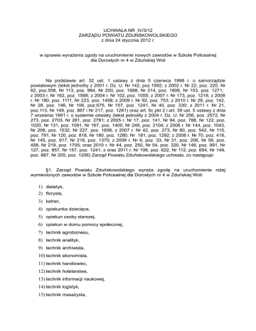 UCHWAŁA NR IV/3/12 ZARZĄDU POWIATU ZDUŃSKOWOLSKIEGO z dnia 24 stycznia 2012 r. w sprawie wyrażenia zgody na uruchomienie nowych zawodów w Szkole Policealnej dla Dorosłych nr 4 w Zduńskiej Woli Na podstawie art. 32 ust. 1 ustawy z dnia 5 czerwca 1998 r. o samorządzie powiatowym (tekst jednolity z 2001 r. Dz. U. Nr 142, poz.1592; z 2002 r. Nr 22, poz. 220, Nr 62, poz.558, Nr 113, poz. 984, Nr 200, poz. 1688, Nr 214, poz. 1806, Nr 153, poz. 1271; z 2003 r. Nr 162, poz. 1568; z 2004 r. Nr 102, poz. 1055; z 2007 r. Nr 173, poz. 1218; z 2008 r. Nr 180, poz. 1111, Nr 223, poz. 1458; z 2009 r. Nr 92, poz. 753; z 2010 r. Nr 28, poz. 142, Nr 28, poz. 146, Nr 106, poz.675, Nr 157, poz. 1241, Nr 40, poz. 230; z 2011 r. Nr 21, poz.113, Nr 149, poz. 887 i Nr 217, poz. 1281) oraz art. 5c pkt 2 i art. 39 ust. 5 ustawy z dnia 7 września 1991 r. o systemie oświaty (tekst jednolity z 2004 r. Dz. U. Nr 256, poz. 2572, Nr 273, poz. 2703, Nr 281, poz. 2781; z 2005 r. Nr 17, poz. 141, Nr 94, poz. 788, Nr 122, poz. 1020, Nr 131, poz. 1091, Nr 167, poz. 1400, Nr 249, poz. 2104; z 2006 r. Nr 144, poz. 1043, Nr 208, poz. 1532, Nr 227, poz. 1658; z 2007 r. Nr 42, poz. 273, Nr 80, poz. 542, Nr 115, poz. 791, Nr 120, poz. 818, Nr 180, poz. 1280, Nr 181, poz. 1292; z 2008 r. Nr 70, poz. 416, Nr 145, poz. 917, Nr 216, poz. 1370; z 2009 r. Nr 6, poz. 33, Nr 31, poz. 206, Nr 56, poz. 458, Nr 219, poz. 1705; oraz 2010 r. Nr 44, poz. 250, Nr 54, poz. 320, Nr 148, poz. 991, Nr 127, poz. 857, Nr 157, poz. 1241; z oraz 2011 r. Nr 106, poz. 622, Nr 112, poz. 654, Nr 149, poz. 887, Nr 205, poz. 1206) Zarząd Powiatu Zduńskowolskiego uchwala, co następuje: §1. Zarząd Powiatu Zduńskowolskiego wyraża zgodę na uruchomienie niżej wymienionych zawodów w Szkole Policealnej dla Dorosłych nr 4 w Zduńskiej Woli: 1) dietetyk, 2) florysta, 3) kelner, 4) opiekunka dziecięca, 5) opiekun osoby starszej, 6) opiekun w domu pomocy społecznej, 7) technik agrobiznesu, 8) technik analityk, 9) technik archiwista, 10) technik ekonomista, 11) technik handlowiec, 12) technik hotelarstwa, 13) technik informacji naukowej, 14) technik logistyk, 15) technik masażysta, 16) technik obsługi turystycznej, 17) technik ochrony fizycznej i mienia, 18) technik ochrony środowiska, 19) technik organizacji reklamy, 20) technik organizacji usług gastronomicznych, 21) technik prac biurowych, 22) technik spedytor, 23) technik turystyki wiejskiej, 24) technik usług pocztowych i telekomunikacyjnych, 25) technik usług pocztowych i finansowych, 26) technik żywienia i gospodarstwa domowego, 27) terapeuta zajęciowy. §2. Wykonanie uchwały powierza się Staroście Zduńskowolskiemu. §3. Uchwała wchodzi w życie z dniem podjęcia. Przewodniczący Zarządu: Wojciech Rychlik Członkowie Zarządu: Witold Oleszczyk Marcin Łabędzki Elżbieta Andruszkiewicz Andrzej Witczak