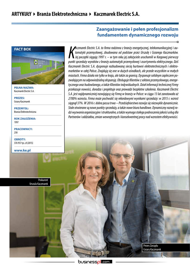 ARTYKUŁYBranża Elektrotechniczna Kaczmarek Electric S.A. Zaangażowanie i pełen profesjonalizm fundamentem dynamicznego rozwoju FACT BOX PEŁNA NAZWA: Kaczmarek Electric S.A. PREZES: Cezary Kaczmarek PRZEMYSŁ: Branża Elektrotechniczna ROK ZAŁOŻENIA: 1997 K aczmarek Electric S.A. to firma rodzinna z branży energetycznej, telekomunikacyjnej i automatyki przemysłowej, zbudowana od podstaw przez Urszulę i Cezarego Kaczmarków. Jej początki sięgają 1997 r. – w tym roku jej założyciele uruchomili w Kargowej pierwszy punkt sprzedaży wyrobów z branży automatyki przemysłowej i asortymentu elektrycznego. Dziś Kaczmarek Electric S.A. dysponuje rozbudowaną siecią hurtowni elektrotechnicznych i elektromarketów w całej Polsce. Znajdują się one w dużych ośrodkach, ale przede wszystkim w małych miastach. Firma działa nie tylko w kraju, ale także za granicą. Dysponuje solidnym zapleczem pozwalającym na odpowiedzialną ekspansję. Obsługuje Klientów z sektora przemysłowego, energetycznego oraz budowlanego, a także Klientów indywidualnych. Dział informacji technicznej Firmy przekazuje nowości, doradza i projektuje oraz prowadzi bezpłatne szkolenia. Kaczmarek Electric S.A. jest najdynamiczniej rozwijającą się Firmą w branży w Polsce: w ciągu 13 lat zanotowała aż 2700% wzrostu. Firma może pochwalić się rekordowymi wynikami sprzedaży: w 2015 r. wzrost sięgnął 37%. W 2016 r. dobra passa trwa – Przedsiębiorstwo rozwija się niezwykle dynamicznie. Stale otwierane są nowe punkty sprzedaży, a także nowe biura handlowe. Dynamiczny rozwój rodzi wyzwania organizacyjne i strukturalne, a także wymaga stałego podnoszenia jakości usług dla Partnerów i oddziałów, zmian wewnętrznych i konsekwentnej pracy nad wzrostem efektywności. PRACOWNICY: 230 OBROTY: 376 957 tys. zł (2015) www.ke.pl Prokurent Urszula Kaczmarek Prezes Zarządu Cezary Kaczmarek Trzy kluczowe wartości – partnerstwo, pasja i profesjonalizm Firma Kaczmarek Electric S.A. od początku swojego istnienia jest rozwijana w oparciu o trzy wartości: partnerstwo, pasję i profesjonalizm. Oferuje profesjonalne usługi i wsparcie, stawia na prawdziwe partnerstwo w biznesie i w swoich działaniach kieruje się pasją. Z pewnością to ludzie są kluczem do sukcesu Firmy, dlatego tak ważny jest szacunek dla Klientów, Dostawców i pracowników. Dzięki takiemu podejściu Kaczmarek Electric S.A. cieszy się opinią Firmy godnej zaufania. Przedsiębiorstwo może pochwalić się wypracowanym przez lata modelem sprzedaży, który umożliwia generowanie coraz lepszych wyników. Formuła, w której działa już ponad 59 oddziałów i większość nowo otwieranych to tak zwany elektromarket. W takim systemie kluczowa jest dostępność. Firma wykorzystuje zalety bezpośredniej pracy z Klientem (rzetelna obsługa i serwis), dodatkowo oferując zorganizowaną przestrzeń typową dla marketów, gdzie Klient może zobaczyć wszystko, do czego w tradycyjnej hurtowni zwykle nie ma się dostępu. Taki model sprzedaży w Kaczmarek Electric S.A. sprawdza się doskonale. Liczby mówią wiele Dzięki sieci 82 oddziałów Kaczmarek Electric S.A. jest zawsze blisko Klienta. Z Firmą pracuje obecnie 239 wykwalifikowanych handlowców. Tylko w 2015 r. Przedsiębiorstwu zaufało 28 910 odbiorców i dodatkowo 100 000 Klientów detalicznych. Kaczmarek Electric S.A. oferuje: 17 000 produktów w stałej ofercie w punktach sprzedaży, dostęp do 34 000 linii produktowych w ofercie magazynowej, produkty 560 dostawców w ofercie handlowej, dostawę w 24 h, fachową pomoc i wsparcie specjalistów na każdym etapie. Sercem Firmy jest Centrum Logistyczne w Powodowie, z magazynem o powierzchni 5 tys. m² i placem kablowym liczącym 20 tys. m². Znajduje się tu 16 690 linii produktowych. Centrum obsługuje Klientów przez 24 godziny na dobę. Powyższe liczby potwierdzają imponującą dynamikę rozwoju Przedsiębiorstwa. O kluczu do sukcesu Firmy rozmawiamy z Prezesem Kaczmarek Electric S.A. Panem Cezarym Kaczmarkiem. Panie Prezesie, jakie momenty były najważniejsze w rozwoju Państwa Firmy? W historii Kaczmarek Electric S.A. było kilka momentów zwrotnych wyznaczających etapy rozwoju naszej sieci. W 1997 r. otworzyliśmy pierwszy sklep w Kargowej, rok później pierwszą hurtownię w Karpicku koło Wolsztyna, a w 1999 r. – w Poznaniu. W 2001 r. rozpoczęliśmy działalność pod nazwą Kaczmarek Electric. Już rok później wyszliśmy poza rynek lokalny, otwierając oddziały w Białymstoku i Wrocławiu. W tym samym roku powstał pierwszy oddział agencyjny – w Zbąszyniu. Od tego momentu co roku otwieraliśmy jeden lub dwa nowe oddziały. W 2005 r. po raz pierwszy otrzymaliśmy Gazelę Biznesu – wyróżnienie przyznawane przez magazyn Puls Biznesu dla najszybciej rozwijających się średnich przedsiębiorstw. W kolejnych latach powtarzaliśmy ten sukces, otrzymując nagrodę 8 razy, aż Firma rozwinęła się na tyle, że przekroczyła określony próg przychodów. Ważnym momentem był dla nas także rok 2007 – kiedy zostaliśmy współtwórcą grupy Elektro-Holding. W 2009 r. otworzyliśmy Centrum Logistyczne w Powodowie, a rok później przekształciliśmy się w spółkę akcyjną. W kolejnych latach obroty Firmy stale rosły. Otwieraliśmy coraz więcej oddziałów-agencji i zdobywaliśmy kolejne nagrody i wyróżnienia, takie jak Gazele Biznesu czy Gepardy Biznesu. Zajmowaliśmy coraz wyższe pozycje w rankingach najdynamiczniej rozwijających się firm. Przełomowym momentem był rok 2012, w którym przejęliśmy BMK Centrum Elektroinstalacji, dzięki czemu otworzyliśmy 8 oddziałów – w Chorzowie, Katowicach, Jaworzu, Dąbrowie Górniczej, Radomiu, Kielcach, Krakowie i Nowym Sączu. W tym samym roku powstało jeszcze 5 nowych oddziałów: w Grudziądzu, Kłodzku, Sławie, Świeciu i Toruniu. Chciałbym podkreślić, że otwarcie każdego nowego oddziału, elektromarketu czy biura handlowego jest dla