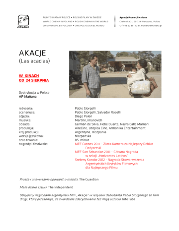 AKACJE (Las acacias) W KINACH OD 24 SIERPNIA Dystrybucja w Polsce AP Mañana reżyseria: scenariusz: zdjęcia: muzyka: obsada: produkcja: kraj produkcji: wersja językowa: czas trwania: nagrody i festiwale: Pablo Giorgelli Pablo Giorgelli, Salvador Roselli Diego Poleri Martin Limanovich Germán de Silva, Hebe Duarte, Nayra Calle Mamani AireCine, Utópica Cine, Armonika Entertainment Argentyna, Hiszpania hiszpańska 85 minut MFF Cannes 2011 – Złota Kamera za Najlepszy Debiut Reżyserski MFF San Sebastian 2011 – Główna Nagroda w sekcji „Horizontes Latinos” Srebrny Kondor 2012 - Nagroda Stowarzyszenia Argentyńskich Krytyków Filmowych dla Najlepszego Filmu Prosta i uniwersalna opowieść o miłości. The Guardian Małe dzieło sztuki. The Independent Obsypany nagrodami argentyński film „Akacje” w reżyserii debiutanta Pablo Giorgellego to film drogi, który przekonuje, że twardziele zdecydowanie też mają uczucia. InfoTuba Akacja to drzewo potężne, twarde i mocne, ale pełne kolców, które mogą skaleczyć, jeśli za bardzo się do niego zbliżymy. Taki właśnie jest Rubén, zamknięty w sobie kierowca ciężarówki przewożącej drewno, udający się w służbową podróż do Argentyny. Wyjeżdżając z Paragwaju zabiera ze sobą Jacintę, która wraz z pięciomiesięczną córeczką Anahí chce dostać się do Buenos Aires w poszukiwaniu lepszego życia. Przypadkowo połączeni przez los bohaterowie nic o sobie nie wiedzą, nie zadają zbędnych pytań, ale w miarę upływu kolejnych kilometrów pozbywają się dzielącego ich skrępowania i dystansu. AKACJE to poetycki film drogi przywołujący na myśl najlepsze dokonania Carlosa Sorina (PROSTE HISTORIE, BOMBON: EL PERRO). To opowieść o trudnej komunikacji z drugim człowiekiem, pokazująca, że wzajemne porozumienie rodzi się często nie tyle w wyniku słów, co drobnych gestów życzliwości. Wspólna podróż zbliża bohaterów i nieoczekiwanie zmienia ich życie. W swym debiutanckim filmie, nagrodzonym Złotą Kamerą na MFF Cannes 2011, Pablo Giorgelli opowiada uniwersalną historię o otwieraniu się na drugiego człowieka i ludzkiej zdolności do przemiany, z pięknymi zdjęciami argentyńskich bezdroży, która zdobyła już uznanie publiczności i jurorów na całym świecie. Reżyser Pablo Giorgelli o filmie: Pomysł na AKACJE powstał w bardzo trudnym okresie mojego życia. Mój ojciec zachorował, w Argentynie zapanował poważny kryzys gospodarczy, a ja nie miałem pracy i byłem w trakcie rozwodu. Byłem załamany i czułem potrzebę opowiedzenia o tym innym. Nie wiedziałem jednak, jak to zrobić. Niedługo potem, 5-6 lat temu, kiedy zacząłem pracę nad tym projektem, na nowo odnalazłem się w życiu. Poznałem kobietę, która jest dzisiaj moją żoną. Historia opowiedziana w AKACJACH odzwierciedla moją osobistą podróż i przemianę, opowiada o cierpieniu z powodu straty i narodzeniu się na nowo. Kwestia ojcostwa jest dla mnie osobiście bardzo ważna – podobnie jak dla Rubena. BOHATEROWIE ZAMKNIĘCI W CIĘŻARÓWCE Zastanawiałem się nad scenografią filmu i doszedłem do wniosku, że chcę opowiedzieć historię zamkniętego w sobie kierowcy ciężarówki, konfliktu wewnętrznego, jaki nim targa oraz relacji, która rozwija się pomiędzy nim a młodą kobietą. Wpadłem na pomysł, by być zawsze blisko bohaterów. Zafascynowała mnie wizja, by filmować tylko ich punkt widzenia, tylko to, co oni widzą, nie zaś punkt widzenia reżysera umiejscowiony gdzieś daleko poza kadrem. Dlatego w filmie nie ma muzyki, a krajobrazy widać tylko przez szybę ciężarówki. Tak właśnie widzą je bohaterowie. To tak jakby stworzyć im małe pudełko, w którym mogą oddychać. Wszystko, co dzieje się w jego środku jest ważne, a wszystko poza nim nie ma znaczenia. Na początku obawiałem się trochę, że film może stać się nieco monotonny albo klaustrofobiczny. Zrobiłem kilka prób, które bardzo dobrze wypadły, co przekonało mnie, że to najlepszy sposób, by przedstawić historię rozgrywającą się w AKACJACH. INSPIRACJE FILMOWE Uwielbiam PROSTĄ HISTORIĘ Davida Lyncha – to dobra paralela tego, co chciałem osiągnąć w AKACJACH. Kocham także Abbasa Kiarostamiego oraz kino włoskie. Podobają mi się też filmy w zupełnie innym stylu, jak chociażby dzieła Michaela Manna. Tak naprawdę interesują mnie wszystkie gatunki filmowe. Mimo to uważam, że AKACJE to swojego rodzaju UFO, powstało znikąd, a ja świadomie nie inspirowałem się żadnym dziełem. Chociaż tak naprawdę reżyserzy filmowi są jak wampiry – cały czas korzystamy z twórczości innych. Możliwe, że dziś mi coś opowiesz, a ja za jakiś czas, podczas tworzenia scenariusza będę przekonany, że to mój własny pomysł, choć tak wcale nie jest. Przynajmniej nie do końca. PRACA NA PLANIE Bardzo długo przygotowywaliśmy się do realizacji filmu. Byliśmy przygotowani na różne warianty i nagłe zmiany planów. Ponieważ wiele scen jest zbyt trudnych do kręcenia w ruchu, korzystaliśmy ze sztucznej ciężarówki na przyczepie. Po stronie kamery mieliśmy 40 osób z ekipy filmowej jadących różnymi pojazdami. Musieliśmy brać pod uwagę korki oraz zmiany pogody i pogodzić to wszystko z rytmem dobowym małego dziecka. Mieliśmy dublera małej Anahí – jej o miesiąc młodszego kuzyna, używaliśmy także lalki. To była bardzo ciężka, 7 – kilogramowa, lalka, ponieważ chciałem, by aktorka na planie czuła jej ciężar. Inaczej wyglądałaby na zbyt zrelaksowaną, a dziecko na zbyt lekkie. DOBÓR AKTORÓW Na początku do roli Rubena szukałem kierowcy ciężarówki. Chciałem zrobić film bez profesjonalnych aktorów, gdzie występowaliby prawdziwi ludzie. Szukałem przez ponad rok, nie chciałem jednak improwizować na planie. Szybko zorientowałem się, że aby pracować z naturszczykami trzeba się im całkowicie poddać, podczas gdy ja pragnąłem być wierny scenariuszowi. Dialogi by