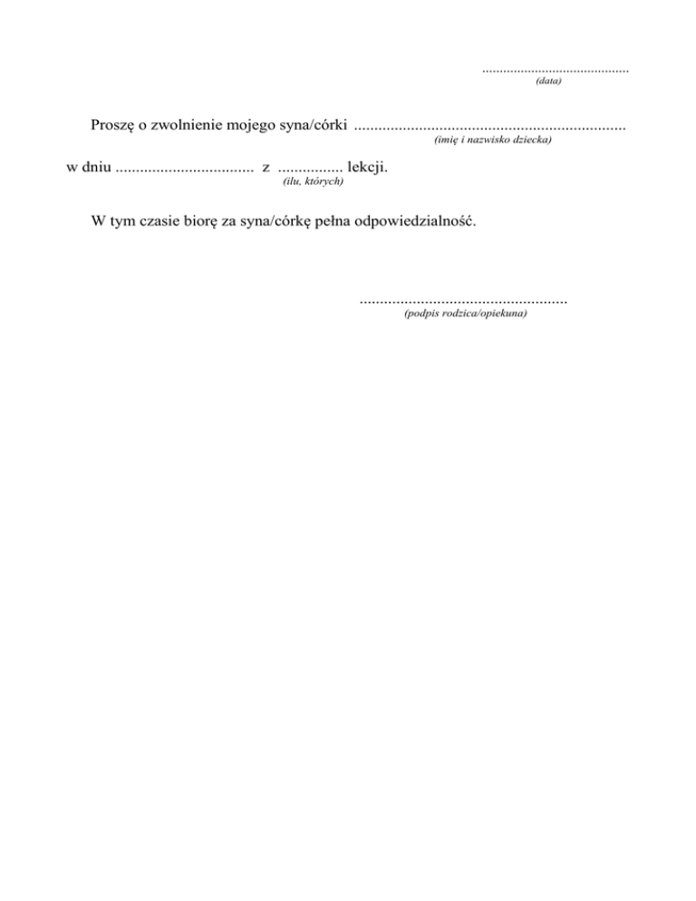 .......................................... (data) Proszę o zwolnienie mojego syna/córki ................................................................... (imię i nazwisko dziecka) w dniu .................................. z ................ lekcji. (ilu, których) W tym czasie biorę za syna/córkę pełna odpowiedzialność. ................................................... (podpis rodzica/opiekuna)