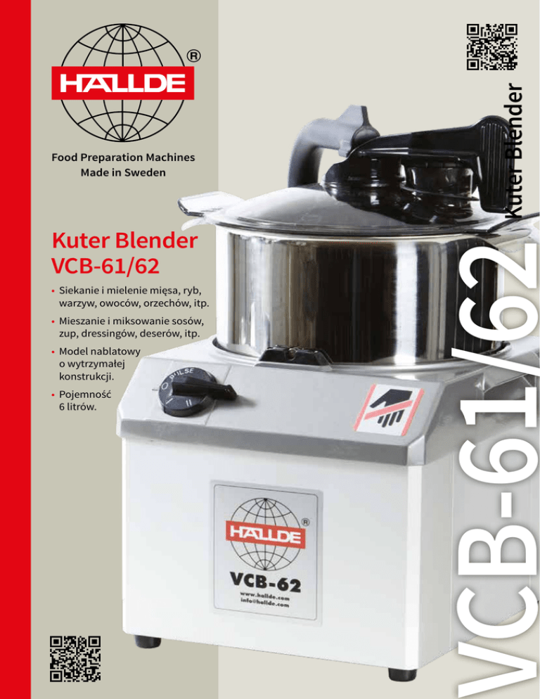 • Siekanie i mielenie mięsa, ryb, warzyw, owoców, orzechów, itp. • Mieszanie i miksowanie sosów, zup, dressingów, deserów, itp. • Model nablatowy o wytrzymałej konstrukcji. • Pojemność 6 litrów. VCB-61/62 Kuter Blender VCB-61/62 Kuter Blender Food Preparation Machines Made in Sweden Mocna maszyna dla profesjonalistów Model VCB firmy HÄLLDE to najczęściej używany kuter-blender w branży. Dzięki swoim unikanym funkcjom szybkiej obróbki produktów i wytrzymałej konstrukcji urządzenie nadaje się do wszystkich profesjonalnych kuchni – zarówno do restauracji, jak i do placówek zbiorowego żywienia. Wysoka wydajność i przemyślana pokrywa Misa o pojemności sześciu litrów jest wyposażona w szczelną pokrywę i podwyższoną rurę środkową. Pozwala to zwiększyć objętość netto przetwarzanych produktów płynnych do 4,3 litra. W pokrywie znajduje się rura podająca o średnicy 5 cm, która umożliwia podawanie produktów podczas pracy urządzenia. Odpowiednio dobrane prędkości Model VCB-62 ma dwie prędkości robocze: 1500 obr/min do delikatniejszej obróbki i dla lepszej kontroli podczas siekania produktów oraz 3000 obr/min do szybkiego miksowania lub mieszania sosów albo farszów. Model VCB-61 dysponuje tylko niższą z podanych prędkości. Urządzenie VCB ma również funkcję natychmiastowego włączenia obrotów maksymalnych. Funkcja ta pozwala uzyskać prędkość 1500 obr/min bez niepożąda nego opóźnienia. brzegi, co eliminuje niepotrzebne zagłębienia, w których mogłyby utknąć resztki żywności. W podstawie urządzenia znajduje się otwór odpływowy, który zapobiega gromadzeniu się wody. Wszystkie ruchome części można łatwo odłączyć, co pozwala na ich szybkie oczyszczenie i łatwe umycie urządzenia. Wszystkie ruchome części można umyć w zmywarce. Wzorowe bezpieczeństwo Urządzenie VCB ma trzy oddzielne wyłączniki bezpieczeństwa. Oznacza to, że można je uruchomić tylko wtedy, gdy zarówno misa, pokrywa, jak i ramię zabezpieczające są prawidłowo zamontowane. Model VCB posiada mechaniczny hamulec silnika, który sprawia, że noże przestają się obracać natychmiast po wyłączeniu urządzenia. Dzięki temu, że hamulec silnika jest mechaniczny, działa on również w przypadku usterki elektrycznej lub przerwy w zasilaniu. Ergonomiczna budowa Do sterowania urządzeniem służy pokrętło, które zastępuje większą liczbę przycisków. Pokrętło jest umieszczone z lewej strony, co umożliwia podawanie produktów prawą ręką. Wysokość, na której znajduje się pokrętło, pozwala zacho wać ergonomiczną pozycję podczas pracy. Wyłącznie najlepsze materiały Podstawa jest wykonana z wytrzymałego metalu. Misa jest wykonana ze stali nierdzewnej, a pokrywa i ramiona zgarniające z wytrzymałego xylex. Zamocowanie noży wykonano z wysokiej jakości aluminium, a same noże ze stali nierdzewnej. Konstrukcja zapewniająca maksymalną higienę Urządzenie VCB jest wykonane wyłącznie z materiałów posiadających certyfikaty higieniczne. Posiada ono gładkie powierzchnie i zaokrąglone Maksymalna niezawodność Unikalna sekcja miksująca Opatentowany system zgarniający Mocny silnik modelu VCB dysponuje dużym momentem obrotowym podczas rozruchu oraz pracy urządzenia, a sekcja miksująca jest napędzana bezpośrednio. Bez pasków i elementów sprzęgających. Dzięki temu urządzenie VCB jest bardzo niezawodne – niezależnie od przetwarzanych produktów. Silnik jest wyposażony w hamulec mechaniczny, dzięki któremu napęd, a wraz z nim sekcja miksująca, przestaje się obracać natychmiast po otwarciu ramienia zabezpieczającego. Silnik urządzenia VCB ma także zabezpieczenie termiczne, które zapobiega jego przegrzaniu. Sekcja miksująca urządzenia VCB ma unikalną opatentowaną konstrukcję. W odróżnieniu od tradycyjnych urządzeń tego typu ma ona cztery noże, zamiast dwóch. Dwa duże noże rozdrabniają produkt, natomiast dwa mniejsze noże kierują produkt do noży rozdrabniających i przekręcają go. Pozwala to znacznie skrócić czas obróbki i uzyskać bardziej równomierny rezultat. Noże rozdrabniające mają ząbki, dzięki czemu dłużej pozostają ostre. Podczas przygotowywania produktów w urządzeniach typu kuter-blender występuje ryzyko wzrostu temperatury na skutek tarcia produktu o noże. Kształt sekcji miksującej pozwala ograniczyć to zjawisko do minimum. Urządzenie VCB jest wyposażone w specjalny system zgarniający, który zapobiega przywieraniu przetwarzanych produktów w tych miejscach misy i pokrywy, gdzie nie dochodzą noże. Ramiona zgarniające utrzymują wnętrze pokrywy i misy w czystości. Jednocześnie kierują produkt z powrotem w kierunku noży. System zgarniający modelu VCB ma cztery ramiona. Jest to opatentowane rozwiązanie, dzięki któremu zostaje skutecznie zatrzymany ruch obrotowy produktu w misie, a produkt jest kierowany z powrotem w kierunku noży. Pozwala to znacznie skrócić czas obróbki i zmniejszyć ilość ciepła wytwarzanego w misie. Doskonały i równomierny rezultat obróbki za każdym razem Można pokusić się o stwierdzenie, że rezultaty uzyskiwane za pomocą modelu VCB należą do najlepszych wśród urządzeń typu kuter-blender. Wynika to ze sposobu współpracy misy, systemu zgarniającego i sekcji miksującej. 1 Gdy sekcja miksująca obraca się, duże noże rozdrabniają produkt, jednocześnie popychając go do przodu i dociskając do ścianek misy. 2. Gdy produkt dotrze do brzegu misy, jego ruch obrotowy zostaje zatrzymany przez cztery ramiona zgarniające i produkt zostaje odrzucony z powrotem w kierunku noży. 3. Podczas gdy system zgarniający utrzymuje produkt z dala od wnętrza misy, sześciokątny kształt sekcji miksującej powoduje, że produkt odbija się od środka. 4. Mniejsze noże przekręcające, które stanowią unikalną cechę modelu VCB, dociskają produkt do noży rozdrabniających i przekręcają go, dzi