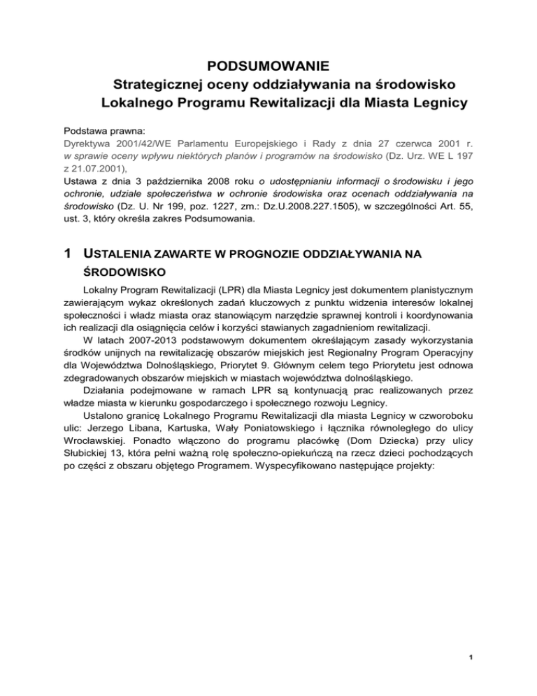 PODSUMOWANIE Strategicznej oceny oddziaływania na środowisko Lokalnego Programu Rewitalizacji dla Miasta Legnicy Podstawa prawna: Dyrektywa 2001/42/WE Parlamentu Europejskiego i Rady z dnia 27 czerwca 2001 r. w sprawie oceny wpływu niektórych planów i programów na środowisko (Dz. Urz. WE L 197 z 21.07.2001), Ustawa z dnia 3 października 2008 roku o udostępnianiu informacji o środowisku i jego ochronie, udziale społeczeństwa w ochronie środowiska oraz ocenach oddziaływania na środowisko (Dz. U. Nr 199, poz. 1227, zm.: Dz.U.2008.227.1505), w szczególności Art. 55, ust. 3, który określa zakres Podsumowania. 1 USTALENIA ZAWARTE W PROGNOZIE ODDZIAŁYWANIA NA ŚRODOWISKO Lokalny Program Rewitalizacji (LPR) dla Miasta Legnicy jest dokumentem planistycznym zawierającym wykaz określonych zadań kluczowych z punktu widzenia interesów lokalnej społeczności i władz miasta oraz stanowiącym narzędzie sprawnej kontroli i koordynowania ich realizacji dla osiągnięcia celów i korzyści stawianych zagadnieniom rewitalizacji. W latach 2007-2013 podstawowym dokumentem określającym zasady wykorzystania środków unijnych na rewitalizację obszarów miejskich jest Regionalny Program Operacyjny dla Województwa Dolnośląskiego, Priorytet 9. Głównym celem tego Priorytetu jest odnowa zdegradowanych obszarów miejskich w miastach województwa dolnośląskiego. Działania podejmowane w ramach LPR są kontynuacją prac realizowanych przez władze miasta w kierunku gospodarczego i społecznego rozwoju Legnicy. Ustalono granicę Lokalnego Programu Rewitalizacji dla miasta Legnicy w czworoboku ulic: Jerzego Libana, Kartuska, Wały Poniatowskiego i łącznika równoległego do ulicy Wrocławskiej. Ponadto włączono do programu placówkę (Dom Dziecka) przy ulicy Słubickiej 13, która pełni waŜną rolę społeczno-opiekuńczą na rzecz dzieci pochodzących po części z obszaru objętego Programem. Wyspecyfikowano następujące projekty: 1 Zadania przewidziane do realizacji w rejonie ul. Henryka PoboŜnego Lp. 1 2 3 4 5 6 7 8 Nazwa zadania Odnowa zdegradowanych obszarów miejskich w rejonie ul. Henryka PoboŜnego – przebudowa dróg na obszarze rewitalizowanym Odnowa zdegradowanych obszarów miejskich w rejonie ul. H. PoboŜnego - modernizacja sieci wodno - kanalizacyjnej w ulicach H. PoboŜnego i B. Chrobrego Odnowa zdegradowanych obszarów miejskich w rejonie ul. H. PoboŜnego - renowacja części wspólnych wielorodzinnych budynków mieszkalnych Odnowa zdegradowanych obszarów miejskich w rejonie ul. H. PoboŜnego - budowa ogrodu zabaw dla dzieci Odnowa zdegradowanych obszarów miejskich w rejonie ul. H. PoboŜnego - Adaptacja Willi Bolka von Richthofena wraz z zagospodarowaniem terenu na potrzeby Środowiskowego Centrum Integracyjno – Profilaktycznego. Odnowa zdegradowanych obszarów miejskich w rejonie ul. H. PoboŜnego - zagospodarowanie oraz utworzenie estetycznych i funkcjonalnych przestrzeni publicznych Odnowa zdegradowanych obszarów miejskich w rejonie ul. H. PoboŜnego - modernizacja infrastruktury przestrzeni publicznej ul. Libana Odnowa zdegradowanych obszarów miejskich w rejonie ul. H. PoboŜnego - przebudowa ulicy Libana Okres realizacji 2008- 2010 2009-2010 2009-2012 2008-2009 2009-2012 2009-2012 2009-2012 2011-2012 Zadania dla obszaru powojskowego przy ul. Słubickiej 13 Lp. 1 2 Nazwa zadania Wsparcie infrastruktury uŜytkowanej przez Dom Dziecka p.w. Matki Boskiej Częstochowskiej Zgromadzenia Sióstr św. ElŜbiety w Legnicy pełniącego kluczową funkcję społeczną Zagospodarowanie terenu powojskowego - budowa drobnej infrastruktury przestrzeni publicznej przy ul. Słubickiej 13 w Legnicy Okres realizacji 2011- 2012 2011- 2012 Realizacja projektów wyspecyfikowanych w Lokalnym Programie Rewitalizacji będzie polegała na realizacji zadań, głównie inwestycyjnych, które będą ingerować w środowisko przede wszystkim na etapie ich realizacji, powodując przejściowe uciąŜliwości. Największy wpływ na środowisko w trakcie budowy będą miały: ⇒ emisja zanieczyszczeń pochodzących ze spalania paliwa w silnikach spalinowych pojazdów mechanicznych uŜywanych w trakcie prac budowlanych i w silnikach pojazdów cięŜkich, obsługujących budowę, ⇒ hałas spowodowany pracą sprzętu mechanicznego, ⇒ odpady powstające w czasie wykonywania robót ziemnych i budowlanych. Przy prawidłowo prowadzonym procesie budowlanym uciąŜliwości te nie będą miały charakteru ponadnormatywnego. Generalnie uciąŜliwości związane z realizacją zadań zapisanych w LPR będą uciąŜliwościami przejściowymi, odwracalnymi i wystąpią jedynie w czasie prowadzonych robót. Realizacja zadań określonych w LPR, przyczyniając się do osiągnięcia celów zakładanych w tym dokumencie, przyczyni się jednocześnie do poprawy warunków środowiskowych na rewitalizowanym terenie. 2 • • • • Realizacja LPR będzie miała pozytywny wpływ na takie elementy środowiska jak: krajobraz, ze względu na realizację zadań związanych z poprawą estetyki przestrzeni publicznej uwzględniających krajobraz kulturowy miasta, klimat akustyczny w składowej generowanej przez ruch drogowy – w związku z naprawą nawierzchni ulic, jakość wód, ze względu na realizację zadań związanych z porządkowaniem gospodarki wodno-ściekowej; poprawę poziomu Ŝycia i bezpieczeństwo mieszkańców – m. in. poprzez remont chodników, odwodnienie terenów wnętrz blokowych oraz poprawę oświetlenia terenu. Na terenie objętym programem rewitalizacji oraz w jego otoczeniu nie występują Ŝadne formy ochrony przyrody (nie licząc przylatujących tu ptaków i nietoperzy, które mogą występować na strychach domów). Obiekt wpisany do rejestru zabytków (pierwotnie kościół ewangelicki, obecnie zbór „Anastasis”, ul. Henryka PoboŜnego 7) nie jest zagroŜony realizacją Programu, natomiast liczne obiekty wpisane do wykazu zabytków (stare kamienice czynszowe) są prz