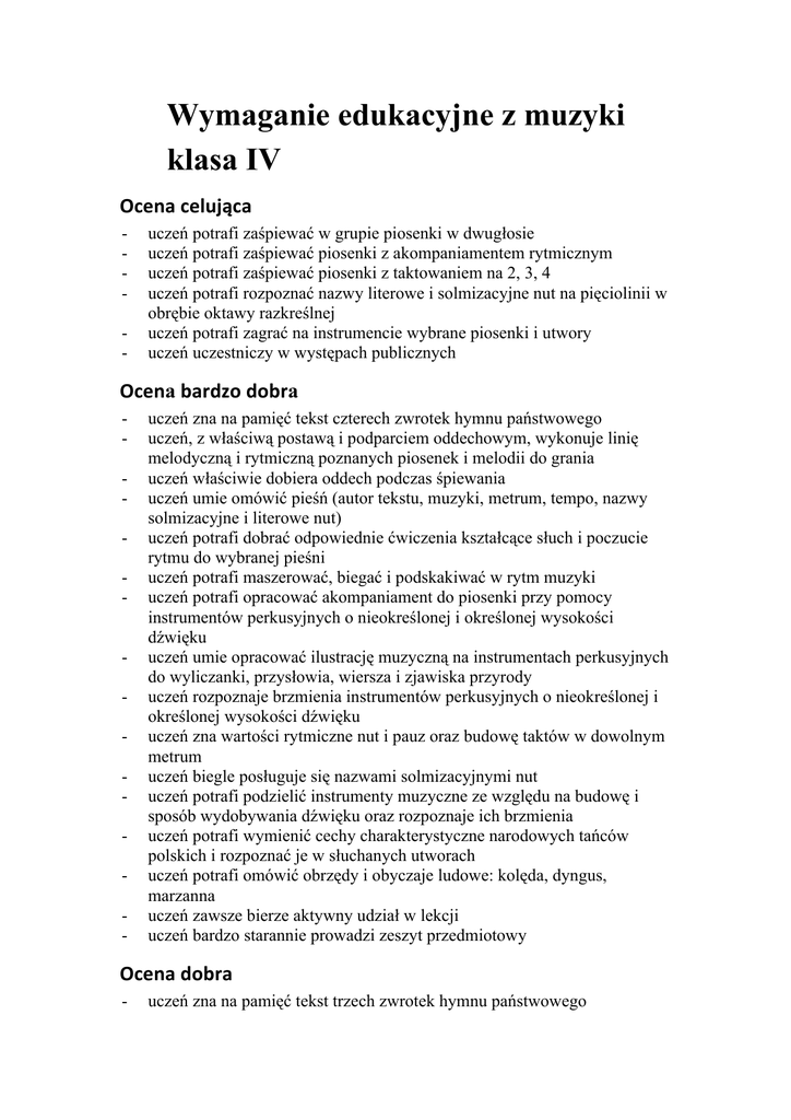 Wymaganie edukacyjne z muzyki klasa IV Ocena celująca - uczeń potrafi zaśpiewać w grupie piosenki w dwugłosie uczeń potrafi zaśpiewać piosenki z akompaniamentem rytmicznym uczeń potrafi zaśpiewać piosenki z taktowaniem na 2, 3, 4 uczeń potrafi rozpoznać nazwy literowe i solmizacyjne nut na pięciolinii w obrębie oktawy razkreślnej uczeń potrafi zagrać na instrumencie wybrane piosenki i utwory uczeń uczestniczy w występach publicznych Ocena bardzo dobra - uczeń zna na pamięć tekst czterech zwrotek hymnu państwowego uczeń, z właściwą postawą i podparciem oddechowym, wykonuje linię melodyczną i rytmiczną poznanych piosenek i melodii do grania uczeń właściwie dobiera oddech podczas śpiewania uczeń umie omówić pieśń (autor tekstu, muzyki, metrum, tempo, nazwy solmizacyjne i literowe nut) uczeń potrafi dobrać odpowiednie ćwiczenia kształcące słuch i poczucie rytmu do wybranej pieśni uczeń potrafi maszerować, biegać i podskakiwać w rytm muzyki uczeń potrafi opracować akompaniament do piosenki przy pomocy instrumentów perkusyjnych o nieokreślonej i określonej wysokości dźwięku uczeń umie opracować ilustrację muzyczną na instrumentach perkusyjnych do wyliczanki, przysłowia, wiersza i zjawiska przyrody uczeń rozpoznaje brzmienia instrumentów perkusyjnych o nieokreślonej i określonej wysokości dźwięku uczeń zna wartości rytmiczne nut i pauz oraz budowę taktów w dowolnym metrum uczeń biegle posługuje się nazwami solmizacyjnymi nut uczeń potrafi podzielić instrumenty muzyczne ze względu na budowę i sposób wydobywania dźwięku oraz rozpoznaje ich brzmienia uczeń potrafi wymienić cechy charakterystyczne narodowych tańców polskich i rozpoznać je w słuchanych utworach uczeń potrafi omówić obrzędy i obyczaje ludowe: kolęda, dyngus, marzanna uczeń zawsze bierze aktywny udział w lekcji uczeń bardzo starannie prowadzi zeszyt przedmiotowy Ocena dobra - uczeń zna na pamięć tekst trzech zwrotek hymnu państwowego - uczeń poprawnie dobiera oddech podczas śpiewania uczeń zna kilka ćwiczeń kształcących słuch i poczucie rytmu uczeń rozróżnia brzmienie instrumentów perkusyjnych z podziałem ze względu na sposób wydobywania dźwięku uczeń zna wartości rytmiczne nut i budowę taktów w dowolnym metrum uczeń zna nazwy solmizacyjne nut uczeń potrafi podzielić instrumenty muzyczne ze względu na budowę i sposób wydobywania dźwięku uczeń zna cechy charakterystyczne polskich tańców narodowych uczeń potrafi wymienić obrzędy i obyczaje ludowe: kolęda, dyngus, marzanna i omówić jeden z nich uczeń bierze aktywny udział w lekcji uczeń starannie prowadzi zeszyt przedmiotowy Ocena dostateczna - uczeń zna na pamięć tekst dwóch zwrotek hymnu państwowego uczeń rozróżnia brzmienia instrumentów perkusyjnych z podziałem na instrumenty o nieokreślonej i określonej wysokości dźwięku uczeń zna wartości rytmiczne nut oraz budowę taktów prostych uczeń czyta nazwy solmizacyjne nut uczeń potrafi podzielić instrumenty muzyczne ze względu na ich budowę uczeń zna nazwy polskich tańców narodowych uczeń potrafi wymienić obrzędy i obyczaje ludowe uczeń sporadycznie bierze aktywny udział w lekcji uczeń prowadzi zeszyt przedmiotowy Ocena dopuszczjąca - uczeń zna na pamięć tekst pierwszej zwrotki hymnu państwowego uczeń rozróżnia brzmienia instrumentów uczeń zna wartości rytmiczne nut uczeń ma ogóle wiadomości na temat folkloru muzycznego uczeń nie bierze aktywnie udziału lekcji Ocenę niedostateczną uczeń otrzymuje tylko w sytuacjach wyjątkowych. Uczeń ma negatywny stosunek do przedmiotu oraz posiada bardzo duże braki z zakresu ustalonych podstawowych wymagań edukacyjnych, dotyczących wiadomości i umiejętności w klasie czwartej. Mimo pomocy nauczyciela nie potrafi i nie chce wykonać nawet najprostszych poleceń wynikających z programu klasy czwartej. Nie prowadzi również zeszytu ćwiczeń. klasa V 2 Ocena celująca Ocenę celującą otrzymuje uczeń, który przejawia wyjątkowe zdolności i zainteresowania muzyką, oraz posiada umiejętności i wiadomości wymagane na ocenę bardzo dobrą. Ponadto powinien wyróżniać się przynajmniej jedną z wymienionych aktywności: − brać czynny udział w wybranej formie artystycznej w szkole lub poza szkołą, − brać udział w konkursach, festiwalach i przeglądach, zdobywać nagrody lub wyróżnienia na szczeblu gminnym, powiatowym, wojewódzkim, − wykazywać zainteresowania literaturą muzyczną wykraczającą poza program klasy V. Ocenę bardzo dobrą otrzymuje uczeń, który: − bardzo dobrze śpiewa pod względem intonacyjnym i rytmicznym, − potrafi zaśpiewać z pamięci kilka piosenek z kl. V, − śpiewa z pamięci trzy zwrotki Roty. − posługuje się zapisem muzycznym przy grze na dzwonkach chromatycznych, − rozpoznaje i określa cechy utworów muzycznych poznanych w klasie V, − zna podstawowe elementy muzyki i potrafi je zastosować, − rozumie znaczenie terminów i pojęć poznanych w klasie V, − zna nazwiska i twórczość kompozytorów poznanych w kl. V, − na bieżąco prowadzi zeszyt przedmiotowy i zeszyt ćwiczeń. Ocenę dobrą otrzymuje uczeń, który: − − − − − − − − − w śpiewie popełnia drobne błędy (głównie rytmiczne), potrafi zaśpiewać z pamięci kilka piosenek z kl. V, śpiewa z pamięci dwie zwrotki Roty popełnia drobne błędy rytmiczne w grze na instrumencie, rozpoznaje i określa cechy utworów muzycznych poznanych w klasie V, zna podstawowe elementy muzyki i potrafi je zastosować rozumie znaczenie większości terminów muzycznych i wie, co one oznaczają, zna nazwiska kompozytorów poznanych w kl. V, na bieżąco prowadzi zeszyt przedmiotowy i zeszyt ćwiczeń. 3 Ocenę dostateczną otrzymuje uczeń, który: − w śpiewie popełnia dużo błędów (głównie intonacyjnych), − potrafi zaśpiewać dwie samodzielnie wybrane piosenki z po