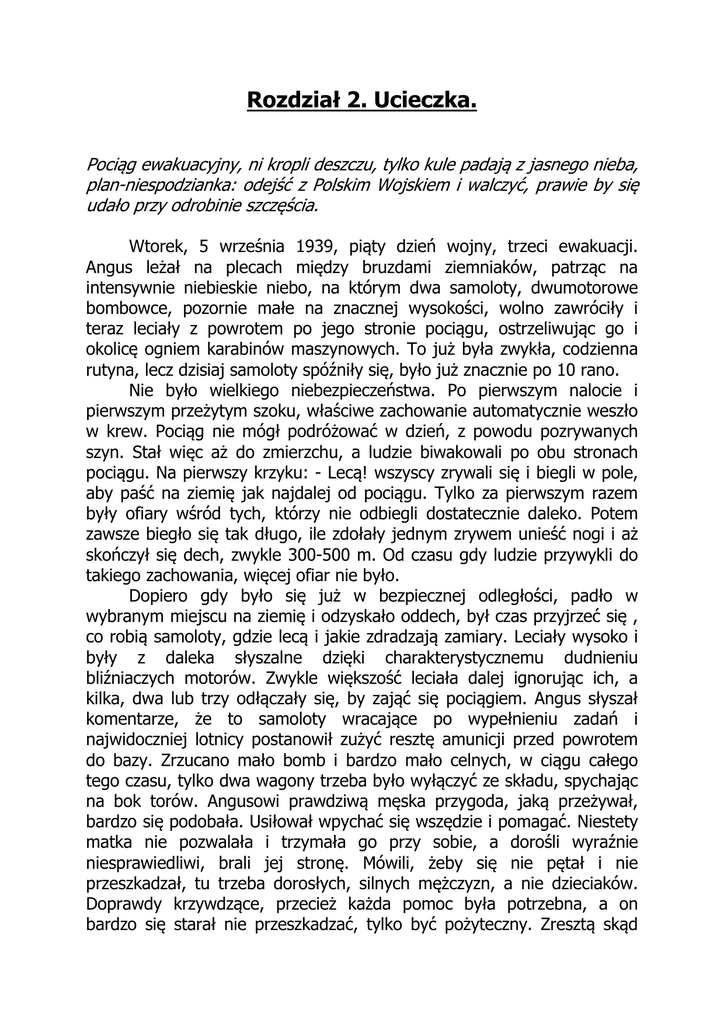 Rozdział 2. Ucieczka. Pociąg ewakuacyjny, ni kropli deszczu, tylko kule padają z jasnego nieba, plan-niespodzianka: odejść z Polskim Wojskiem i walczyć, prawie by się udało przy odrobinie szczęścia. Wtorek, 5 września 1939, piąty dzień wojny, trzeci ewakuacji. Angus leżał na plecach między bruzdami ziemniaków, patrząc na intensywnie niebieskie niebo, na którym dwa samoloty, dwumotorowe bombowce, pozornie małe na znacznej wysokości, wolno zawróciły i teraz leciały z powrotem po jego stronie pociągu, ostrzeliwując go i okolicę ogniem karabinów maszynowych. To już była zwykła, codzienna rutyna, lecz dzisiaj samoloty spóźniły się, było już znacznie po 10 rano. Nie było wielkiego niebezpieczeństwa. Po pierwszym nalocie i pierwszym przeżytym szoku, właściwe zachowanie automatycznie weszło w krew. Pociąg nie mógł podróżować w dzień, z powodu pozrywanych szyn. Stał więc aż do zmierzchu, a ludzie biwakowali po obu stronach pociągu. Na pierwszy krzyku: - Lecą! wszyscy zrywali się i biegli w pole, aby paść na ziemię jak najdalej od pociągu. Tylko za pierwszym razem były ofiary wśród tych, którzy nie odbiegli dostatecznie daleko. Potem zawsze biegło się tak długo, ile zdołały jednym zrywem unieść nogi i aż skończył się dech, zwykle 300-500 m. Od czasu gdy ludzie przywykli do takiego zachowania, więcej ofiar nie było. Dopiero gdy było się już w bezpiecznej odległości, padło w wybranym miejscu na ziemię i odzyskało oddech, był czas przyjrzeć się , co robią samoloty, gdzie lecą i jakie zdradzają zamiary. Leciały wysoko i były z daleka słyszalne dzięki charakterystycznemu dudnieniu bliźniaczych motorów. Zwykle większość leciała dalej ignorując ich, a kilka, dwa lub trzy odłączały się, by zająć się pociągiem. Angus słyszał komentarze, że to samoloty wracające po wypełnieniu zadań i najwidoczniej lotnicy postanowił zużyć resztę amunicji przed powrotem do bazy. Zrzucano mało bomb i bardzo mało celnych, w ciągu całego tego czasu, tylko dwa wagony trzeba było wyłączyć ze składu, spychając na bok torów. Angusowi prawdziwą męska przygoda, jaką przeżywał, bardzo się podobała. Usiłował wpychać się wszędzie i pomagać. Niestety matka nie pozwalała i trzymała go przy sobie, a dorośli wyraźnie niesprawiedliwi, brali jej stronę. Mówili, żeby się nie pętał i nie przeszkadzał, tu trzeba dorosłych, silnych mężczyzn, a nie dzieciaków. Doprawdy krzywdzące, przecież każda pomoc była potrzebna, a on bardzo się starał nie przeszkadzać, tylko być pożyteczny. Zresztą skąd wziąć tych zdrowych i silnych mężczyzn, przecież tacy poszli na wojnę, jak jego ojciec i mieli co innego do roboty. Lecz matka mówiła również, że obecnie jest jedynym mężczyzną w rodzinie, ponosi pełną odpowiedzialność za wszystko. Powinien przede wszystkim opiekować się starą i słabą matką, nie oddalać się i stale na nią uważać, na wypadek, gdyby potrzebowała pomocy. Był to z jej strony zabieg dyplomatyczny, próba manipulacji i Angus nie był aż tak naiwny, żeby nie zdawać sobie z tego sprawy. Mama wprawdzie nie była młoda, urodziła Angusa w rekordowym wówczas wieku 45 lat, a więc miała teraz 56, lecz wszystko było w porządku z jej zdrowiem, nie licząc trochę nadwagi. Mówiąc krótko, za dużo i za dobrego jedzenia, zbyt wygodne życie i mało ruchu (dokładnie to samo dotyczyło syna, przesadnie chronionego i chowanego pod kloszem). Teraz, właśnie podczas ewakuacji choroba serca, reumatyzm i wszystkie inne dolegliwości zniknęły. Przy kilku "biegach po zdrowie" dziennie, stała się sprawna jak nigdy i doprawdy nie łatwo przychodziło dotrzymać jej kroku, kiedy uciekała z linii ognia. Nigdy dotąd nie udało się Angusowi zająć lepszej pozycji, niż druga po starcie do biegu na hasło "lecą". Teraz leżała też o jakieś 30 m. z przodu, inni ludzie rozproszeni podobnie. Pole kartofli było najlepszym miejscem podczas ostrzału. Teraz też nie rzucano bomb, Niemcy ograniczali się tylko do wygodnego ćwiczenia w strzelaniu do żywych celów z wysokości 1500 2000m. To był jeden z ostatnich pociągów ewakuacyjnych i nie miał szans odjechać daleko, faktycznie był już złapany w pułapce i mogli go traktować jako swój łup. Nie było celu bombardować go i niszczyć. Ostrzał ludzi z karabinów maszynowych to tylko rozrywka, rodzaj polowania; a może do fasonu należało wracać dopiero po zużyciu całej amunicji. Odwrócony od słońca i patrząc wprost na samoloty Angus widział przez większość czasu migotanie drobnych iskierek na bokach. Uczucie raczej dziwne, czytać o tym w książkach to jednak nie to samo. Wiele razy marzył, żeby znaleźć się naprawdę pod ogniem, oczywiście zachowując się odważnie jak bohater. W książkach opisywano zawsze dzielnych bohaterów w mundurach wielokrotnie przestrzelonych, pełnych dziur od kul. Dla nich to była drobnostka. A on, tutaj, czuł się nagi i całkowicie bezbronny; kurczył się starając stać się jak najmniejszy i próbował zgadnąć, gdzie trafi go pierwsza kula. W rękę, czy w brzuch, czy w jedno z innych miejsc, których miał o wiele za dużo. Nie chciał obrócić się na brzuch, ani zamykać oczu, uważał, że byłby to wstyd wobec nieprzyjaciela, a jednak wymagało wysiłku, żeby patrzeć spokojnie; najchętniej wcisnąłby się w ziemię. Jednocześnie przez cały czas zdawał sobie sprawę, że nie znajduje się w niebezpiecznej strefie, że kule padają bliżej pociągu, ale to było jeszcze gorsze. Czy mógł być w gruncie rzeczy tchórzem, jak to pisano, zwykłym nędznym tchórzem? Czy wszystkie jego marzenia miałyby okazać się daremne? Co miał zrobić ze sobą, gdyby okazało się, że jednak jest takim drugorzędnym śmieciem? Może, chociaż zdoła udawać odwagę, nie pokazać tego strachu w środku? Jeżeli to, co czuł to jest naprawdę s