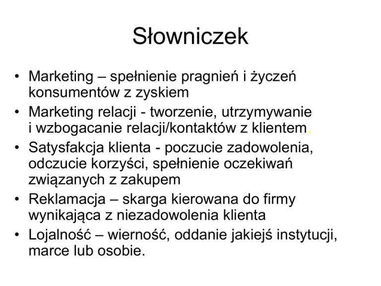 Słowniczek • Marketing – spełnienie pragnień i życzeń konsumentów z zyskiem • Marketing relacji - tworzenie, utrzymywanie i wzbogacanie relacji/kontaktów z klientem. • Satysfakcja klienta - poczucie zadowolenia, odczucie korzyści, spełnienie oczekiwań związanych z zakupem • Reklamacja – skarga kierowana do firmy wynikająca z niezadowolenia klienta • Lojalność – wierność, oddanie jakiejś instytucji, marce lub osobie.