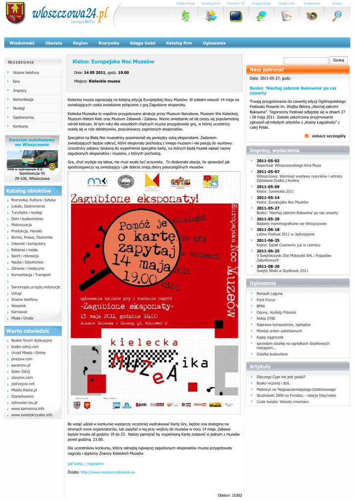 Dodaj Firmę Wiadomości Oświata NI E Z B E D N I K Region Rozrywka Księga Gości Katalog firm Katalog Firm Ponidzie TV Dnia: 14 05 2011, godz. 19.00 Kino Miejsce: Kieleckie muzea Gastronomia Konkursy Dworzec autobusowy we Włoszczowie O głoszenia Szukaj Ogłoszenia Szukaj Nasz patronat Data: 2011-05-27, godz: Busko: 'Niechaj zabrzmi Bukowina' po raz czwarty Imprezy Noclegi Dodaj Info Kielce: Europejska Noc Muzeów Wazne telefony Komunikacja Księga Gości Kieleckie muzea zapraszają na kolejną edycję Europejskiej Nocy Muzeów. W sobotni wieczór 14 maja na zwiedzających czeka zwiedzanie połączone z grą Zagubione eksponaty. Kielecka Muzeaika to wspólnie przygotowane atrakcje przez Muzeum Narodowe, Muzeum Wsi Kieleckiej, Muzeum Historii Kielc oraz Muzeum Zabawek i Zabawy. Nocne zwiedzanie od lat cieszy się popularnością wśród kielczan. W tym roku dla wszystkich chętnych muzea przygotowały grę, w której uczestnicy wcielą się w role detektywów, poszukiwaczy zaginionych eksponatów. Specjalnie na Białą Noc muzealnicy pozamieniali się pomiędzy sobą eksponatami. Zadaniem zwiedzających będzie odkryć, które eksponaty pochodzą z innego muzeum i nie pasują do wystawy. Uczestnicy zabawy dostaną do wypełnienia specjalne karty, na których będą musieli wpisać nazwy zagubionych eksponatów i muzeów, z których pochodzą. Gra, choć wydaje się łatwa, nie musi wcale być oczywista. To doskonała okazja, by sprawdzić jak spostrzegawczy są zwiedzający i jak dobrze znają zbiory poszczególnych muzeów. Trwają przygotowania do czwartej edycji Ogólnopolskiego Festiwalu Piosenki im. Wojtka Belona „Niechaj zabrzmi Bukowina”. Tegoroczny Festiwal odbędzie się w dniach 27 i 28 maja 2011. Zostało zakończone przyjmowanie zgłoszeń od młodych artystów z „Krainy Łagodności” z całej Polski. zobacz szczegóły Imprezy, wydarzenia 2011-05-02 Repertuar Włoszczowskiego Kina Muza 2011-05-07 Włoszczowa: Wernisaż wystawy rysunków i witraży Zdzisława Dudka z Kwiliny Sienkiewicza 45 29-100, Włoszczowa 2011-05-09 Kielce: Juwenalia 2011 Katalog obiektów 2011-05-14 Kielce: Europejska Noc Muzeów Rozrywka, Kultura i Sztuka Lokale, Gastronomia 2011-05-27 Busko: 'Niechaj zabrzmi Bukowina' po raz czwarty Turystyka i noclegi Dom i budownictwo 2011-05-29 Badanie mammograficzne we Włoszczowie Motoryzacja 2011-06-18 Latino Festival 2011 w Jędrzejowie Produkcja, Handel. Biznes, Prawo, Ekonomia 2011-06-25 Kielce: Sabat Czarownic już w czerwcu Internet i komputery Reklama i media 2011-06-25 V Świętokrzyski Zlot Motocykli SHL i Pojazdów Zabytkowych Sport i rekreacja Nauka i Szkolnictwo 2011-08-20 Święto Śliwki w Szydłowie 2011 Zdrowie i medycyna Komunikacja i Transport Ogłoszenia Samorządy,urzędy,instytucje Usługi Renault Laguna Ważne telefony Ford Focus Weselnik BMW Karnawał Opony, Alufelgi Polonez Moda i Uroda Nokia 2700 Naprawa komputerów, laptopów Warto odwiedzic Montaż anten satelitarnych Kupię ciągniczek Buskie forum dyskusyjne busko-zdroj.com sprzedam działkę na ogródkach działkowych niezapom... Urzad Miasta i Gminy Działka budowlana pinczow.com pacanow.pl Artykuły Solec-Zdrój staszow.com Dlaczego Cypr nie jest polski? jedrzejow.net Busko wczoraj i dziś. Miasto.Kielce.pl Plebiscyt na 'Najpopularniejszego Dzielnicowego' Starachowice Studniówki 2009 na Ponidziu - relacje foto/video ostrowiec-sw.pl Cuda świata: Wesoły cmentarz. www.kamienna.info www.swietokrzyskie.info By wziąć udział w konkursie wystarczy wcześniej wydrukować Kartę Gry, będzie ona dostępna na stronach www organizatorów, lub zapytać o nią przy wejściu do muzeów w nocy 14 maja. Zabawa będzie trwała od godziny 19 do 23. Należy pamiętać by wypełnioną Kartę zostawić w jednym z muzeów przed godziną 23.00. Dla uczestników konkursu, którzy odnajdą najwięcej zagubionych eksponatów muzea przygotowały nagrody i dyplomy Znawcy Kieleckich Muzeów. pdf karta_i_regulamin Źródło: http://www.muzeumzabawek.eu Odslon: 15302 Powrót do spisu Dodaj nową imprezę Jeśli wiesz o imprezie/wydarzeniu którego tu nie ma - dodaj je do naszej bazy! Copyright © wloszczowa24.pl Wszystkie prawa zastrzeżone Realizacja: Grupa Medialna swietokrzyskie.info Redakcja Wróć do góry