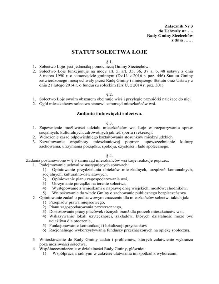 Załącznik Nr 3 do Uchwały nr….. Rady Gminy Sieciechów z dnia …… STATUT SOŁECTWA ŁOJE § 1. 1. Sołectwo Łoje jest jednostką pomocniczą Gminy Sieciechów. 2. Sołectwo Łoje funkcjonuje na mocy art. 5, art. 35, 36, 37 a, b, 48 ustawy z dnia 8 marca 1990 r. o samorządzie gminnym (Dz.U. z 2016 r. poz. 446) Statutu Gminy zatwierdzonego mocą uchwały przez Radę Gminy i niniejszego Statutu oraz Ustawy z dnia 21 lutego 2014 r. o funduszu sołeckim (Dz.U. z 2014 r. poz. 301). § 2. 1. Sołectwo Łoje swoim obszarem obejmuje wieś i przyległe przysiółki należące do niej. 2. Ogół mieszkańców sołectwa stanowi samorząd mieszkańców wsi. Zadania i obowiązki sołectwa. § 3. 1. Zapewnienie możliwości udziału mieszkańców wsi Łoje w rozpatrywaniu spraw socjalnych, kulturalnych, zdrowotnych jak też sportu i rekreacji. 2. Wdrożenie zasad odpowiedniego kształtowania stosunków międzyludzkich. 3. Kształtowanie wspólnoty mieszkaniowej poprzez upowszechnianie kultury zachowania, utrzymania porządku, spokoju, czystości i ładu społecznego. § 4. Zadania postanowione w § 3 samorząd mieszkańców wsi Łoje realizuje poprzez: 1. Podejmowanie uchwał w następujących sprawach: 1) Opiniowanie przydzielania obiektów mieszkalnych, urządzeń komunalnych, socjalnych, kulturalno-oświatowych, 2) Opiniowanie planu zagospodarowania wsi, 3) Utrzymanie porządku na terenie sołectwa, 4) Występowanie z wnioskami o naprawę dróg wiejskich, mostów, chodników, 5) Wnioskowanie do władz Gminy o zachowanie publicznego bezpieczeństwa. 2 Opiniowanie zadań o podstawowym znaczeniu dla mieszkańców sołectw, takich jak: 1) Przepisów prawa miejscowego, 2) Planu zagospodarowania przestrzennego, 3) Dostosowanie pracy placówek różnych branż dla potrzeb mieszkańców wsi, 4) Wskazywanie lokali użyteczności, zakładów, których działalność może być uciążliwa dla otoczenia, 5) Funkcjonowanie komunikacji i lokalizacji przystanków 6) Racjonalnego wykorzystywania funduszy przeznaczonych na opiekę społeczną, 3 4 Wnioskowanie do Rady Gminy zadań i problemów, których załatwienie wykracza poza możliwości sołectwa, Współuczestniczenie w działalności Rady Gminy, głównie: 1) Współpraca z radnymi w zakresie ułatwiania im spotkań z wyborcami, 2) 5 6 7 8 1 2 1 W rozstrzyganiu wydatkowania funduszy sołectwa, przeznaczonych na drogi i inne nieprzewidziane cele, 3) Samorząd mieszkańców przekazuje wnioski i postulaty na piśmie Wójtowi, który zapewnia ich rozpatrzenie w terminie 30 dni od daty otrzymania, 4) W przypadku odmowy bądź zaniechania odpowiedzi, samorząd mieszkańców ma prawo wnieść petycję do Rady Gminy na ręce przewodniczącego Rady. 5) Przewodniczący po zbadaniu sprawy podejmuje interwencję wobec organów gminy bądź jednostki, która powinna ten wniosek lub interpelację zrealizować. 6) W razie bezskuteczności interwencji przewodniczącego, wnosi on sprawę pod obrady Rady Gminy. W rozstrzyganiu i likwidacji sporów i konfliktów sąsiedzkich, w zwalczaniu wandalizmu, pijaństwa, chuligaństwa, narkomanii i zapobieganiu demoralizacji dzieci i młodzieży. Przeprowadzenie w sołectwie akcji mających na celu poprawę stanu sanitarnego, porządku i estetyki wsi. Inicjowanie spotkań z ludźmi z dziedziny nauki i kultury. Organizowanie różnych akcji mających na celu poprawę stanu ochrony przeciwpowodziowej. § 5. Sołectwo zarządza i korzysta z mienia komunalnego oraz rozporządza dochodami pochodzącymi z tego źródła. Sołectwo ma prawo pobierania opłat za korzystanie z tego mienia (dzierżawa, najem, użytkowanie) przez osoby trzecie i przeznaczenia tych dochodów na potrzeby sołectwa. § 6. Nadzór nad działalnością samorządu mieszkańców wsi Łoje sprawuje Rada Gminy a w jej imieniu wójt. 1) Wójt może zawiesić wykonanie uchwały zebrania wiejskiego o ile ta uchwała jest sprzeczna z prawem. Zaś uchwałę w tej samej sprawie może uchylić Rada Gminy podczas najbliższej sesji Rady. 2) Wójt może też zawiesić w prawach sołtysa do czasu rozpatrzenia sprawy przez zebranie wiejskie, jeśli on swoim postępowaniem łamie przepisy prawa, nie wykonuje podstawowych obowiązków. 3) Organy nadzoru gminnego mają prawo dokonywania wizytacji i oceny pracy sołectwa poprzez uczestnictwo w zebraniach organów sołectwa. § 7. Fundusze samorządu mieszkańców wsi Łoje składają się: 1) Z wydzielonych przez Radę Gminy środków finansowych w ramach budżetu gminy – Fundusz Sołecki, 2) Z dobrowolnych wpłat, 3) Ze środków uzyskanych z organizowanych przez samorządy wsi przedsięwzięć i innych składników mienia komunalnego będącego w posiadaniu samorządu wsi, Plan finansowo-rzeczowy samorządu mieszkańców zatwierdza zebranie wiejskie. § 8. Organy samorządu mieszkańców. 1. W skład tych organów wchodzą: 1) Zebranie wiejskie, 2) Sołtys, 3) Rada sołecka. 2. Kadencja organów trwa 4 lata i kończy się w momencie wyborów nowych organów. 3. Pierwsze zebranie wiejskie celem dokonania wyboru sołtysa i rady sołeckiej zwołuje Wójt lub upoważniony przez niego pracownik Urzędu Gminy, nie później niż 6 miesięcy tuż po wyborze Rady Gminy. § 9. 1. Organy samorządu wsi są obowiązane dbać o przestrzeganie zasad samorządności, kolegialności i jawności celów. 2. Sołtys wsi co najmniej raz w roku składa na zebraniu wiejskim sprawozdanie ze swojej działalności. § 10. Działalność organów samorządów ma charakter społeczny. Zebranie wiejskie. 1 2 1 1 2 3 1 § 11. Zebranie wiejskie jest organem uchwałodawczym samorządu mieszkańców wsi. Prawo udziału w zebraniu wiejskim mają wszyscy mieszkańcy sołectwa. § 12. Zebranie wiejskie jest zwoływane przez sołtysa na wniosek: 1) Rady Sołeckiej, 2) Co najmniej 1/5 mieszkańców uprawnionych do głosowania, 3) Wójta W terminie 5 dni od daty zgłoszenia wniosku. § 13. Zebranie wiejskie w I terminie jest ważne, gdy zostali o nim zawiado