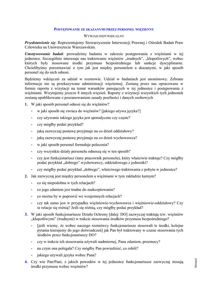 POSTĘPOWANIE ZE SKAZANYMI PRZEZ PERSONEL WIĘZIENNY WYWIAD INDYWIDUALNY Przedstawienie się: Reprezentujemy Stowarzyszenie Interwencji Prawnej i Ośrodek Badań Praw Człowieka na Uniwersytecie Warszawskim. Umotywowanie badań: prowadzimy badania w zakresie postępowania z więźniami w tej jednostce. Szczególnie interesuje nas traktowanie więźniów „trudnych”, „kłopotliwych”, wobec których były stosowane środki przymusu bezpośredniego lub sankcje dyscyplinarne. Chcielibyśmy porozmawiać o tym jak jest między personelem a skazanymi, w jaki sposób personel się do nich odnosi. Będziemy wdzięczni za udział w rozmowie. Udział w badaniach jest anonimowy. Zebrane informacje nie są przekazywane administracji więziennej. Zostaną przez nas opracowane w formie raportu z wizytacji na temat warunków panujących w tej jednostce i postępowania z więźniami. Wizytujemy jeszcze 8 innych więzień. Raporty z wizytacji wszystkich tych jednostek zostaną opublikowane z poszanowaniem zasady poufności i danych osobowych 1. W jaki sposób personel odnosi się do więźniów? - w jaki sposób się zwraca do więźniów? [jakiego używa języka?] - czy używanie takiego języka jest sporadyczne czy częste? - czy mógłby podać przykład? - jaką zazwyczaj postawę przyjmuje na co dzień oddziałowy? - jaką zazwyczaj postawę przyjmuje na co dzień wychowawca? - w jaki sposób personel formułuje polecenia? - czy wszystkie działy personelu odnoszą się w ten sposób? - czy jest funkcjonariusz (inny pracownik personelu), który właściwie traktuje? Czy mógłby podać przykład „dobrego” wychowawcy, oddziałowego z jednostki? - czy mógłby podać przykład „dobrego”, właściwego traktowania z pobytu w jednostce? 2. Jak zazwyczaj jest między personelem a więźniami w tym zakładzie karnym? - co się niepodobna w tych relacjach? - co jego zdaniem jest trudne do zaakceptowania? - co można by w poprawić we wzajemnych relacjach? - czy tak samo jest w przypadku więźniowie-wychowawca i więźniowie-oddziałowy? Czy te relacje się różnią? Jeśli się różnią, czy mógłby podać przykład? - [jeśli wiemy, że wobec naszego rozmówcy funkcjonariusze stosowali te środki, kolejne pytania kierujemy do jego doświadczeń] jak Pan był traktowany w czasie stosowania tych środków przez funkcjonariuszy DO? - czy w trakcie ich stosowania używali nadmiernej, Pana zdaniem, przemocy? - na czym ona polegała? Czy mógłby Pan powiedzieć, co robili? - jakiego używali języka wobec Pana? 4. Czy wie Pan/Pani, z jakich powodów w tej jednostce funkcjonariusze zazwyczaj stosują środki przymusu wobec więźniów? Strona1 3. W jaki sposób funkcjonariusze Działu Ochrony [dalej: DO] zazwyczaj traktują tzw. więźniów „kłopotliwymi” (trudnymi) w trakcie stosowania środków przymusu bezpośredniego? - czy wie z jakich powodów zastosowali te środki wobec niego? - czy mógłby podać przykład najczęstszych jego zdaniem powodów? 5. Czy wie Pan/Pani, z jakich powodów w tej jednostce funkcjonariusze zazwyczaj stosują celę zabezpieczającą? - czy wie z jakich powodów zastosowali celę wobec niego? - czy mógłby podać przykład najczęstszych jego zdaniem powodów? 6. Czy słyszał Pan o nieprawidłowościach przy stosowaniu celi zabezpieczającej lub innego środka przymusu bezpośredniego ze strony personelu w tej jednostce? - o jakich np. nieprawidłowościach słyszał? Czy mógłby podać przykład? - [jeśli wiemy, że wobec naszego rozmówcy funkcjonariusze stosowali te celę, kolejne pytania kierujemy do jego doświadczeń] czy podczas stosowania celi wobec Pana były jakieś nieprawidłowości? - jakie na przykład? Na czym polegały? Czy mógłby podać przykład? 7. Czy więźniowie, wobec których stosowano środki przymusu w tej jednostce ponoszą jakieś dalsze konsekwencje? - czy po zakończeniu stosowania środka są karani dyscyplinarnie? - jaką karę zazwyczaj dostają? - czy personel stosuje wobec nich „nieformalne” sankcje, dolegliwości? Jakie? - [jeśli wiemy, że wobec naszego rozmówcy f-sze stosowali te środki, kolejne pytania kierujemy do jego doświadczeń] czy przeciwko Panu było prowadzone postępowanie dyscyplinarne? - jak się skończyło? Czy dostał karę? Jaką? - czy personel stosował wobec niego „nieformalne” sankcje, dolegliwości? Jakie? 8. [pytanie zadajemy jeśli rozmówca powiedział że przy stosowaniu środków były nieprawidłowości] Czy zdarzyło się tak, że funkcjonariusze którzy dopuścili się nieprawidłowości przy stosowaniu środków zabezpieczających ponieśli jakieś konsekwencje? czy było prowadzone przeciwko nim postępowanie wyjaśniające? - jak się skończyło? - czy było prowadzone przeciwko nim postępowanie karne? - jak się skończyło? - czy były stosowane wobec nich jakieś nieformalne kary, nagany? Przez kogo? Proszę podać przykład? [Jeśli ankieter ustali, że jego respondent przebywał w celi zabezpieczającej lub wobec którego zastosowano inny środek przymusu w tej jednostce, zadajemy pytania nr 9-11] Czy był Pan/Pani badany/a na początku i w trakcie pobytu w celi zabezpieczającej lub stosowania innego środka? - czy badanie było szczegółowe tak jak Pan tego oczekiwał? - czy lekarz ustalił obrażenia? - czy wysłuchał Pana opisu zdarzenia? - czy lekarz zapisał to oświadczenie (tzn. opis zdarzenia) w dokumentacji medycznej? Strona2 9. - - czy mógł się Pan z nią zapoznać w trakcie badania i po nim? 10. [j.w.] Co się działo po zakończeniu stosowania celi wobec Pana? - czy przeciwko Panu było prowadzone postępowanie dyscyplinarne? - jak się skończyło? Czy dostał karę? Jaką? - czy personel stosował wobec niego „nieformalne” sankcje, dolegliwości? Jakie? 11. [j.w. i pytamy tylko gdy więzień mówił o nieprawidłowościach] Powiedział Pan wcześniej, że przy stosowaniu środków przymusu były nieprawidłowości, czy w związku z tym wni