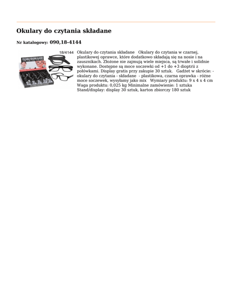 Okulary do czytania składane Nr katalogowy: 090,18-4144 Okulary do czytania składane Okulary do czytania w czarnej, plastikowej oprawce, które dodatkowo składają się na nosie i na zausznikach. Złożone nie zajmują wiele miejsca, są trwałe i solidnie wykonane. Dostępne są moce soczewki od +1 do +3 dioptrii z połówkami. Display gratis przy zakupie 30 sztuk. Gadżet w skrócie: okulary do czytania - składane - plastikowa, czarna oprawka - różne moce soczewek, wysyłamy jako mix Wymiary produktu: 9 x 4 x 4 cm Waga produktu: 0,025 kg Minimalne zamówienie: 1 sztuka Stand/display: display 30 sztuk, karton zbiorczy 180 sztuk