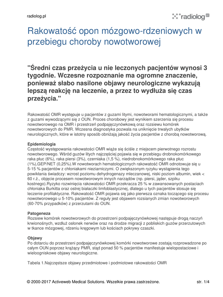 radiolog.pl Rakowatość opon mózgowo-rdzeniowych w przebiegu choroby nowotworowej "Średni czas przeżycia u nie leczonych pacjentów wynosi 3 tygodnie. Wczesne rozpoznanie ma ogromne znaczenie, ponieważ słabo nasilone objawy neurologiczne wykazują lepszą reakcję na leczenie, a przez to wydłuża się czas przeżycia." Rakowatość OMR występuje u pacjentów z guzami litymi, nowotworami hematologicznymi, a także z guzami wywodzącymi się z OUN. Proces chorobowy jest wynikiem szerzenia się procesu nowotworowego na OMR i przestrzeń podpajęczynówkową oraz rozsiewu komórek nowotworowych do PMR. Wczesna diagnostyka pozwala na uniknięcie trwałych ubytków neurologicznych, które w istotny sposób obniżają jakość życia pacjentów z chorobą nowotworową. Epidemiologia Częstość występowania rakowatości OMR wiąże się ściśle z miejscem pierwotnego rozrostu nowotworowego. Wśród guzów litych najczęściej pojawia się w przebiegu drobnokomórkowego raka płuc (6%), raka piersi (3%), czerniaka (1,5 %), niedrobnokomórkowego raka płuc (1%),GEP/NET (0,25%).W nowotworach hematologicznych rakowatość OMR odnotowuje się u 5-15 % pacjentów z chłoniakami nieziarniczymi. O zwiększonym ryzyku wystąpienia tego powikłania świadczy: wzrost poziomu dehydrogenazy mleczanowej, niski poziom albumin, wiek < 60 r.ż., objęcie procesem nowotworowym innych narządów (np. piersi, jąder, szpiku kostnego).Ryzyko rozwinięcia rakowatości OMR przekracza 25 % w zawansowanych postaciach chłoniaka Burkitta oraz ostrej białaczki limfoblastycznej, dlatego u tych pacjentów stosuje się leczenie profilaktyczne. Rakowatość OMR pojawia się jako pierwsza oznaka toczącego się procesu nowotworowego u 5-10% pacjentów. Z reguły jest objawem rozsianych zmian nowotworowych (60-70% przypadków) z przerzutami do OUN. Patogeneza Rozsiew komórek nowotworowych do przestrzeni podpajęczynówkowej następuje drogą naczyń krwionośnych, wzdłuż osłonek nerwów oraz na drodze migracji z pobliskich guzów przerzutowych w tkance mózgowej, rdzeniu kręgowym lub kościach pokrywy czaszki. Objawy Po dotarciu do przestrzeni podpajęczynówkowej komórki nowotworowe zostają rozprowadzone po całym OUN poprzez krążący PMR, stąd ponad 50 % pacjentów manifestuje wielopostaciowe i wieloogniskowe objawy neurologiczne. Tabela 1.Najczęstsze objawy przedmiotowe i podmiotowe rakowatości OMR © 2000-2017 Activeweb Medical Solutions. Wszelkie prawa zastrzeżone. str. 1/4 radiolog.pl Diagnostyka "Zmiany w cytologii PMR występujące w rakowatości OMR to: pleocytoza ok. 63% pacjentów z guzami litymi i 57% z nowotworami hematologicznymi, podniesiony poziom białka 50 mg/dl, obniżony poziom glukozy tj. poniżej 60 mg/dl. Niekiedy przydatne bywa oznaczenie markerów nowotworowych - CEA, ludzka gonadotropina kosmówkowa, alfafetoproteina, dehydrogenaza mleczanowa" Badanie MRI w diagnostyce rakowatości OMR powinno obejmować zarówno mózg, jak i rdzeń kręgowy. Wzmocnienie OMR może mieć charakter zlokalizowany lub rozlany. W obrazie rdzenia kręgowego wzmocnione węzły chłonne w przestrzeni podpajęczynówkowej są dość częstym znaleziskiem, zwłaszcza w obszarze ogona końskiego. Badanie MRI pozwala na rozpoznanie rakowatości OMR u 59 % pacjentów, choć powyższe objawy są niespecyficzne i powinny być rozpatrywane z uwzględnieniem obrazu klinicznego. Zaburzenia przepływu PMR występują w 31-61% przypadków rakowatości OMR. Oceny można dokonać poprzez dokomorowe lub dolędźwiowe podanie DTPA znakowanego Jodem-111 lub Technetem-99. Metoda ta nie jest jednak powszechnie stosowana w większości ośrodków © 2000-2017 Activeweb Medical Solutions. Wszelkie prawa zastrzeżone. str. 2/4 radiolog.pl leczniczych. U każdego pacjenta z podejrzeniem rakowatości OMR w przebiegu choroby nowotworowej powinno zostać wykonane nakłucie lędźwiowe. Komórki nowotworowe są bowiem wykrywane w 70-89% przypadków. U 50 % pacjentów istnieje konieczność ponownego wykonania nakłucia lędźwiowego, gdyż obecność komórek nowotworowych jest ściśle zależna od przepływu PMR. Powtórne pobranie PMR zwiększa prawdopodobieństwo wykrycia krążących komórek nowotworowych o 25 %. Zmiany w cytologii PMR występujące w rakowatości OMR to: pleocytoza (ok. 63% pacjentów z guzami litymi i 57% z nowotworami hematologicznymi), podniesiony poziom białka (50 mg/dl), obniżony poziom glukozy (Biopsja OMR jest rzadkim sposobem potwierdzenia diagnozy u pacjentów z podejrzeniem rakowatości OMR i zmianami w MRI, ale bez odchyleń w badaniu PMR. U 25 % pacjentów z potwierdzoną chorobą nowotworową rozpoznanie stawiane jest wyłącznie na podstawie obrazu klinicznego. Rokowanie i terapia Celem terapii rakowatości OMR jest wydłużenie przeżycia i stabilizacja lub poprawa objawów neurologicznych. Średni czas przeżycia u nie leczonych pacjentów wynosi 3 tygodnie. Wczesne rozpoznanie ma ogromne znaczenie, ponieważ słabo nasilone objawy neurologiczne wykazują lepszą reakcję na leczenie, a przez to wydłuża się czas przeżycia. Tabela 2.Czynniki prognostyczne w rakowatości OMR. Najczęstszymi przyczynami zgonów wśród pacjentów z rakowatością OMR jest progresja pierwotnej choroby nowotworowej (10-64 %), progresja choroby w OUN (15-82 %), toksyczność leczenia (ok. 9 %), choroby towarzyszące (0-29 %). Drenaż komorowo-otrzewnowy PMR jest efektywnym sposobem paliatywnego leczenia wodogłowia w przebiegu rakowatości OMR. Wytworzenie zbiornika Ommaya ułatwia dokomorowe podawanie chemioterapii i pobieranie PMR do badań cytologicznych. Powikłania występują u 17% pacjentów, najczęściej są to zakażenia zbiornika, nieprawidłowa implantacja końcówki cewnika lub wada samego zbiornika. Radioterapia w polu, choć nie prowadzi do wydłużenia przeżycia, jest terapią z wyboru u pacjentów z blokiem odpływu PMR (skuteczność 50% w mózgowym bloku odpływu, 35% w rdzeniowym bloku 