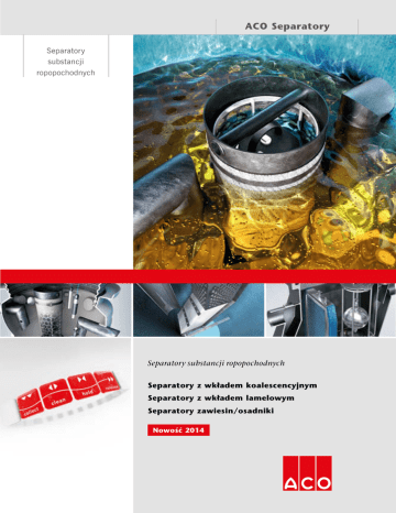 Separatory substancji ropopochodnych ACO Separatory Separatory substancji ropopochodnych Separatory substancji ropopochodnych Separatory z wkładem koalescencyjnym Separatory z wkładem lamelowym Separatory zawiesin/osadniki Nowość 2014 1 Separatory substancji ropopochodnych Separatory substancji ropopochodnych Dlaczego kluczowe jest obecnie zrównoważone zarządzanie wodami powierzchniowymi? 40% 30% 10% 55% ewapotranspiracja ewapotranspiracja spływanie 25% płytkie rozsączanie spływanie Podłoże naturalne Nawierzchnia 10% płytkie rozsączanie 25% 5% głębokie rozsączanie głębokie rozsączanie W wyniku gwałtownej urbanizacji naturalna cyrkulacja wodna została drastycznie zaburzona. W środowisku niezurbanizowanym 50% opadów wsiąka w grunt, a około 10% pozostaje na powierzchni. zbieranie podczyszczanie retencja i infiltracja wody deszczowej Czym powinien charakteryzować się dobrze zaprojektowany system zbierania wody deszczowej? Czym powinien charakteryzować się dobrze zaprojektowany system podczyszczania wody deszczowej? Czym powinien charakteryzować się dobrze zaprojektowany system magazynowania i uwalniania wody deszczowej? Obliczeniami hydraulicznymi dla danej zlewni Obliczeniami hydraulicznymi dotyczącymi podczyszczania wody Obliczeniami hydraulicznymi dla obszaru Prawidłowo zdefiniowaną klasą obciążenia zgodną Zgodnością z EN 858 lub innymi specyfikacjami technicznymi Stabilnością statyczną systemu Prostą i bezpieczną konserwacją Prostą konserwacją i nadzorem z obszarem zastosowania Gwarancją bezpieczeństwa Zgodnością z PN-EN 1433 (jeśli stosujemy odwodnienie liniowe) W wysoko zurbanizowanych obszarach 55% wody deszczowej pozostaje na powierzchni, a jedynie 15% wsiąka w grunt, jako że nawierzchnie utwardzone uniemożliwiają wsiąkanie wody. Kiedy należy stosować systemy odwodnień? Zasoby wodne zmniejszają się, a jednocześnie ich jakość spada, co oddziałuje zarówno na ludzi, jak i środowisko naturalne. Zawsze, gdy mamy do czynienia z powierzchniami utwardzonymi, uniemożliwiającymi naturalne wchłanianie wody, tj: kostką brukową projektowanie pomoc techniczna opieka Informowanie i edukowanie Planowanie i optymalizacja Pomoc techniczna i wsparcie na miejscu Obsługa posprzedażowa parkingi i obszary oddane do ruchu drogowego Wody powierzchniowe z parkingów, stacji benzynowych i innych powierzchniami betonowymi. szkolenie Zawsze na obszarach zagrożonych wyciekiem substancji ropopochodnych do wód powierzchniowych lub skażeniem cząsteczkami metali ciężkich, m.in. są to: stacje benzynowe i myjnie samochodowe. powierzchniami asfaltowymi Doskonałość rozwiązań produktowych ACO jest dodatkowo wspierana przez obsługę systemową Kiedy należy podczyszczać wodę? obszarów ruchu drogowego zawierają, w różnym stężeniu, substancje Kiedy należy zatrzymywać i/lub uwalniać wodę? Zawsze w przypadku ograniczonego odpływu i/lub chęci ponownego wykorzystania wody.Wytyczne dotyczące konieczności zastosowania systemów regulujących i rozsączających wodę powierzchniową: brak lub ograniczenie możliwości podłączenia odpływu do systemu kanalizacji deszczowej konieczność regulacji i kontroli przepływu Woda deszczowa gromadzi się na powierzchni pod wpływem ropopochodne, które mogą stanowić potencjalne zagrożenie ulewnych deszczów oraz topniejących śniegów. w przypadku zgromadzenia ich w systemie kanalizacyjnym. Z drugiej Aby nie powodować zniszczeń, konieczne jest jej szybkie strony, jeżeli substancje te zostaną uwolnione do środowiska Zagrożenie powodziami wzrasta w ostatnich latach ze względu na przetransportowanie z terenów narażonych na niepożądane naturalnego, stanowić będą zagrożenie dla gleby, wód podziemnych coraz częstsze i coraz bardziej dynamiczne opady nawalne. działanie wody. Systemy odwadniające gwarantują oraz środowiska. Zebrana woda powierzchniowa podczyszczana jest Z przyczyn ekonomicznych i technicznych istniejąca kanalizacja bezpieczeństwo, wygodę ludzi oraz ochronę budynków i dróg w celu zapobiegania przedostawaniu się tych niebezpiecznych cieczy deszczowa zaprojektowana jest tak, by była w stanie odprowadzać przed zniszczeniem wynikającym z zalegania wody. ACO oferuje do systemu kanalizacyjnego lub uwalnianiu ich do środowiska często niewielkie ilości opadów deszczu. Stąd szybkie zapełnianie się szeroki zakres systemów odwadniających zaprojektowanych naturalnego. ACO oferuje szereg separatorów substancji kanalizacji deszczowej w czasie trwającego dłuższy czas deszczu zgodnie ze szczególnymi wymaganiami projektu w celu ropopochodnych wykonanych na zbiornikach żelbetowych, nawalnego, powodujące szkody i zagrożenie na drogach uzyskania optymalnego działania. tworzywowych lub żeliwnych zaprojektowanych w taki sposób, i w budynkach. Innowacyjne systemy ACO gwarantują, że woda by spełniały wymagania danego projektu. pozostaje wewnątrz systemu, skąd może być odpowiednio chęć ponownego użycia zmagazynowanej wody. uwalniana. Zarządzanie wodami powierzchniowymi w tym obszarze zwiększa ochronę i bezpieczeństwo w sytuacjach ekstremalnych, umożliwiając jednocześnie ponowne użycie zasobów wody. ACO. Przyszłość odwodnień. ACO Qmax kanały odwadniające o dużej pojemności magazynowej 2 ACO Monoblock kanały odwadniające o konstrukcji monolitycznej Oleopator-C-FST separator substancji ropopochodnych zintegrowany z osadnikiem ACO Coalisator L żelbetowy separator substancji ropopochodnych z wkładem lamelowym ACO Stormbrixx system retencji i rozsączania ACO QBrake regulator przepływu 3 Separatory substancji ropopochodnych Separatory substancji ropopochodnych LOTNISKA AUTOSTRADY PARKINGI STACJE PALIW DROGI Spis treści Wstęp 6 Zastosowania 7 Separatory z wkładem koalescencyjnym 10 WOLNOSTOJĄCE z tworzywa sztucznego (PEHD) 12 DO ZABUDOWY W GRUNCIE z tworzywa sztucznego (PEHD) 20 DO ZABUDOWY W GRUNCIE z żeliwa 26 DO 