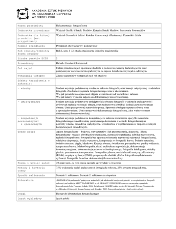Nazwa przedmiotu Dokumentacja fotograficzna Jednostka prowadząca Wydział Grafiki i Sztuki Mediów, Katedra Sztuki Mediów, Pracownia Fotomediów Jednostka dla której przedmiot jest przygotowany Wydział Ceramiki i Szkła / Katedra Konserwacji i Restauracji Ceramiki i Szkła Rodzaj przedmiotu Przedmiot obowiązkowy, podstawowy Rok studiów/semestr; forma studiów Rok I, sem. 1 i 2; studia stacjonarne jednolite magisterskie Liczba punktów ECTS 2 Prowadzący Dr hab. Czesław Chwiszczuk Cel zajęć Celem przedmiotu jest zpoznanie studenta z postawową wiedzą technologiczną oraz praktycznym warsztatem fotograficznym, w zapisie fotochemicznym jak i cyfrowym. Wymagania wstępne Zdanie egzaminów wstepnych na I rok studiów. Efekty kształcenia w zakresie: – wiedzy Student uzyskuje podstawową wiedzę w zakresie fotografii, oraz kreacji artystycznej z udziałem fotografii. Zna budowę aparatu fotograficznego wraz z akcesoriami. Wie jak prawidłowo opracować zdjęcie w zależności od warunków i zaleceń. Wie jak należy wykonać zdjęcia do dokumentacji konserwatorskiej. – umiejętności Student uzyskuje podstawowe umiejętności z obszaru fotografii w zakresie analogowych i cyfrowych technik rejestracji obrazu, oraz podstawowej obróbki i edycji zarejestrowanego obrazu. Umie przygotować stanowisko pracy. Sprawnie obsługuje aparat cyfrowy wraz z oprzyżądowaniem. Umie opracować dokumentacje fotograficzną, jako ważny element dokumentacji konserwatorskiej. – kompetencji personalnych i społecznych Student uzyskuje podstawowe kompetencje w zakresie rozumienia specyfiki warsztatu fotograficznego z możliwością praktycznego korzstania z techniki fotograficznej na potrzeby własne, zawodowe i artystyczne. Uczstnictwa i współdziałania w zespole o różnych kompetencjach zawodowych. Treść zajęć Aparat fotograficzny - budowa, typy aparatów i ich przeznaczenie, akcesoria. Błony fotograficzne- rodzaje, obróbka fotochemiczna, ciemnia fotograficzna, odbitka pozytywowa, techniki fotograficzne. Fotografia bez aparatu,wykonanie poprawnej rejestracji fotograficznej, właściwa ekspozycja, środki wyrazowe, kompozycja w fotografii, barwa. Światło naturalne, światło sztuczne, ciągłe, błyskowe. Kreacja obrazu, światłocień, perespektywa, punkty widzenia, temperatura barwy. Makrofotografia, detal, architektura reprodukcja, dokumentacja inwentaryzacyjana, dokumentacja procesu technologicznego, fotografia katalogowa, obiekty płaskie, przestrzenne,transparentne. Fotografia cyfrowa, rozdzielczość matrycy, plik otwarty (RAW), negatyw cyfrowy (DNG), programy do obróbki plików fotograficznych (ciemnia cyfrowa). Fotografia do celów dokumentacji konserwatorskiej. Forma i wymiar zajęć 30 godz./sem., w tym czasie zawarte są: wykłady i ćwiczenia Metody i kryteria oceny 75% wykonanie zadań praktycznych /przeglądy robocze, 25% otwarty przegląd prac. Sposób zaliczenia Semestr 1: zaliczenie, Semestr 2: zaliczenie ze stopniem Literatura „FOTOGRAFIA podręcznik" praktyczne wskazówki jak udoskonalić swoje umiejętności z uwzględnieniem fotografii cyfrowej, pod redakcją ALISY McWHINNIE, wyd. ARKADY, FOTOGRAFIA nowy wyczerpujący poradnik fotografowania John Freeman, Arkady 2006, Świadomość KADRU szkice z estetyki fotografii Zbigiew Tomaszczuk, wyd.Kropka, O fotografii Sousan Sontag wyd. Karakter 2009, Fotografia zabytków i dzieł sztuki, Arkady. Uwagi Dostęp do laboratorium fotograficznego Język wykładowy Język polski