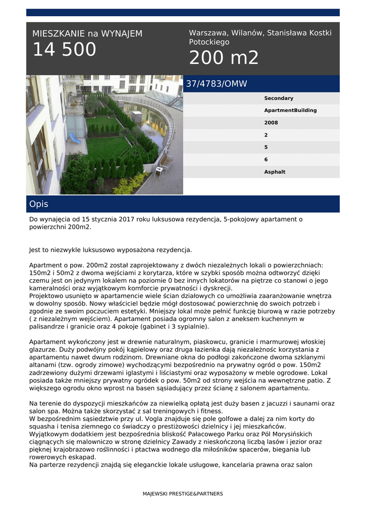 MIESZKANIE na WYNAJEM 14 500 Warszawa, Wilanów, Stanisława Kostki Potockiego 200 m2 37/4783/OMW Secondary ApartmentBuilding 2008 2 5 6 Asphalt Opis Do wynajęcia od 15 stycznia 2017 roku luksusowa rezydencja, 5-pokojowy apartament o powierzchni 200m2. Jest to niezwykle luksusowo wyposażona rezydencja. Apartment o pow. 200m2 został zaprojektowany z dwóch niezależnych lokali o powierzchniach: 150m2 i 50m2 z dwoma wejściami z korytarza, które w szybki sposób można odtworzyć dzięki czemu jest on jedynym lokalem na poziomie 0 bez innych lokatorów na piętrze co stanowi o jego kameralności oraz wyjątkowym komforcie prywatności i dyskrecji. Projektowo usunięto w apartamencie wiele ścian działowych co umożliwia zaaranżowanie wnętrza w dowolny sposób. Nowy właściciel będzie mógł dostosować powierzchnię do swoich potrzeb i zgodnie ze swoim poczuciem estetyki. Mniejszy lokal może pełnić funkcję biurową w razie potrzeby ( z niezależnym wejściem). Apartament posiada ogromny salon z aneksem kuchennym w palisandrze i granicie oraz 4 pokoje (gabinet i 3 sypialnie). Apartament wykończony jest w drewnie naturalnym, piaskowcu, granicie i marmurowej włoskiej glazurze. Duży podwójny pokój kąpielowy oraz druga łazienka dają niezależnośc korzystania z apartamentu nawet dwum rodzinom. Drewniane okna do podłogi zakończone dwoma szklanymi altanami (tzw. ogrody zimowe) wychodzącymi bezpośrednio na prywatny ogród o pow. 150m2 zadrzewiony dużymi drzewami iglastymi i liściastymi oraz wyposażony w meble ogrodowe. Lokal posiada także mniejszy prywatny ogródek o pow. 50m2 od strony wejścia na wewnętrzne patio. Z większego ogrodu okno wprost na basen sąsiadujący przez ścianę z salonem apartamentu. Na terenie do dyspozycji mieszkańców za niewielką opłatą jest duży basen z jacuzzi i saunami oraz salon spa. Można także skorzystać z sal treningowych i fitness. W bezpośrednim sąsiedztwie przy ul. Vogla znajduje się pole golfowe a dalej za nim korty do squasha i tenisa ziemnego co świadczy o prestiżowości dzielnicy i jej mieszkańców. Wyjątkowym dodatkiem jest bezpośrednia bliskość Pałacowego Parku oraz Pól Morysińskich ciągnących się malowniczo w stronę dzielnicy Zawady z nieskończoną liczbą lasów i jezior oraz pięknej krajobrazowo roślinności i ptactwa wodnego dla miłośników spacerów, biegania lub rowerowych eskapad. Na parterze rezydencji znajdą się eleganckie lokale usługowe, kancelaria prawna oraz salon MAJEWSKI PRESTIGE&PARTNERS stomatologii estetycznej. Ten luksusowy Lokalizacja zdecydowanie dla lubiących ciszę i spokój po całym dniu w zgiełku niedalekiego centrum - dojazd z Dworca Centralnego 15 min. a z Lotniska Chopina ok. 20 min. Jednocześnie usytuowanie nieruchomości w niedalekiem sąsiedztwie od Miasteczka Wilanów (po drugiej stronie trasy na Konstancin) czyni je dostępnym do wielu ekskluzywnych restauracji, barów i butików oraz amerykańskiej szkoły podstawowej Konstancja. Budynek jest architektoniczną perełką z XIX wieku stanowiącą częściowo dawne zabudowania przypałacowe tzw. folwark królewski oddalony o zaledwie 600m od Pałacu Królewskiego w Wilanowie przy ulicy Stanisława Kostki Potockiego - stąd nazwa nieruchomości : Rezydencja Królewska (inwestycja nagrodzona tytułem Budowa Roku przez prestiżowe Stwowarzyszenie architektów i projektantów Polskich). Jego fasadę zdobią sztukaterie w przedwojennym stylu z zachowanym przez stołecznego konserwatora zabytków oryginalnym herbem na głównej nawie budynku będącego wówczas manufakturą marmolady. Na kanwie głównej nieruchomości dobudowano w 2008 roku nowe luksusowe apartamenty będące kompozycją nowoczesności i tradycji w jeden harmonijny i niepowtarzalny sposób - jest to jedyna w stolicy nieruchomość z prawdziwie królewskim rodowodem. Wnętrza są zbudowane z marmuru i onyksu, a balustrady i wiele detali z żeliwa, stali i szkła oraz na zewnątrz elementów z surowego betonu przywołującego ich industrialny charakter. Oczka wodne i oryginalna roślinność dopełniają luksusowego charakteru wewnętrznemu patio z monitoringiem i ochroną concierge 24h. Opłaty: - czynsz miesięczny 14500 zł (2 miejsca w garażu podziemnym stanowią nieodpłatnie część oferty najmu apartamentu). Wymagana kaucja w wysokości jednomiesięcznej kwoty najmu. Możliwość oglądania z 3-dniowym wyprzedzeniem. Bardzo polecam, zapraszam do kontaktu Artur Majewski, tel.792 92 92 35, e-mail: [email protected] Artur Sebastian Majewski tel. 792929235 tel. 501585958 email: [email protected] MAJEWSKI PRESTIGE&PARTNERS Powered by TCPDF (www.tcpdf.org)