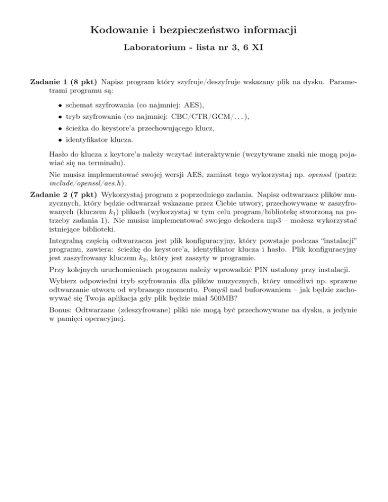 Kodowanie i bezpieczeństwo informacji Laboratorium - lista nr 3, 6 XI Zadanie 1 (8 pkt) Napisz program który szyfruje/deszyfruje wskazany plik na dysku. Parametrami programu są: • schemat szyfrowania (co najmniej: AES), • tryb szyfrowania (co najmniej: CBC/CTR/GCM/. . . ), • ścieżka do keystore’a przechowującego klucz, • identyfikator klucza. Hasło do klucza z keytore’a należy wczytać interaktywnie (wczytywane znaki nie mogą pojawiać się na terminalu). Nie musisz implementować swojej wersji AES, zamiast tego wykorzystaj np. openssl (patrz: include/openssl/aes.h). Zadanie 2 (7 pkt) Wykorzystaj program z poprzedniego zadania. Napisz odtwarzacz plików muzycznych, który będzie odtwarzał wskazane przez Ciebie utwory, przechowywane w zaszyfrowanych (kluczem k1 ) plikach (wykorzystaj w tym celu program/bibliotekę stworzoną na potrzeby zadania 1). Nie musisz implementować swojego dekodera mp3 – możesz wykorzystać istniejące biblioteki. Integralną częścią odtwarzacza jest plik konfiguracyjny, który powstaje podczas “instalacji” programu, zawiera: ścieżkę do keystore’a, identyfikator klucza i hasło. Plik konfiguracyjny jest zaszyfrowany kluczem k2 , który jest zaszyty w programie. Przy kolejnych uruchomieniach programu należy wprowadzić PIN ustalony przy instalacji. Wybierz odpowiedni tryb szyfrowania dla plików muzycznych, który umożliwi np. sprawne odtwarzanie utworu od wybranego momentu. Pomyśl nad buforowaniem – jak będzie zachowywać się Twoja aplikacja gdy plik będzie miał 500MB? Bonus: Odtwarzane (zdeszyfrowane) pliki nie mogą być przechowywane na dysku, a jedynie w pamięci operacyjnej.